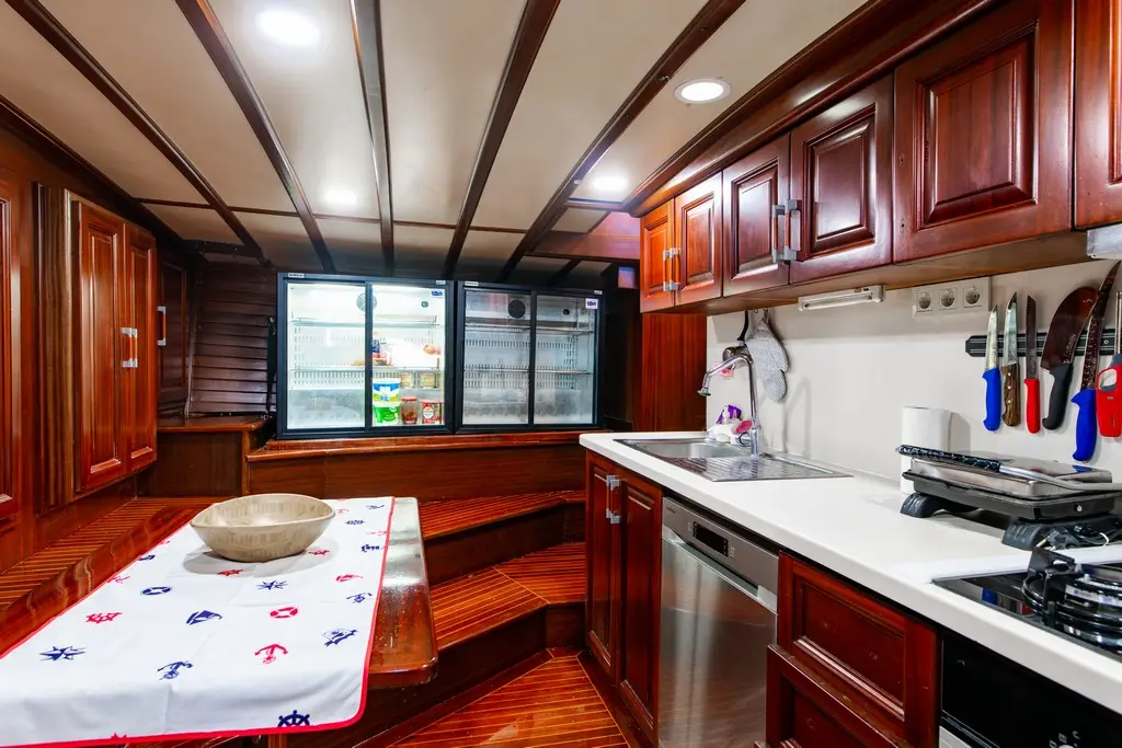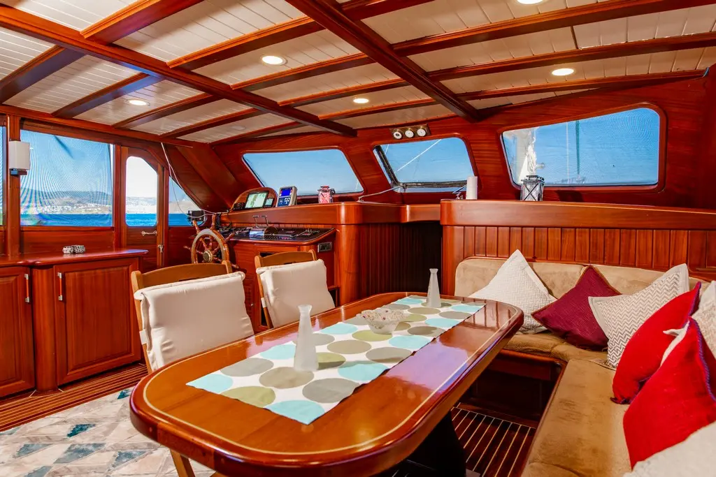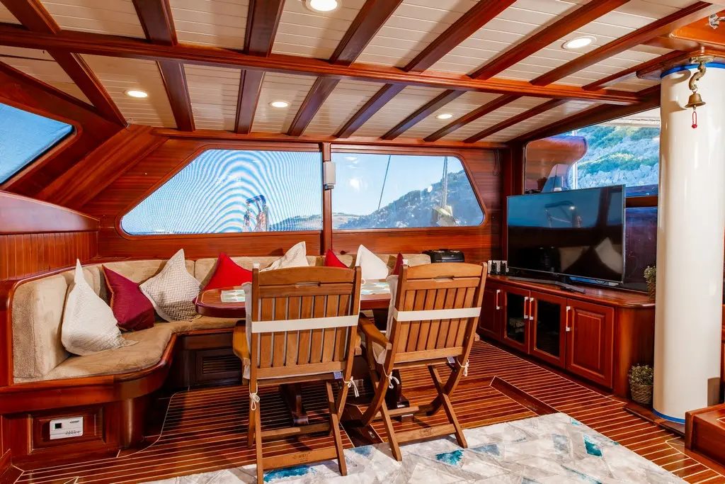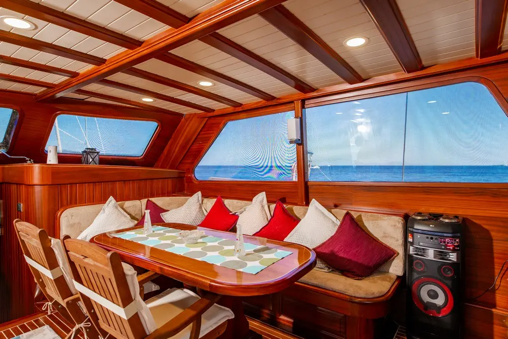 The indoor restaurant and saloon of Sunrise II serve as the social hub of the gulet. Here, guests can savor exquisite cuisine, enjoy entertainment from the TV and music system, or simply relax and soak in the panoramic views of Bodrum’s captivating landscape.