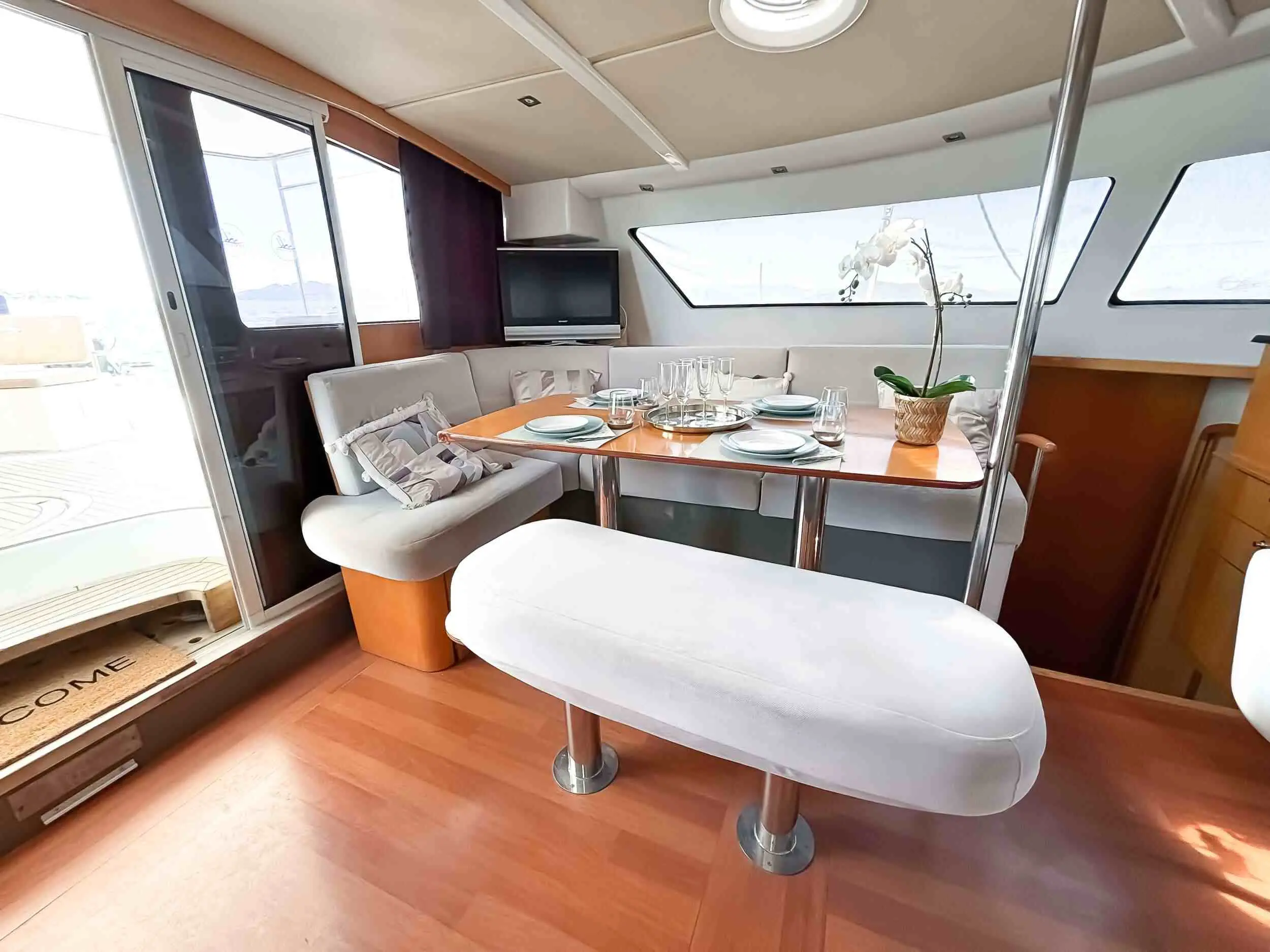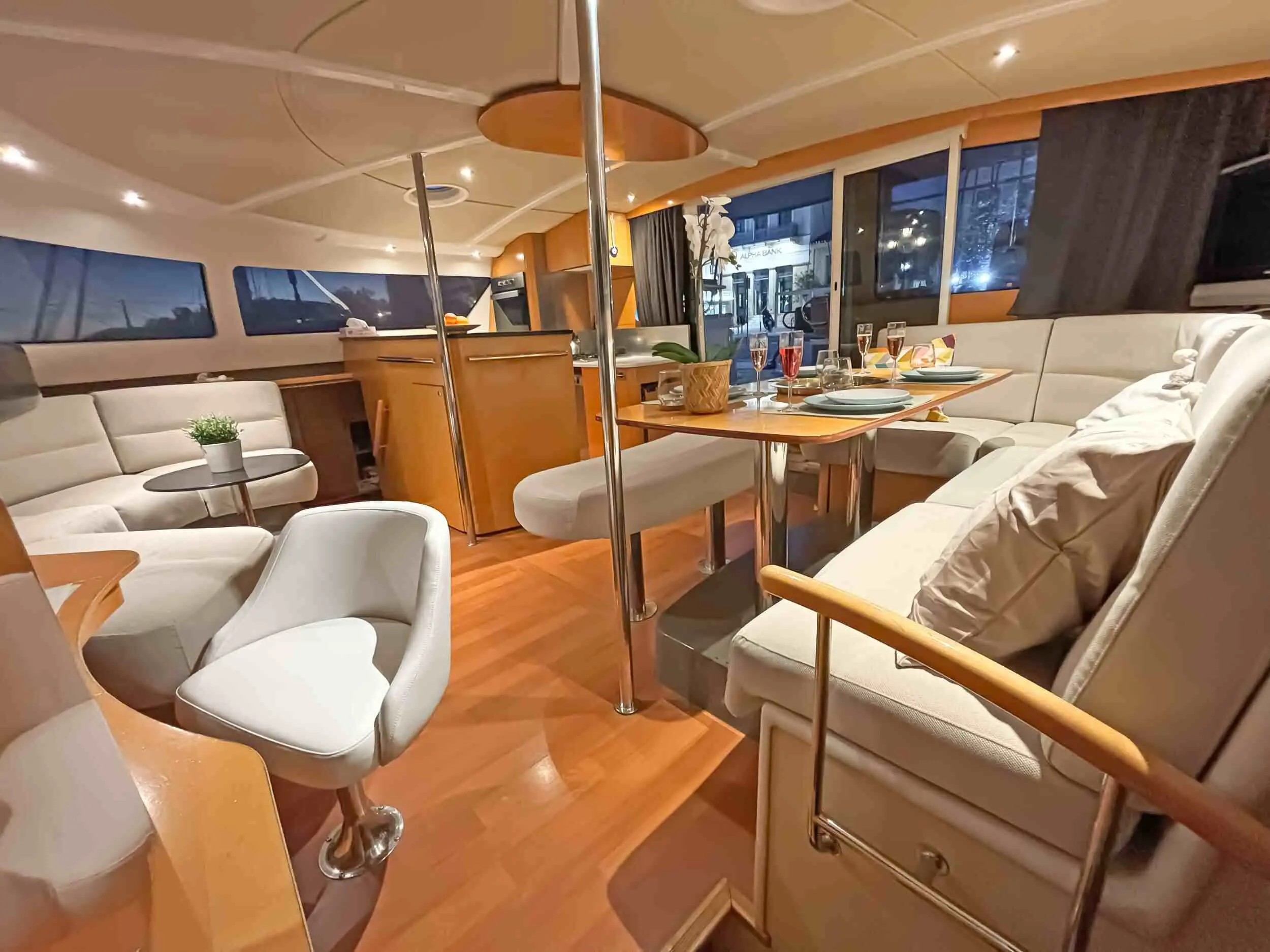 The Zorba's layout is meticulously designed for both functionality and luxury. Its wide beam offers stability and extra living space, making it ideal for families or groups. The sleek lines and modern interiors exude sophistication, while the open-plan living areas and expansive windows create a seamless indoor-outdoor flow.