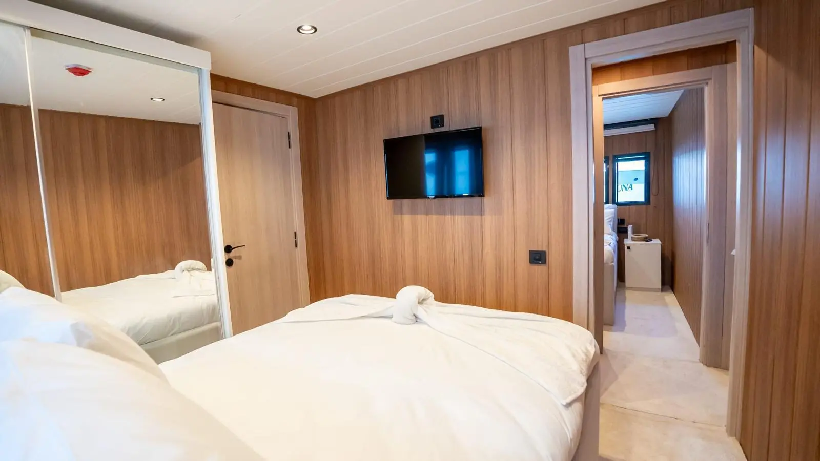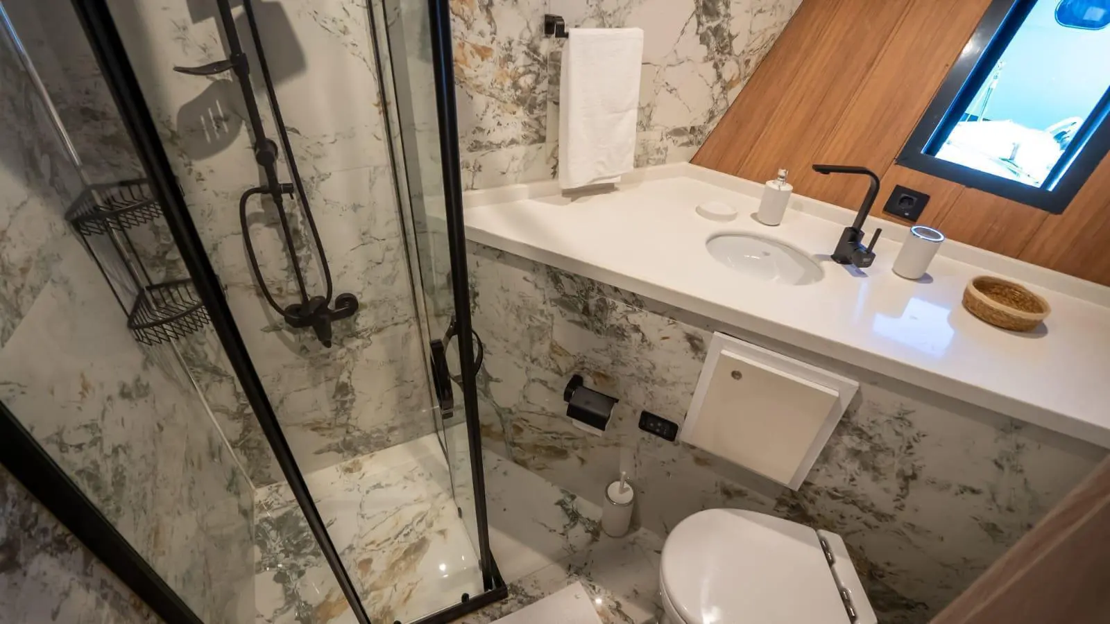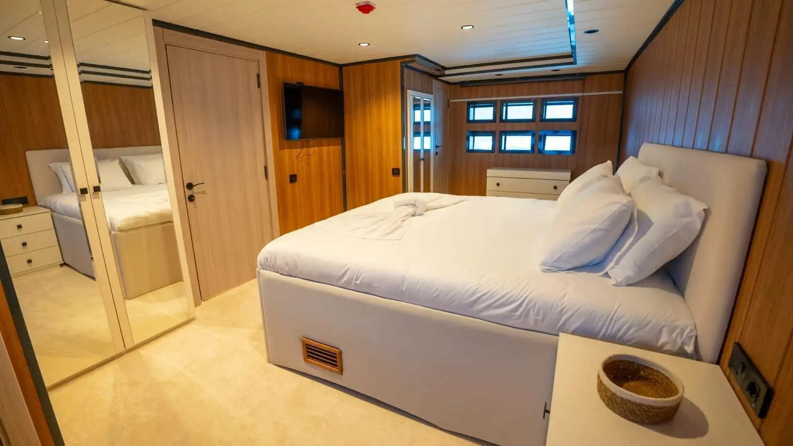 Almila offers a beautifully designed interior with five spacious cabins, accommodating up to 11 guests comfortably. Each cabin is equipped with full air conditioning, modern bathrooms featuring shower boxes, and electric toilets. This configuration is ideal for charter groups looking for comfort and privacy.