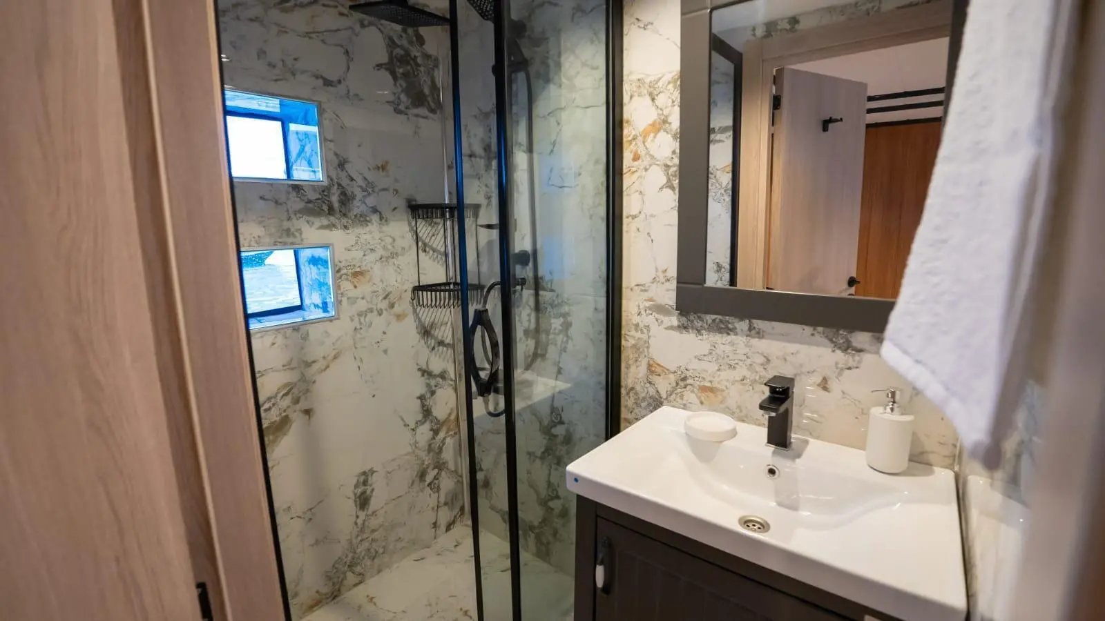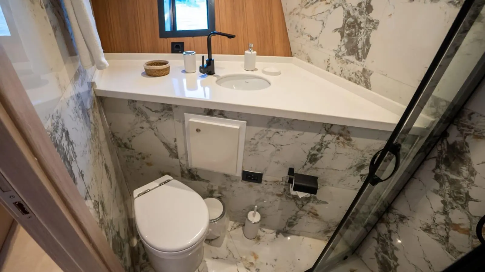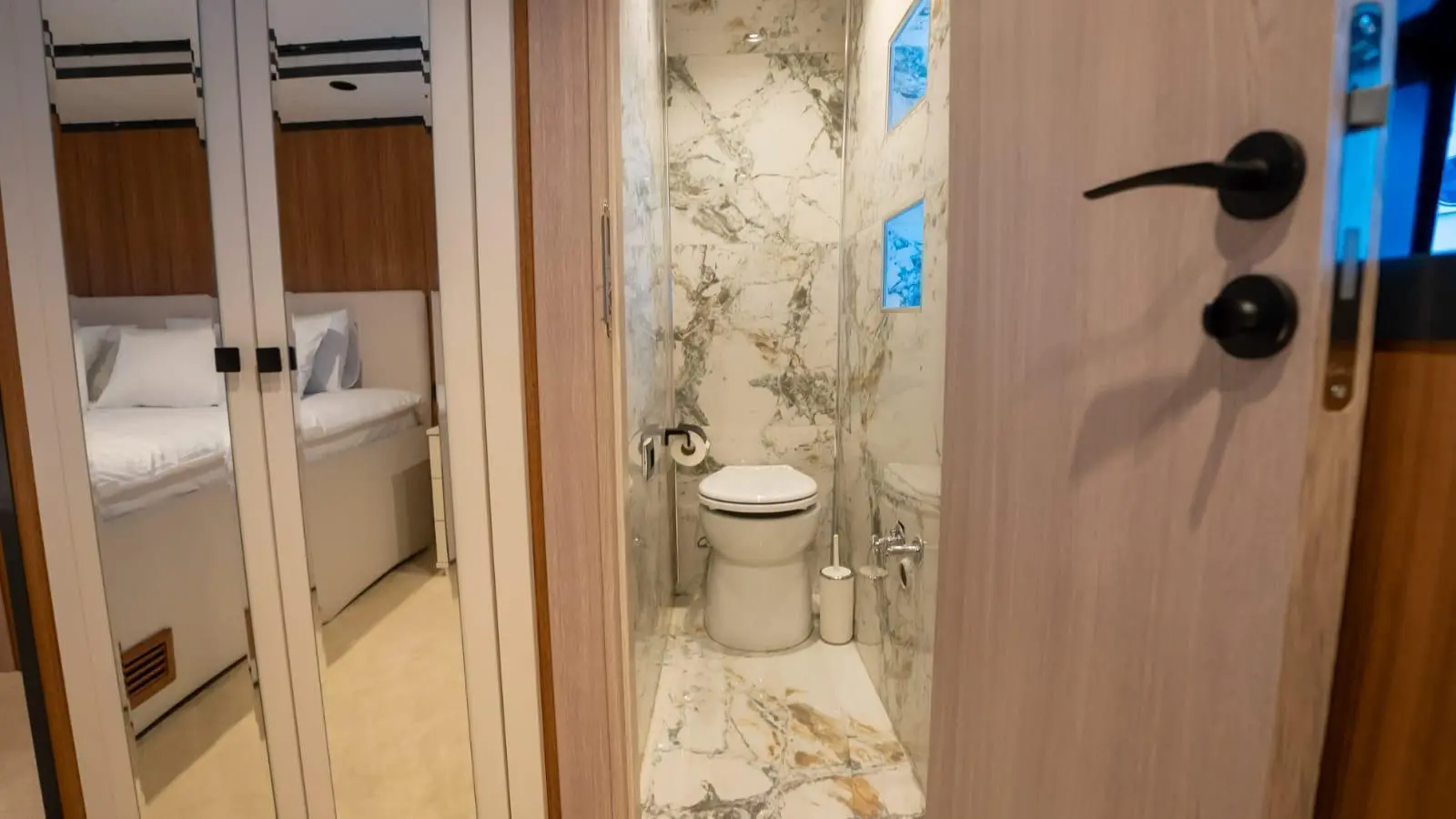 Almila offers a beautifully designed interior with five spacious cabins, accommodating up to 11 guests comfortably. Each cabin is equipped with full air conditioning, modern bathrooms featuring shower boxes, and electric toilets. This configuration is ideal for charter groups looking for comfort and privacy.