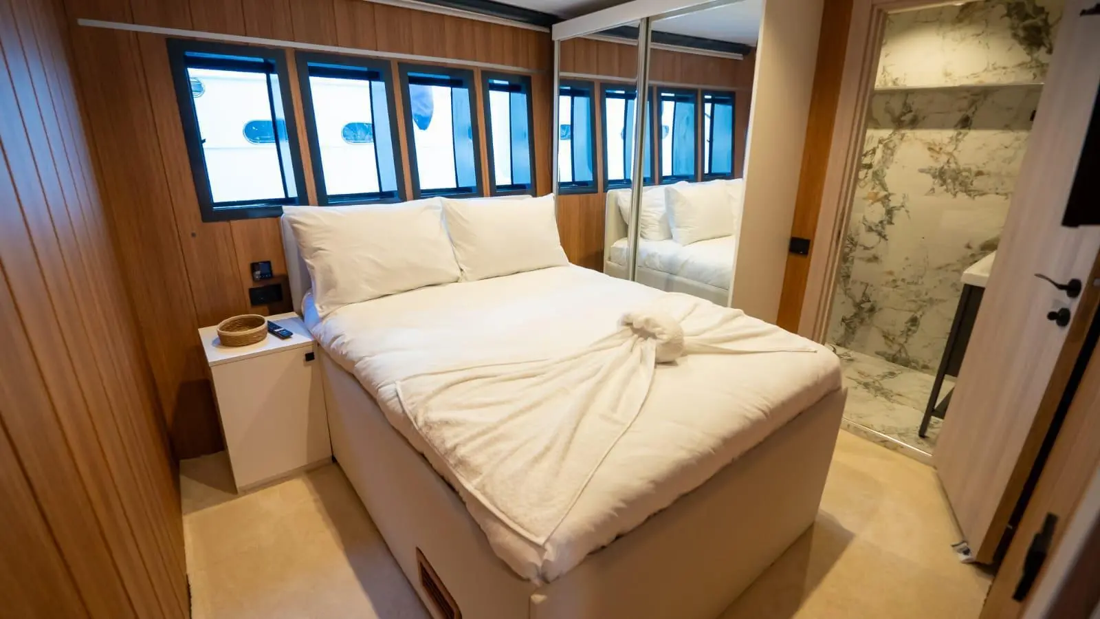 Inside Trawler Almila, you’ll find a sophisticated mix of Turkish craftsmanship and modern luxury. Key amenities include. The yacht’s interior décor features wood accents, soft lighting, and comfortable seating areas, making you feel right at home on the sea.
