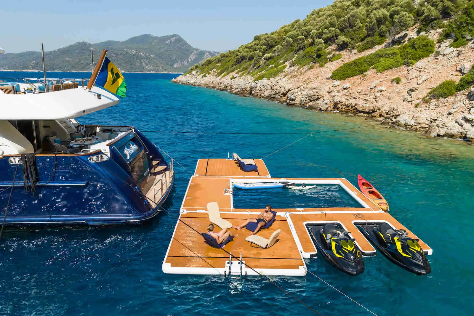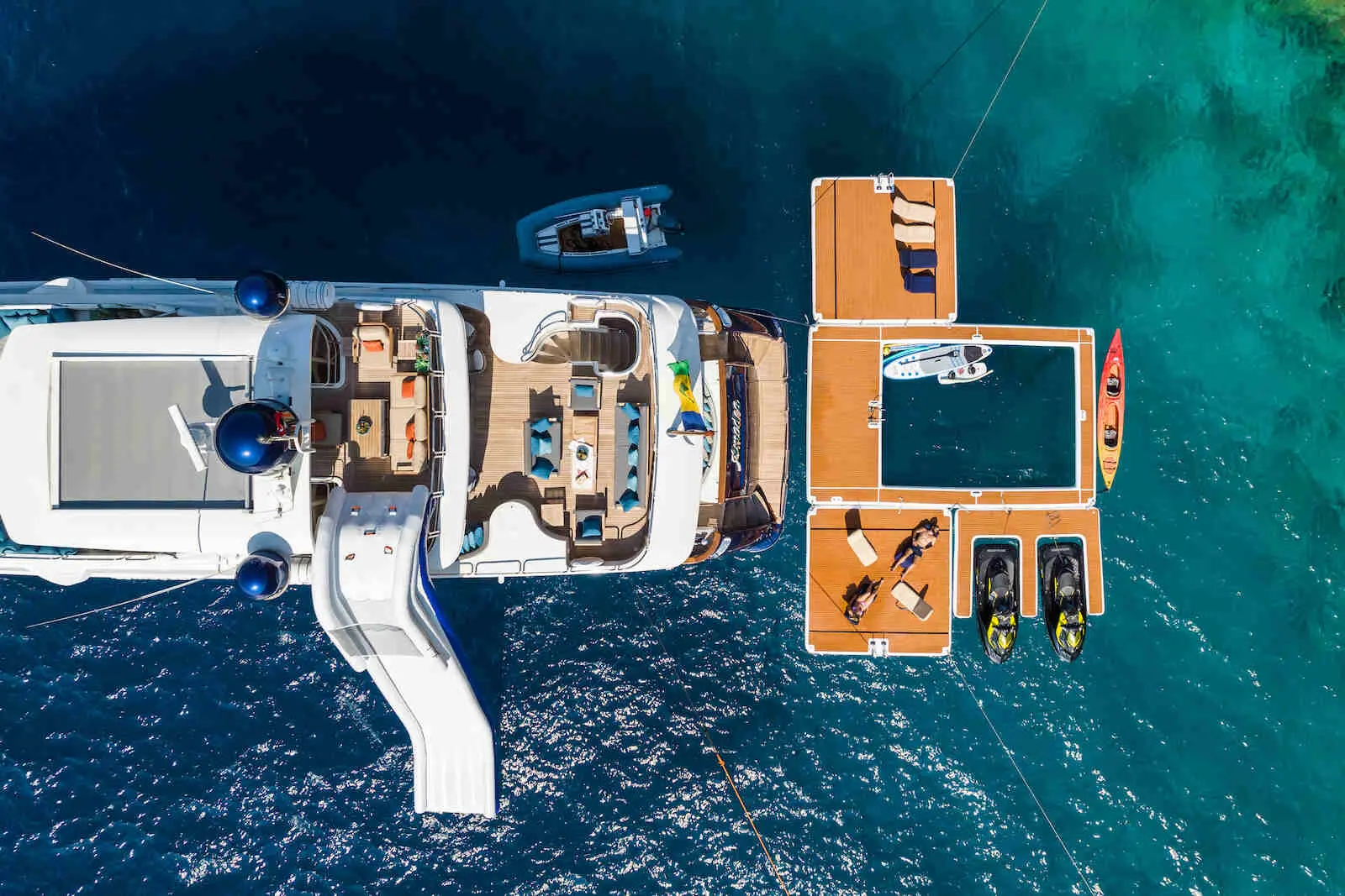 7m Gala Viking V7 tender (175hp outboard), 2 x Sea-Doo RXP 260 RS jet skis, 2 x Inflatable paddleboards, Hard plastic stand-up paddleboards, 7m slide from the sundeck, Wakeboard, Waterskis, Sea pool (8 x 5m) with jellyfish net, 2 x 4x4m inflatable platforms, Inflatable jet ski dock, Inflatable toys including a donut and pizza.