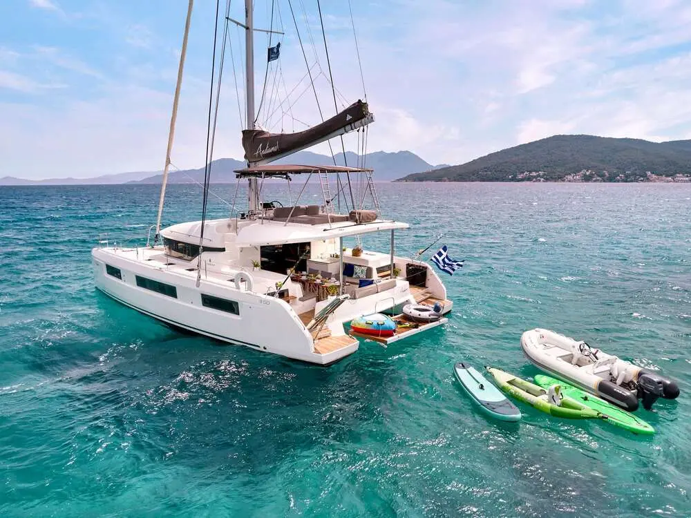 The Lagoon 50 "Andiamo!" is a premier luxury catamaran offering unparalleled comfort, performance, and adventure. Designed for Greek island hopping, this modern sailing yacht is equipped with top-tier amenities, spacious cabins, and a dedicated 2-person crew. Whether you're seeking relaxation or thrilling water activities, "Andiamo!" promises an unforgettable experience on the Aegean Sea.
