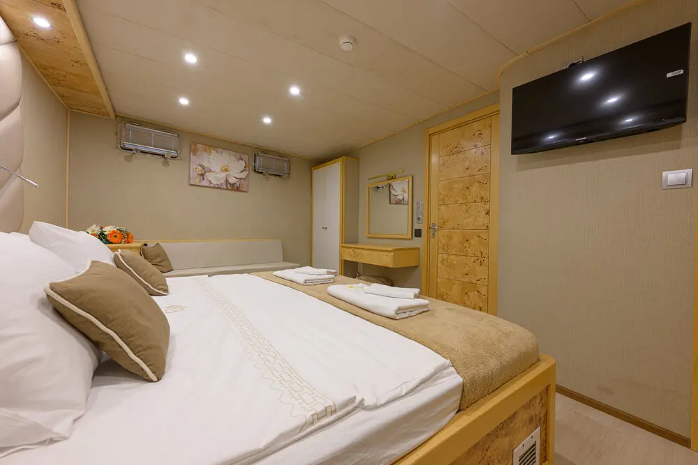 The Gulet Belgin Sultan features five exquisitely designed cabins, including one master cabin and four double cabins. Each cabin is equipped with a private bathroom and toilet, ensuring utmost privacy and convenience for all guests. The cabins are fully air-conditioned, providing a comfortable retreat after a day of exploration.