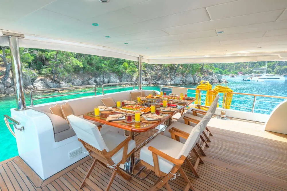One of the highlights of the Gulet Belgin Sultan is the dining experience. The onboard chef prepares a variety of gourmet dishes, using fresh and local ingredients. Guests can enjoy meals in the elegant dining area or on the deck, surrounded by stunning views. The fully equipped kitchen ensures that every meal is a culinary delight.