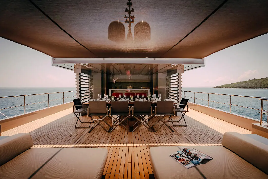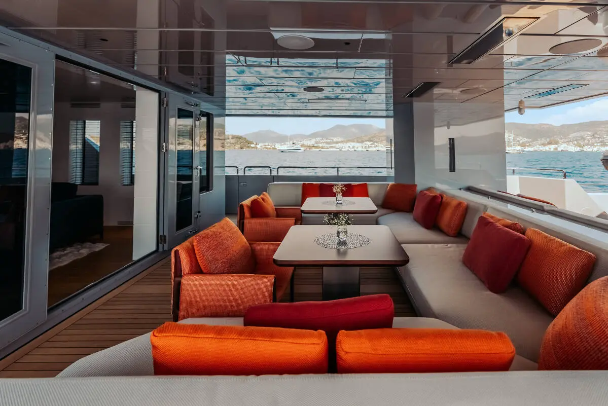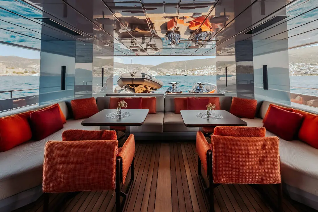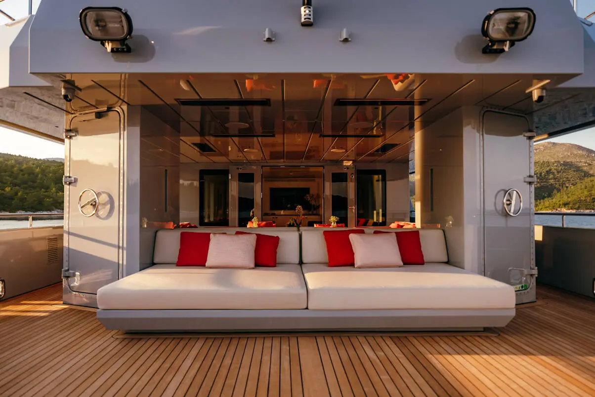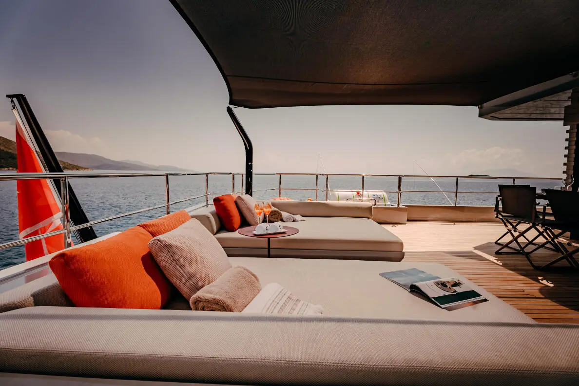 The yacht’s exterior is carefully crafted to maximize outdoor living. The foredeck Jacuzzi is a standout feature, offering panoramic sea views while you unwind under the sun. Surrounding loungers and cushioned seating create the perfect setting for afternoon relaxation.