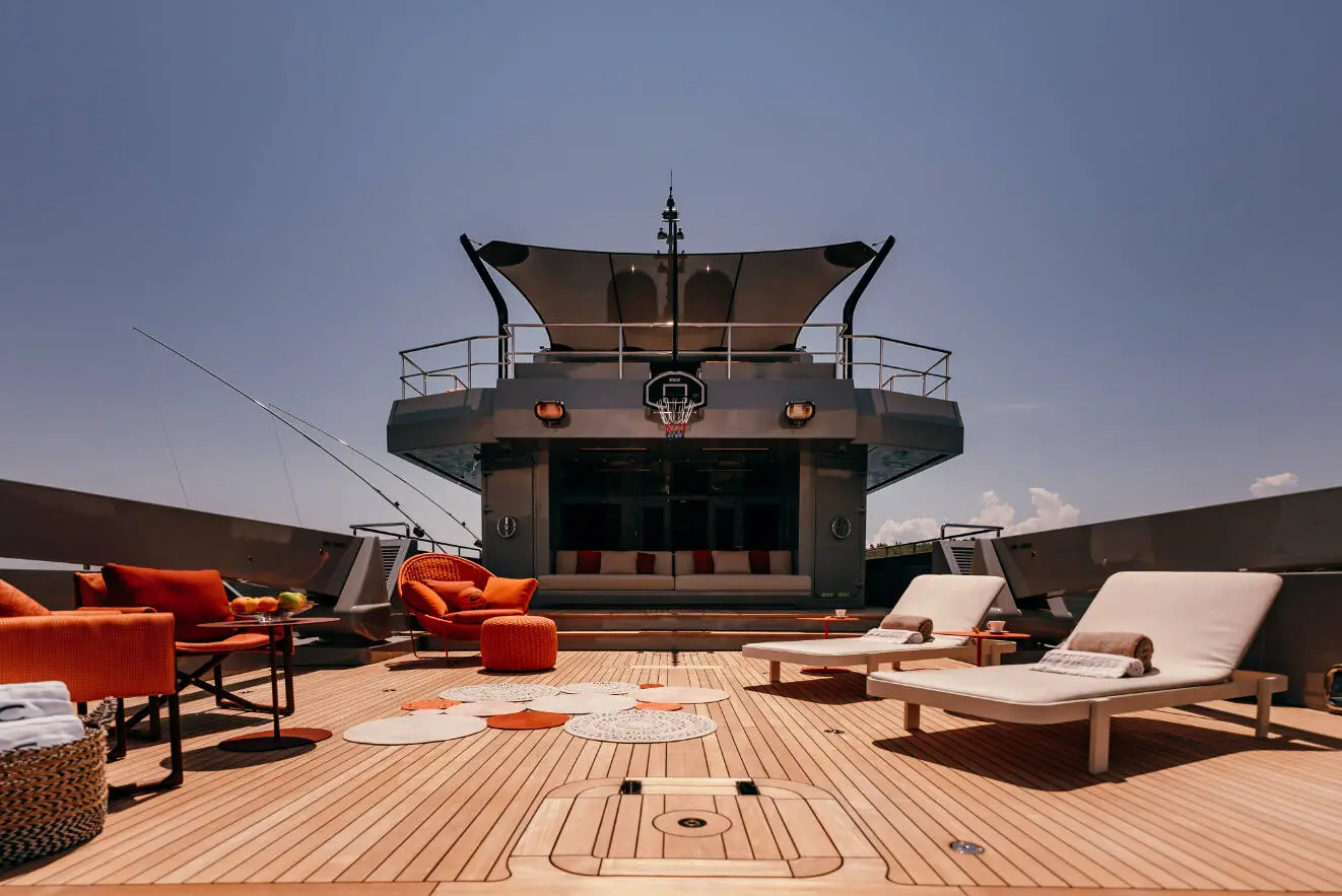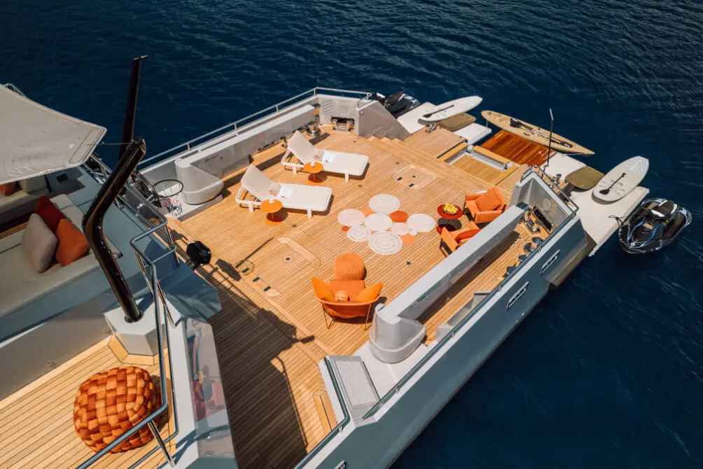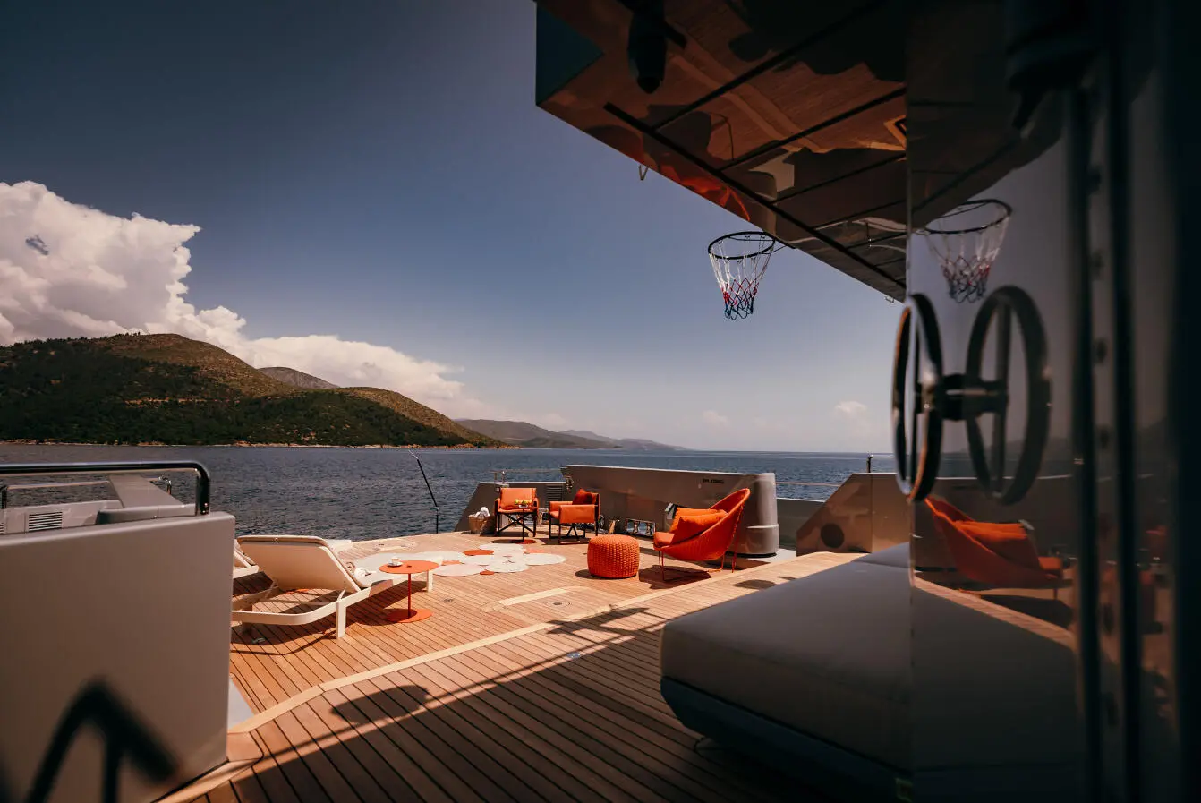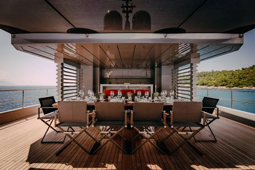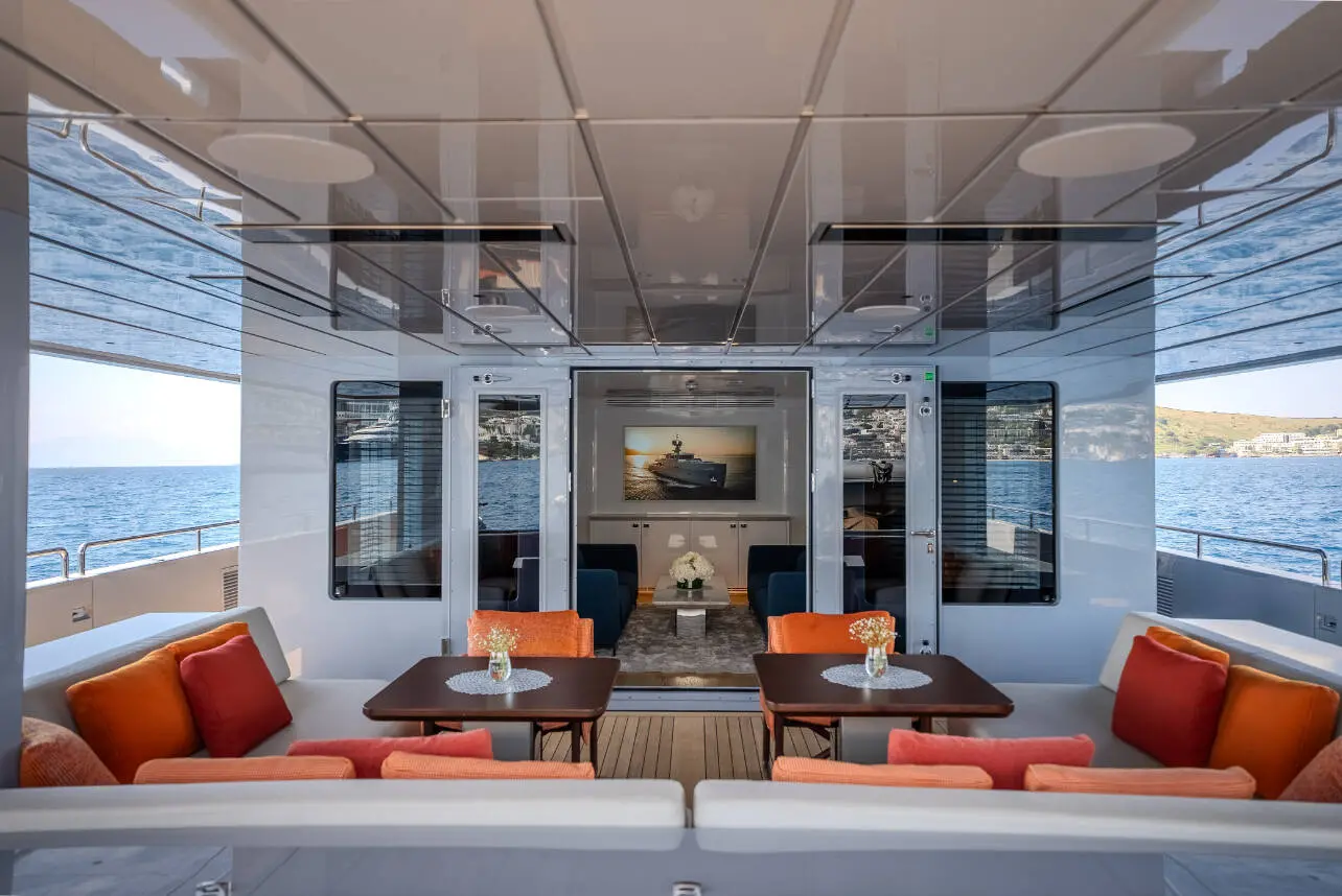 The yacht’s exterior is carefully crafted to maximize outdoor living. The foredeck Jacuzzi is a standout feature, offering panoramic sea views while you unwind under the sun. Surrounding loungers and cushioned seating create the perfect setting for afternoon relaxation.