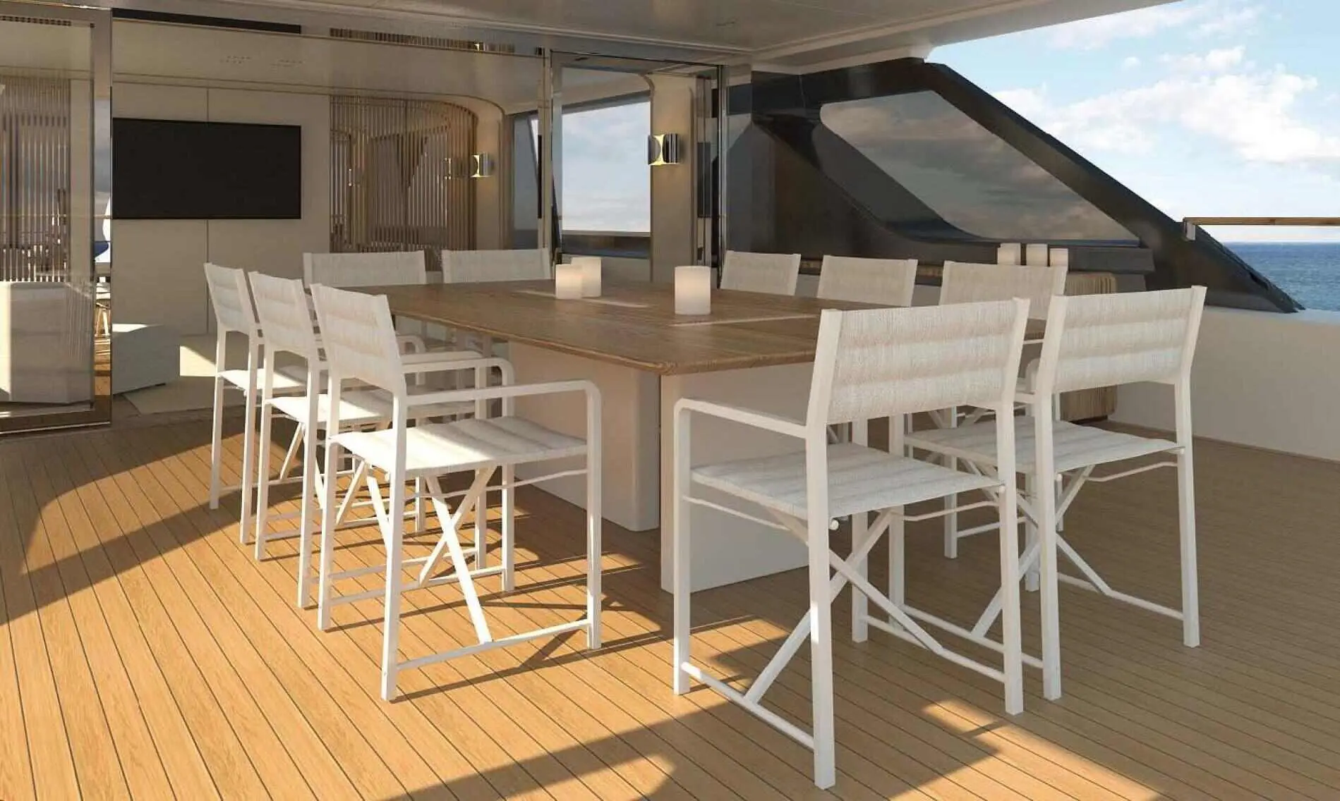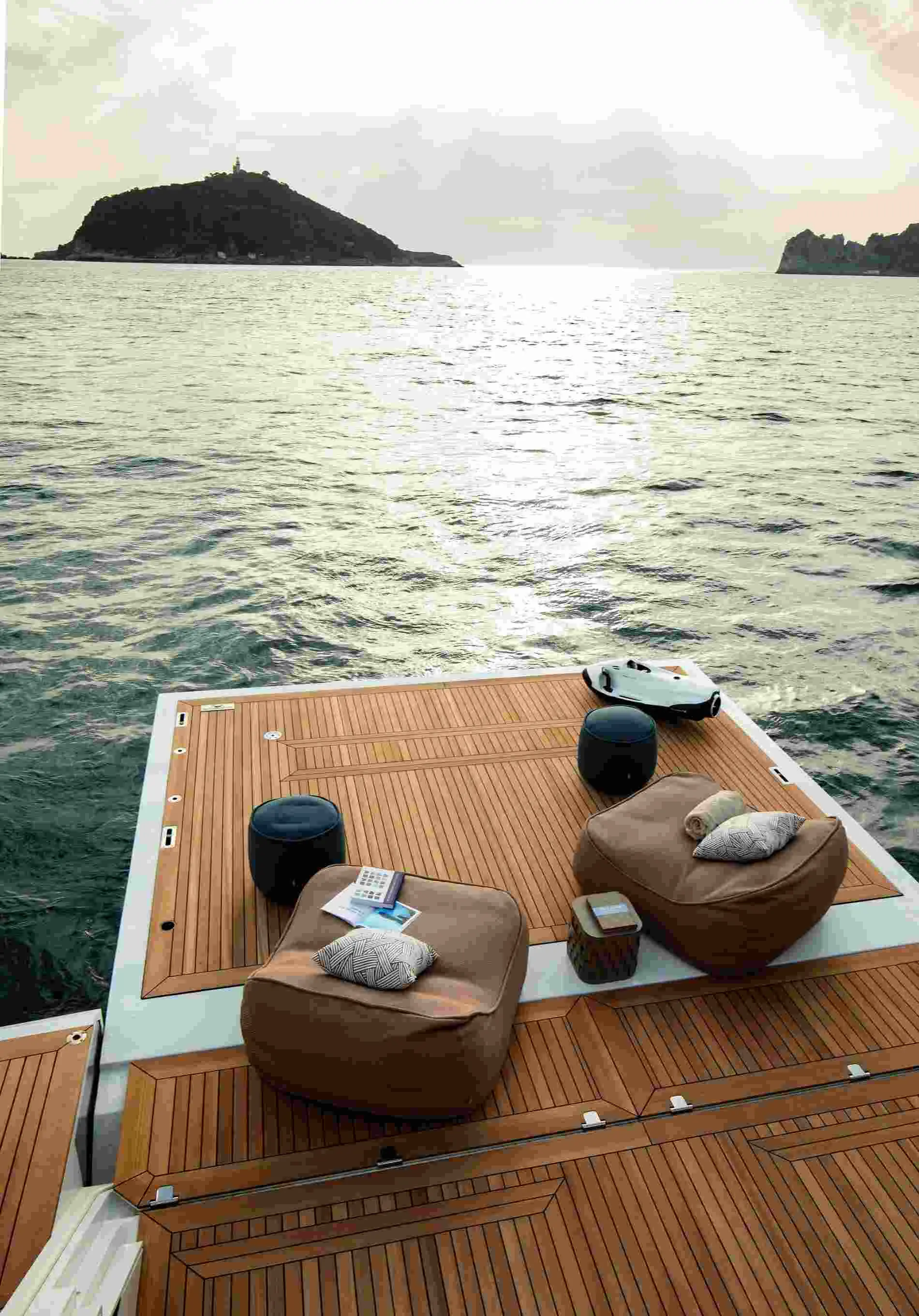 The outdoor spaces aboard Dawo are designed for relaxation and entertainment. The spacious deck features comfortable lounging areas, perfect for sunbathing or enjoying a cocktail at sunset. A highlight is the deck Jacuzzi, offering panoramic views of the sea while providing the ultimate in relaxation. The outdoor dining area allows for alfresco meals prepared by the onboard chef, with seating options designed for both intimate dinners and larger gatherings.