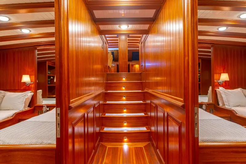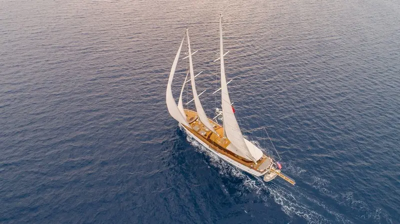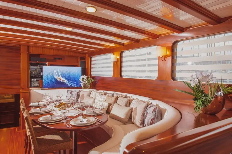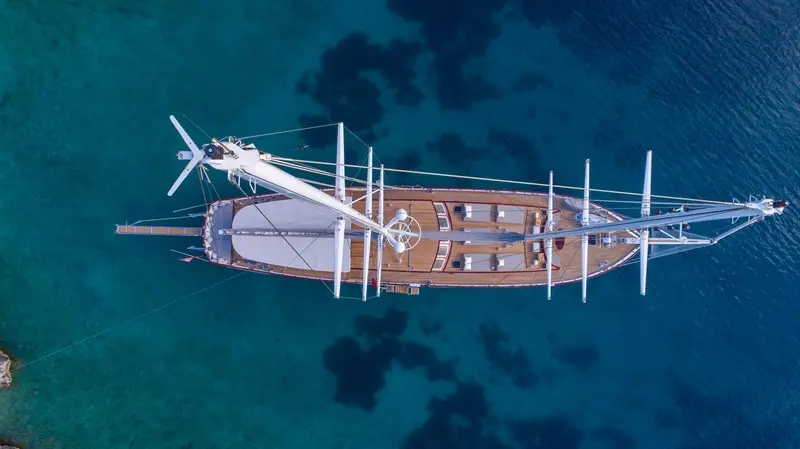 Boasting impressive dimensions with a length of 42.50 meters and a beam of 8.20 meters, Hic Salta commands the waves with elegance and stability. Constructed in 2006 and refurbished to perfection in 2014, it combines timeless design with contemporary amenities. Flying the Turkish flag with pride, it anchors in Bodrum, serving as a luxurious home away from home for up to 10 guests. The vessel's dual 540 hp CAT engines and sophisticated navigation equipment ensure a seamless cruising experience.