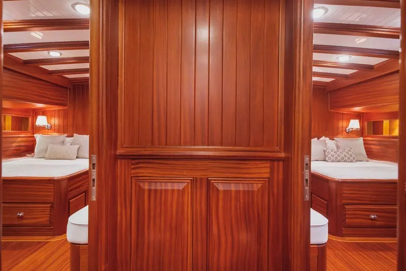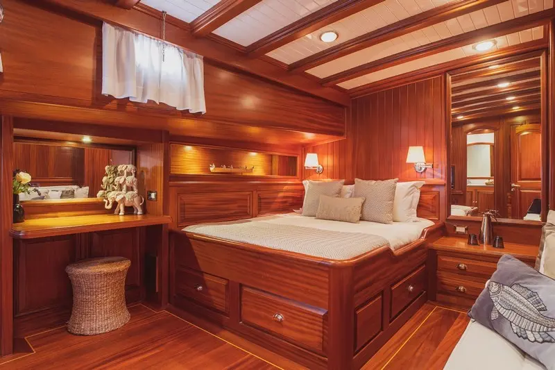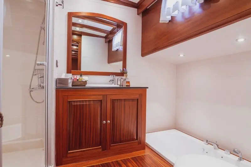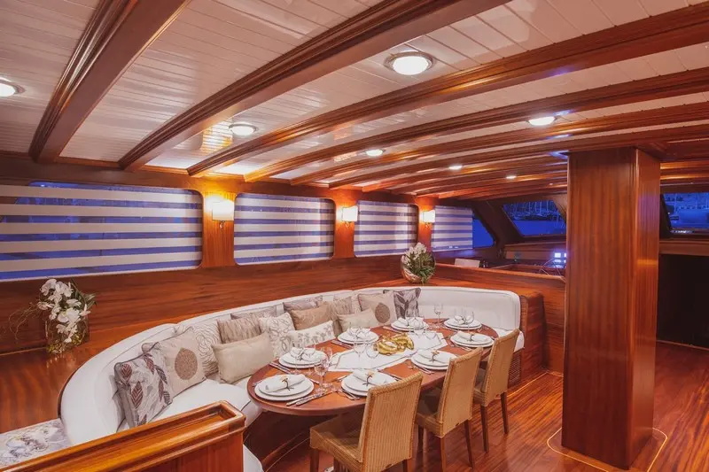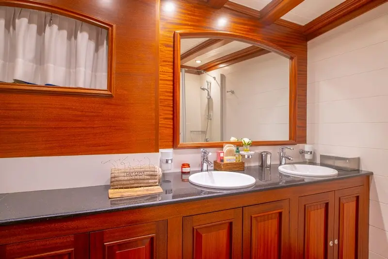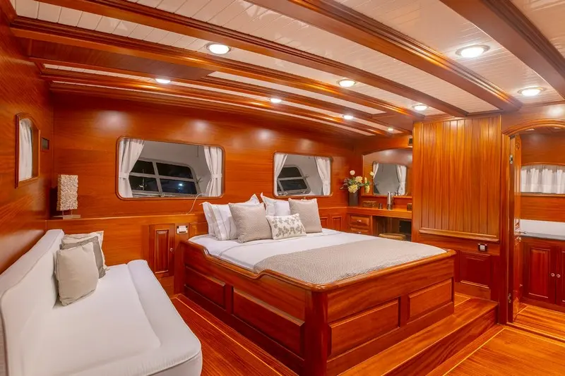 Accommodation aboard Hic Salta is nothing short of spectacular, with cabins designed to offer a sanctuary of peace and luxury. Each of the one Master, two Double, and two Twin cabins features air conditioning, plush interiors, and private bathrooms, ensuring a restful night's sleep after a day of adventure.