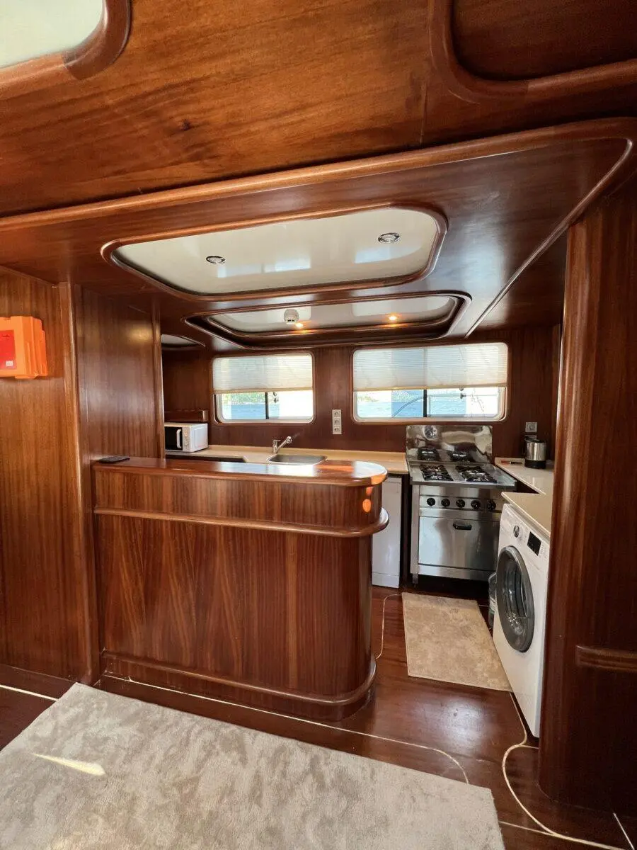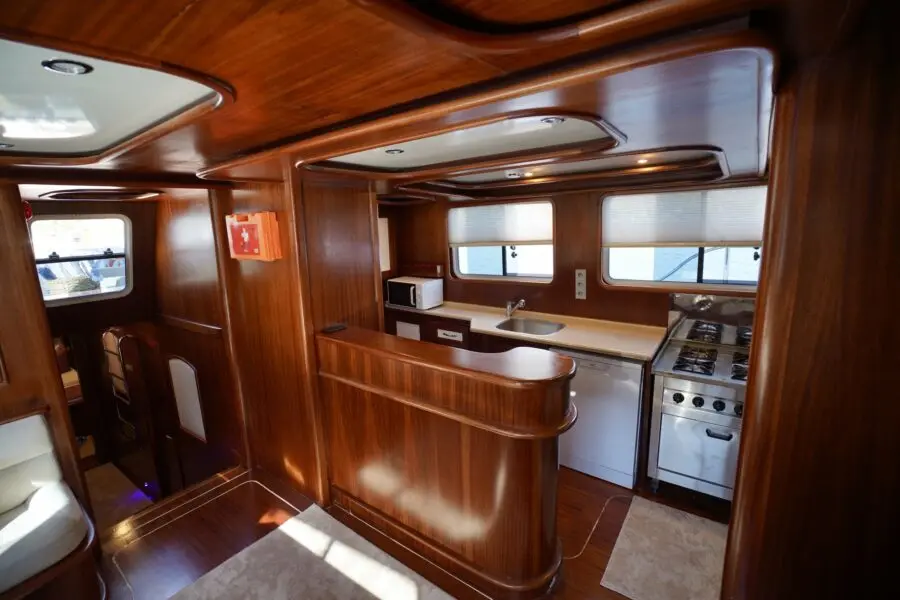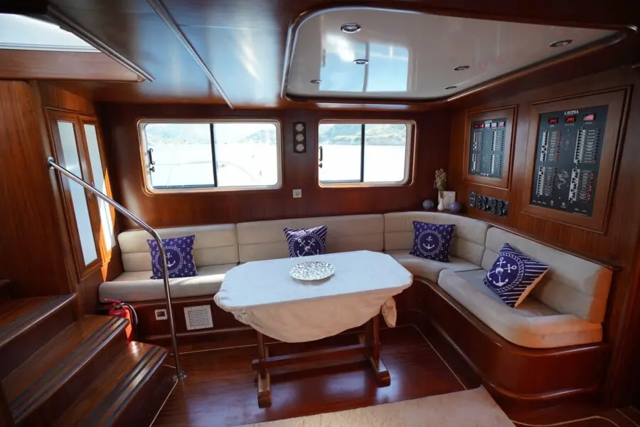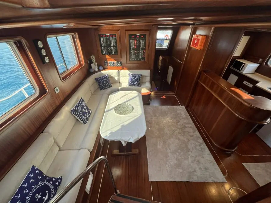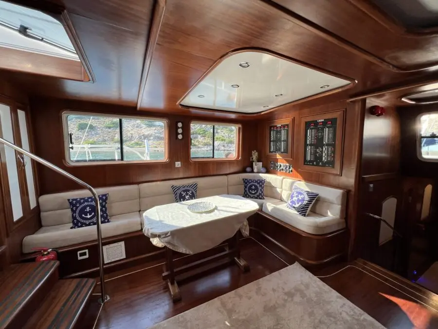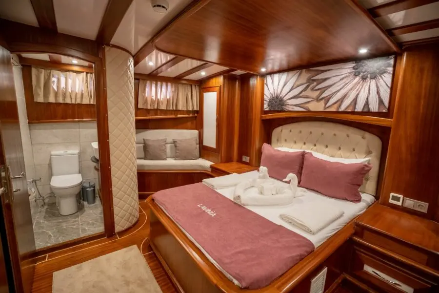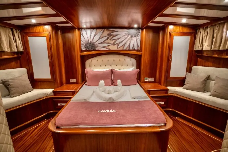 Lavinia's accommodation includes two master cabins and three double cabins, each featuring en-suite bathrooms, shower cells, and electric toilettes. The air-conditioned interior provides a cool retreat from the sun-soaked decks, ensuring comfort throughout the voyage.