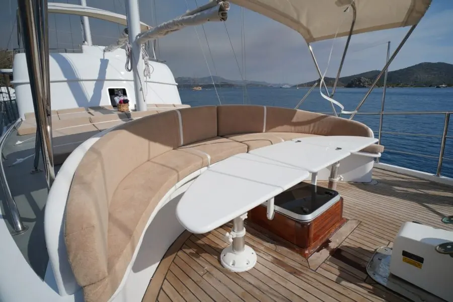 The gulet's interior is a testament to fine craftsmanship, with luxurious materials and attention to detail evident in every space. The exterior decks are thoughtfully designed to offer ample lounging and dining areas, making them perfect for enjoying the stunning seascapes and gentle breezes.