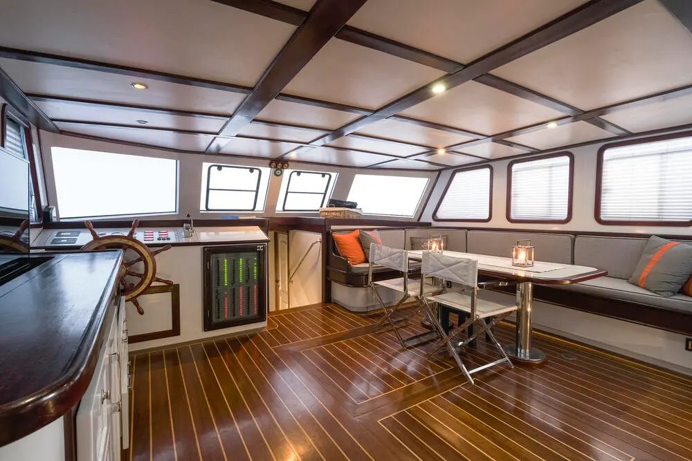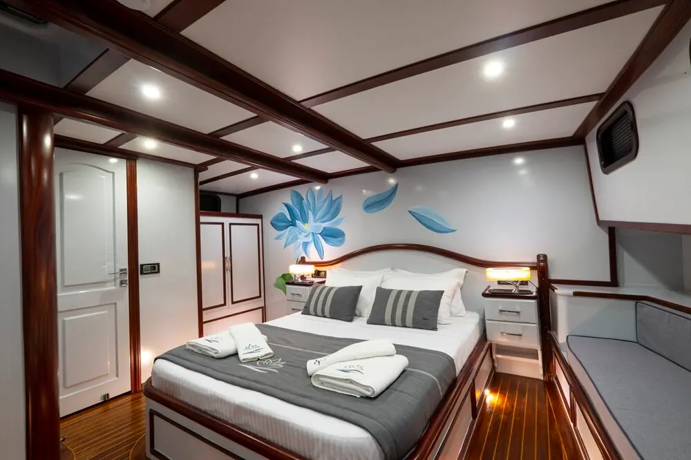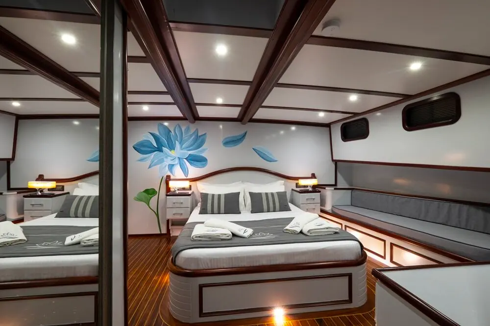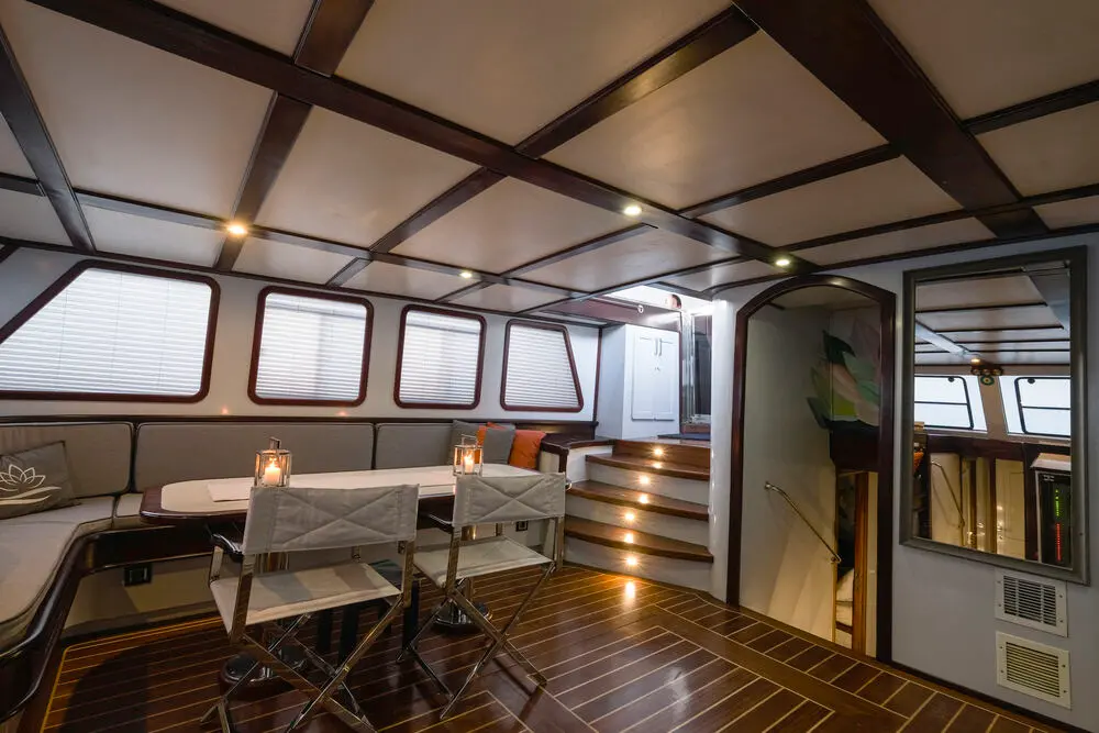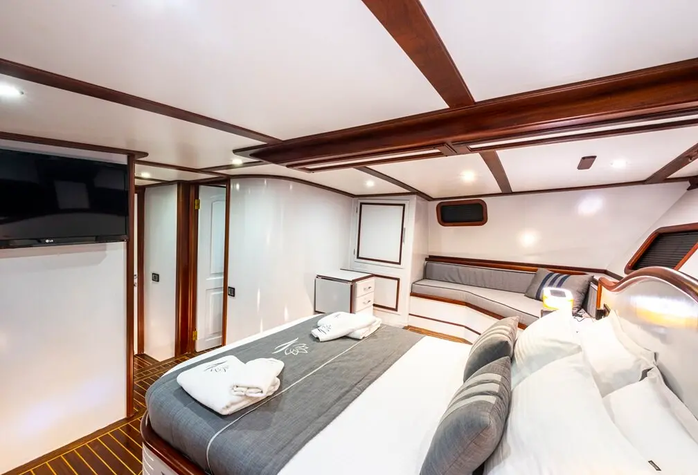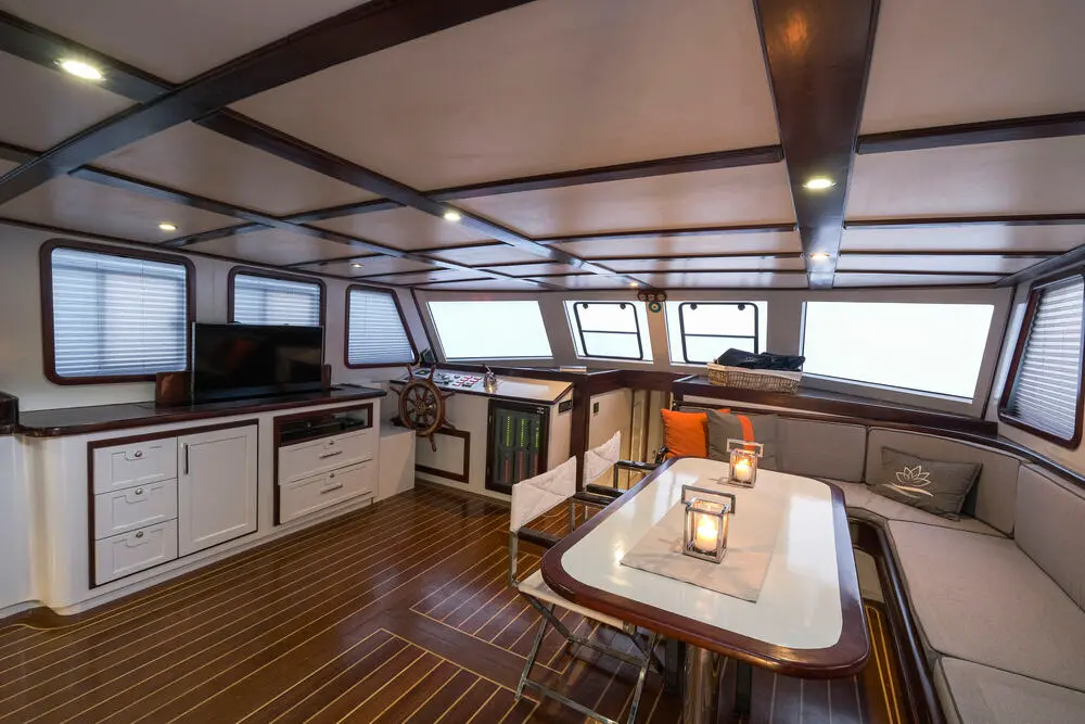 The interior of the Gulet Lotus is designed with comfort and practicality in mind. Its wooden craftsmanship highlights traditional Turkish gulet aesthetics while maintaining a luxurious ambiance.