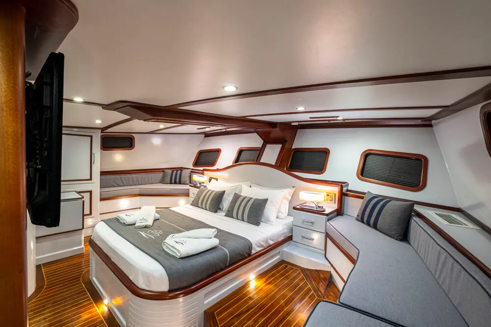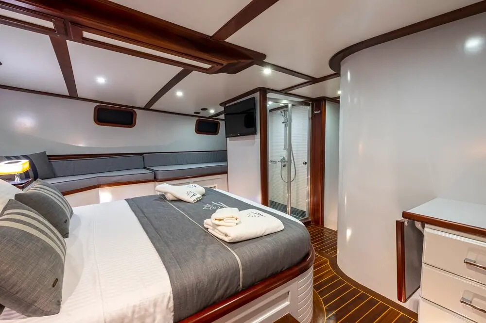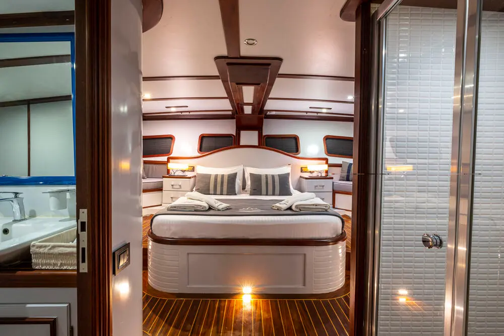 The spacious master cabins offer enhanced comfort, making them perfect for couples seeking privacy. With a 10-guest capacity, the gulet is ideal for medium-sized groups. Every cabin features elegant décor and essential amenities, ensuring restful nights throughout your journey.