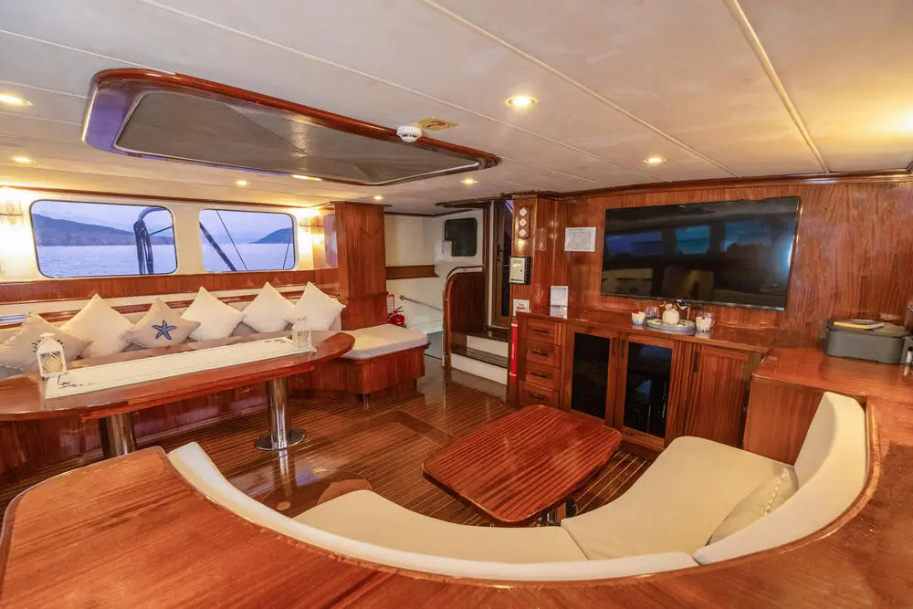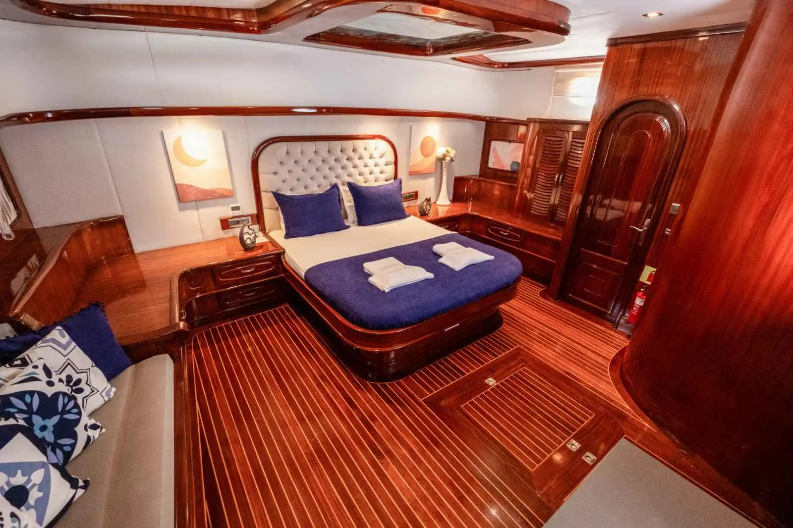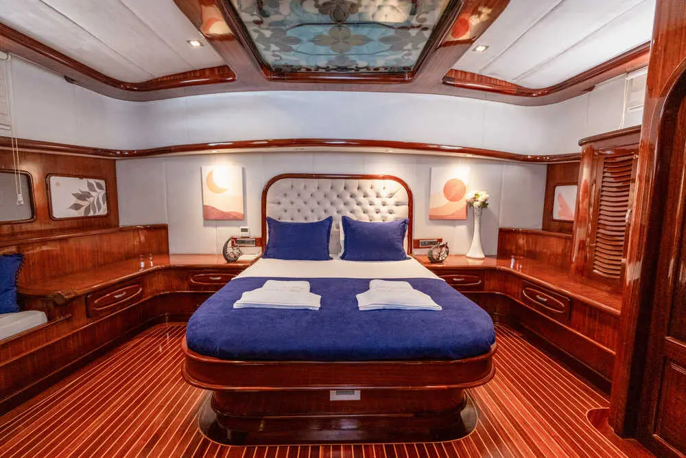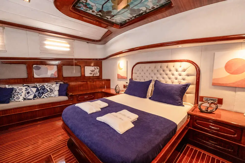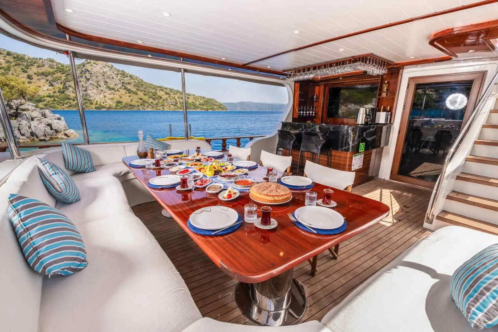 The gulet's interior exudes elegance and warmth, featuring handcrafted woodwork and tasteful decorations that complement the serene beauty of the sea. The exterior spaces are thoughtfully designed for relaxation, entertainment, and dining under the stars, providing guests with unparalleled views and comfort.