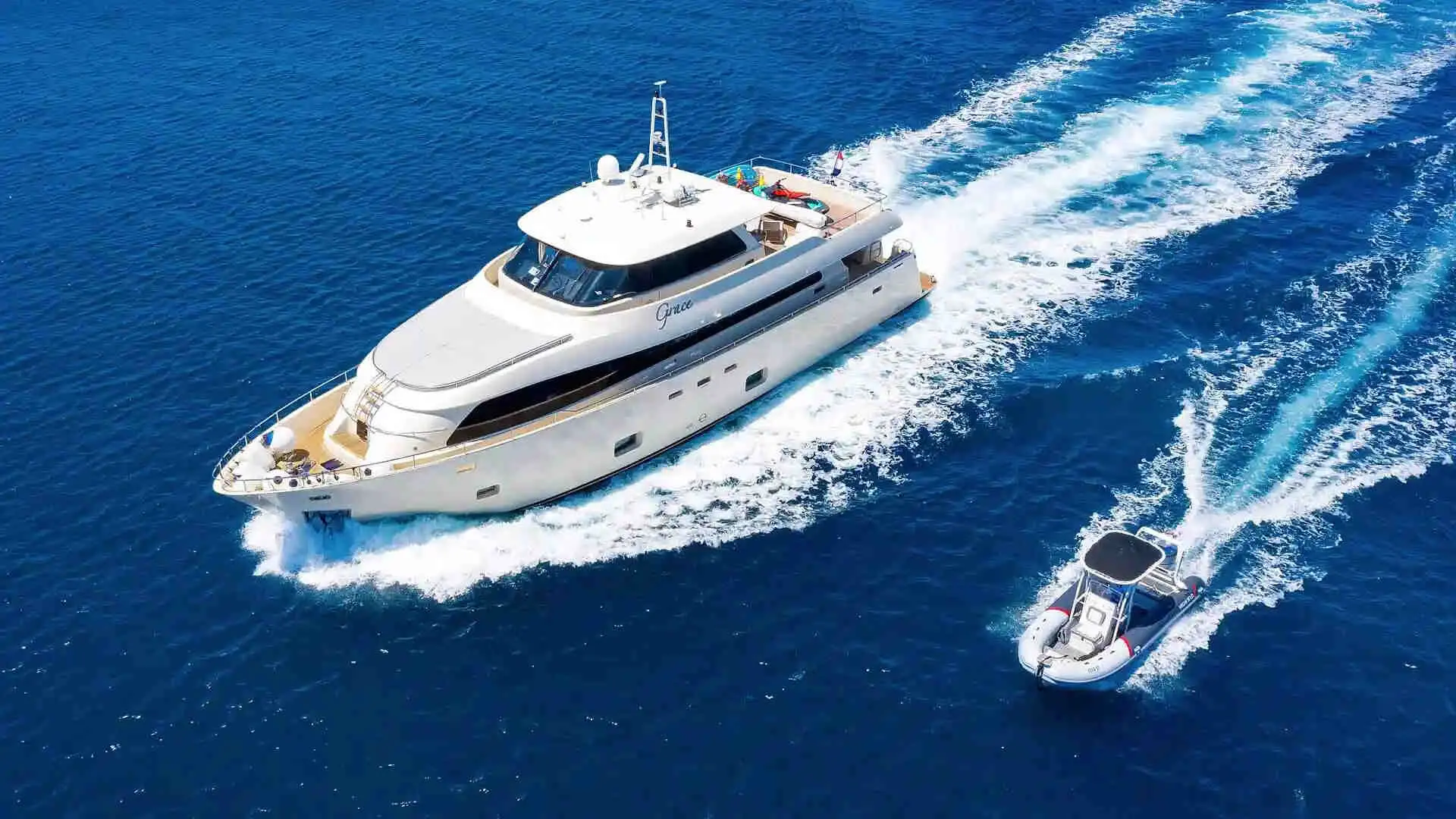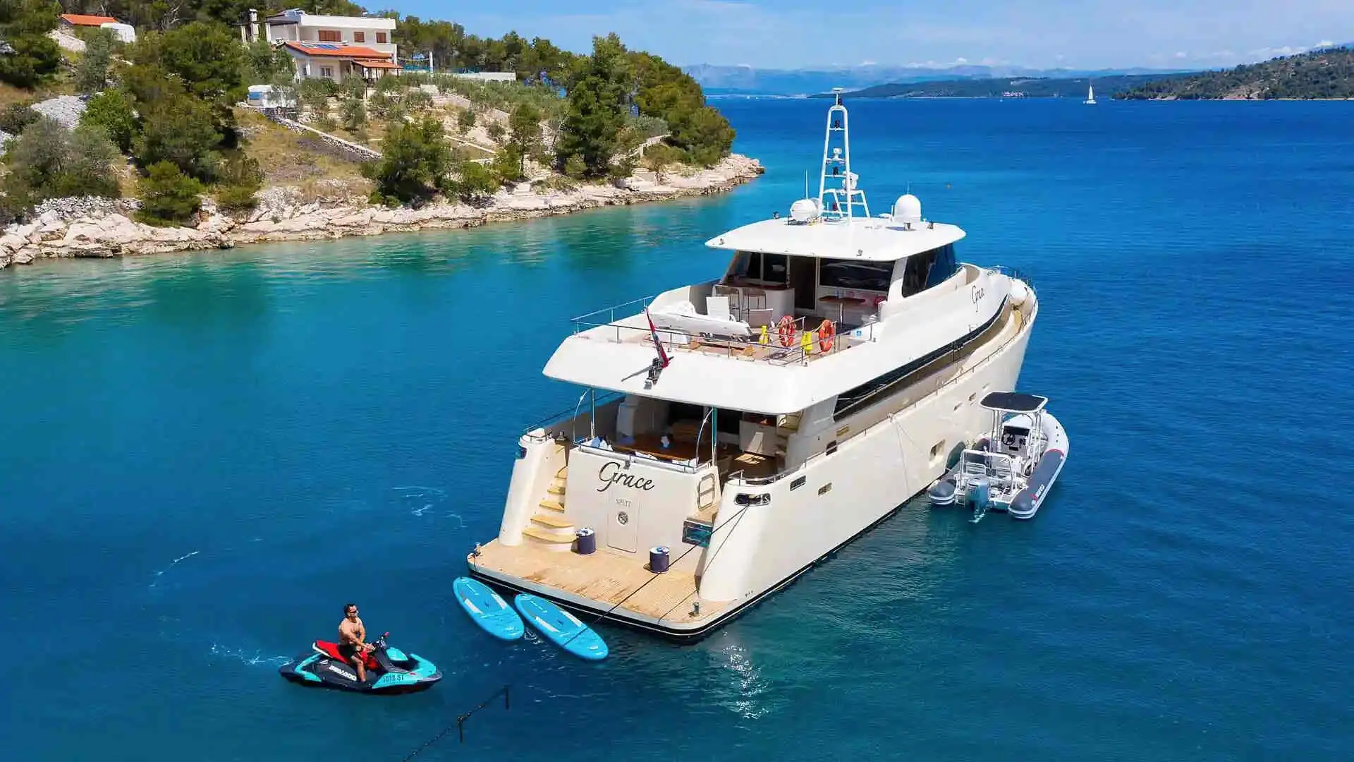 Set sail from Split, Croatia, on the luxurious Grace Motoryacht. Enjoy opulent accommodations, gourmet dining, and a plethora of water activities for a memorable luxury experience for up to 10 guests.