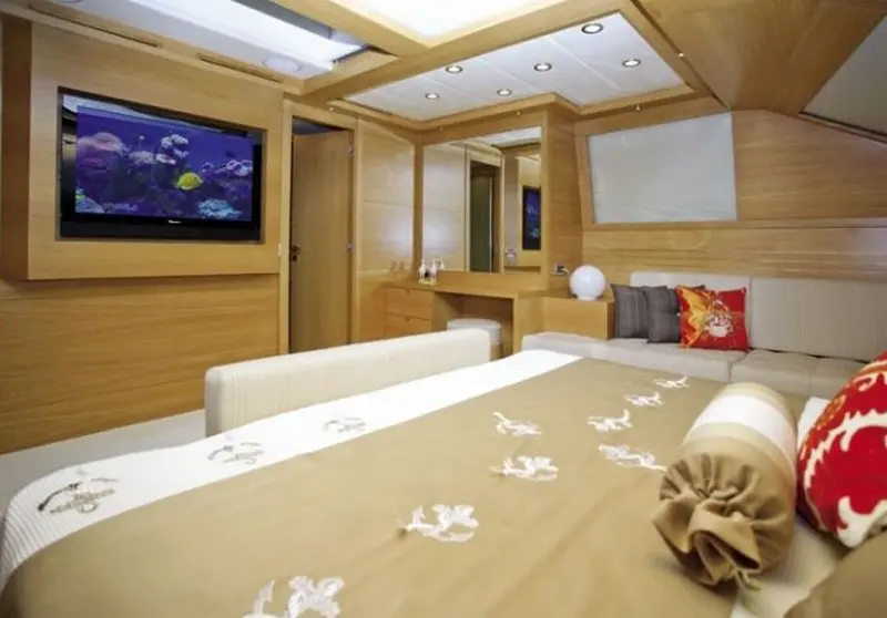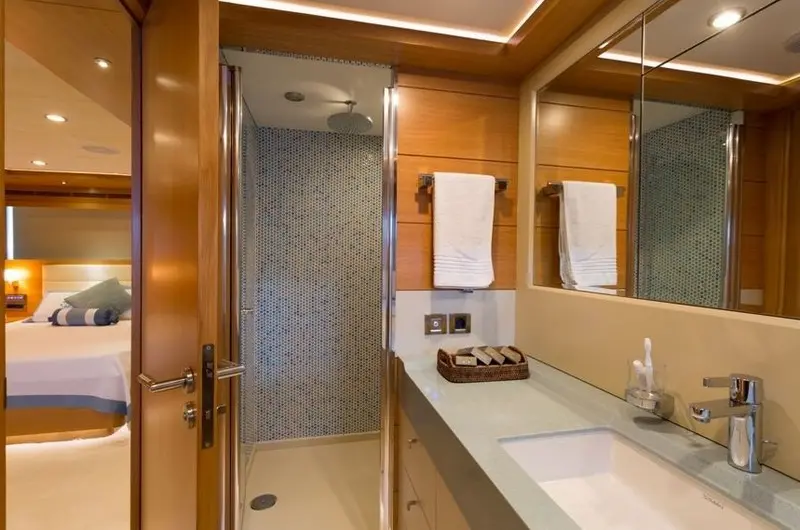 Panfeliss accommodates guests in one master suite, two double cabins, and two twin cabins, each designed for comfort and privacy with en-suite shower boxes, electric toilets, and air conditioning. The yacht's spacious layout fosters both communal enjoyment and private retreats, creating a perfect balance for relaxation and entertainment.