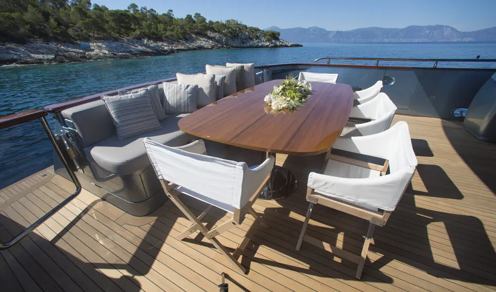With a beam of 6.90 meters and a draft of 2 meters, Princess L promises stability and spaciousness. Powered by twin 2400 HP MTU engines, she achieves cruising speeds of up to 20 knots, ensuring swift and comfortable passage across the azure waters of the Aegean Sea.