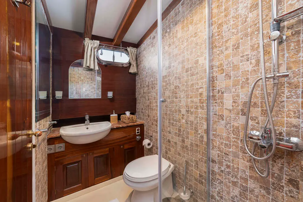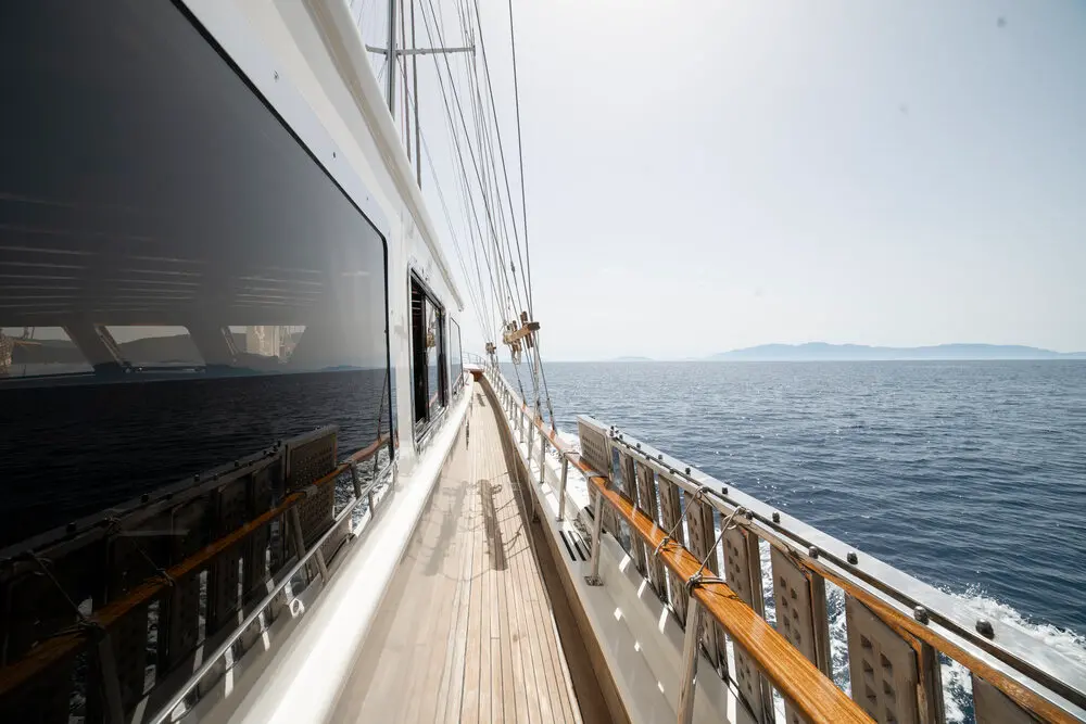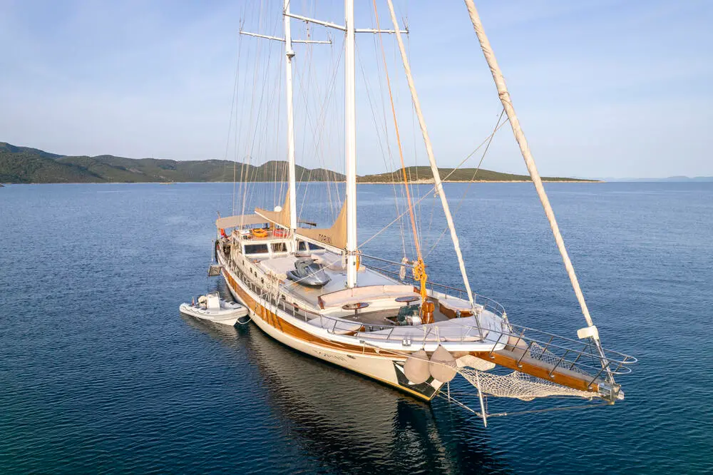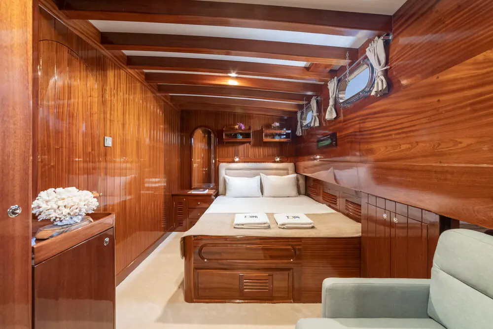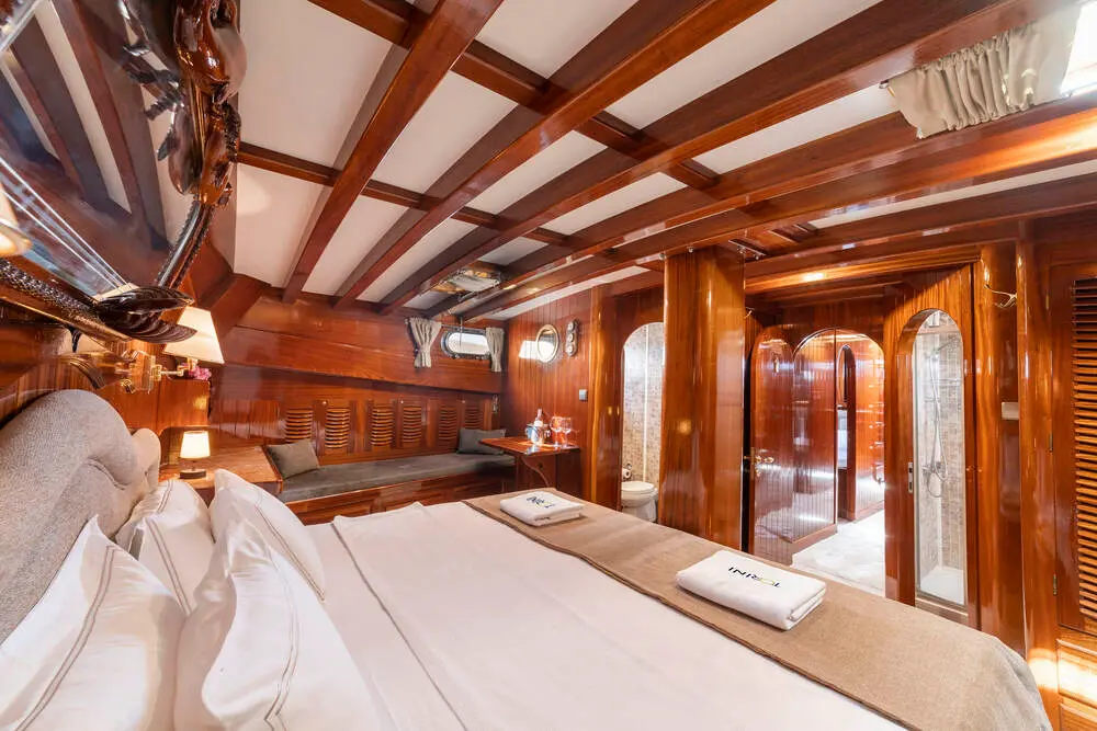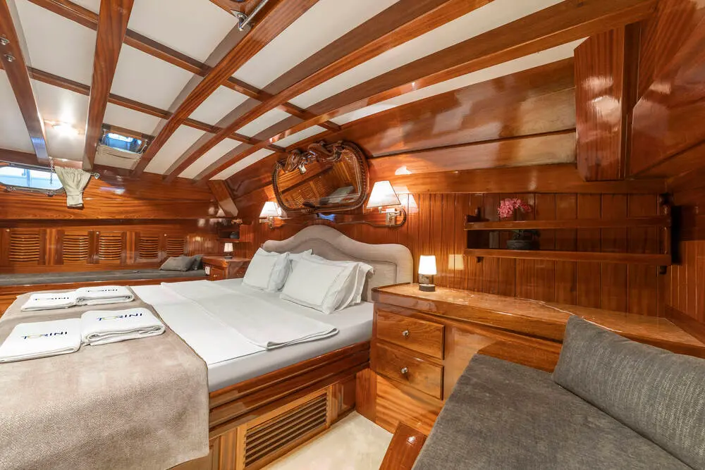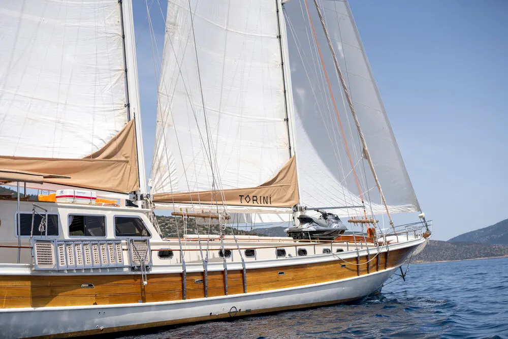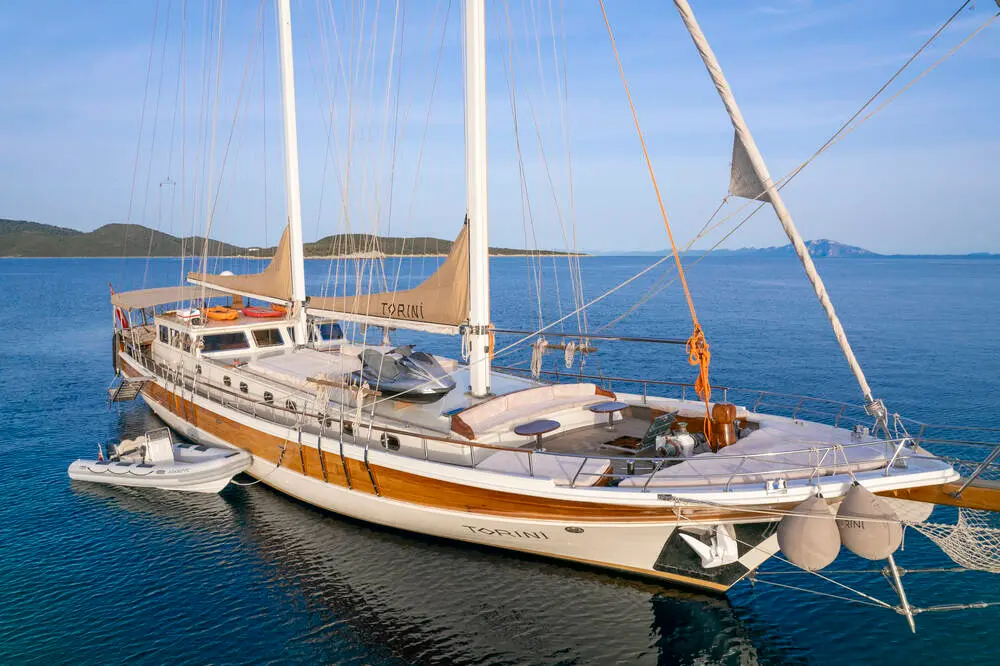 Torini stands out with its elegant design and impressive specifications. Built in 2000 and refitted in 2020, this 30m-long gulet ensures a smooth sail with its 480 hp CAT engine and state-of-the-art navigation systems, including radar, depth sounder, VHF radio, and GPS.