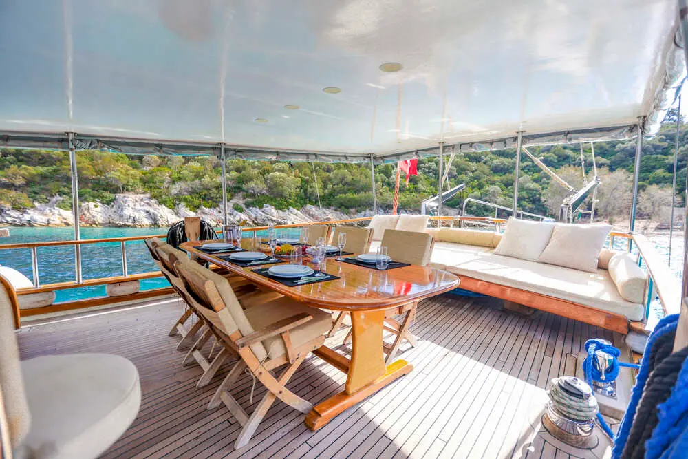 Tufan V is equipped with a range of facilities and entertainment options to enrich your sailing experience. From an indoor restaurant to a salon with a TV and music system, alongside wireless internet, you're guaranteed to find onboard leisure as captivating as the views outside. The gulet also comes with advanced navigation technology, including radar, depth sounder, VHF radio, and GPS, ensuring a safe journey.