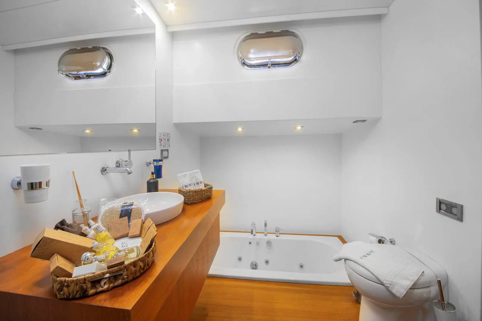 Air conditioning is available in all cabins, providing a comfortable environment regardless of the weather conditions outside. For navigation and communication, the Gulet Ubi Bene is equipped with VHF radio and GSM systems, ensuring safety and connectivity throughout the voyage.