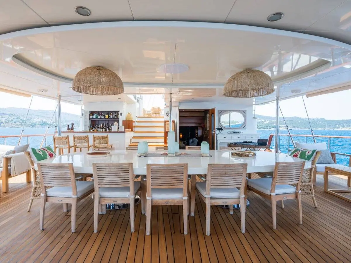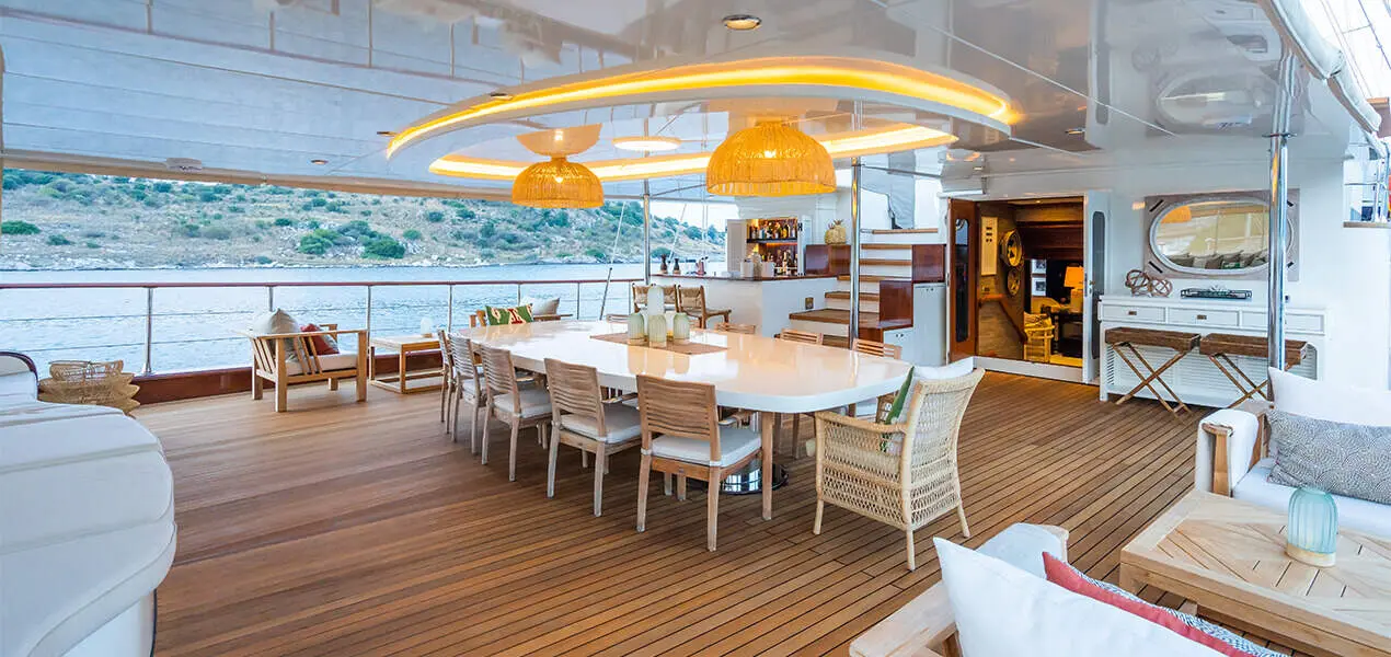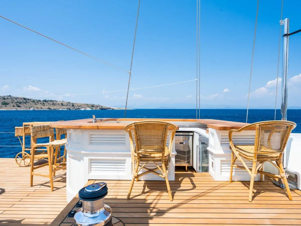 The Gulet Yazz features a sleek and stylish exterior design, reflecting the perfect blend of traditional gulet aesthetics and modern engineering. Its spacious decks are ideal for sunbathing, dining, and enjoying panoramic sea views. The 2023 refit has ensured that all exterior elements are in pristine condition, providing a fresh and inviting appearance.