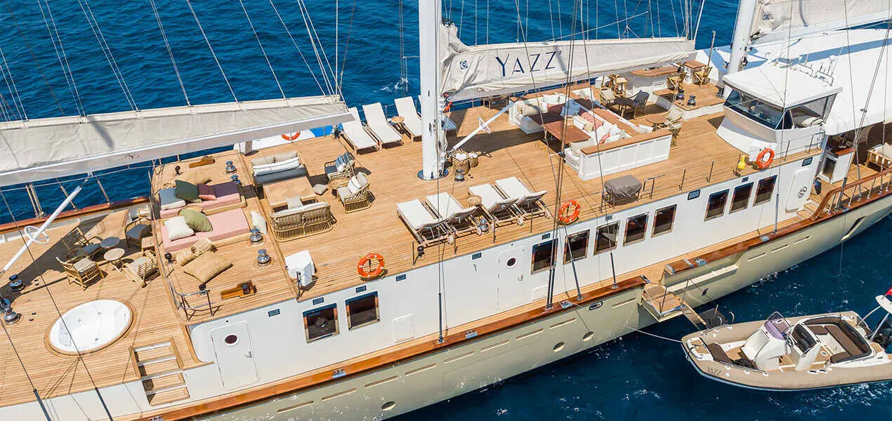 The Gulet Yazz is a symbol of maritime elegance and luxury, sailing under the Cook Islands flag and offering an unparalleled cruising experience from its base port in Bodrum. This 58-meter motor sailor, built in 2007 and refitted in 2023, combines traditional design with modern comforts, making it a perfect choice for a luxurious sea adventure.