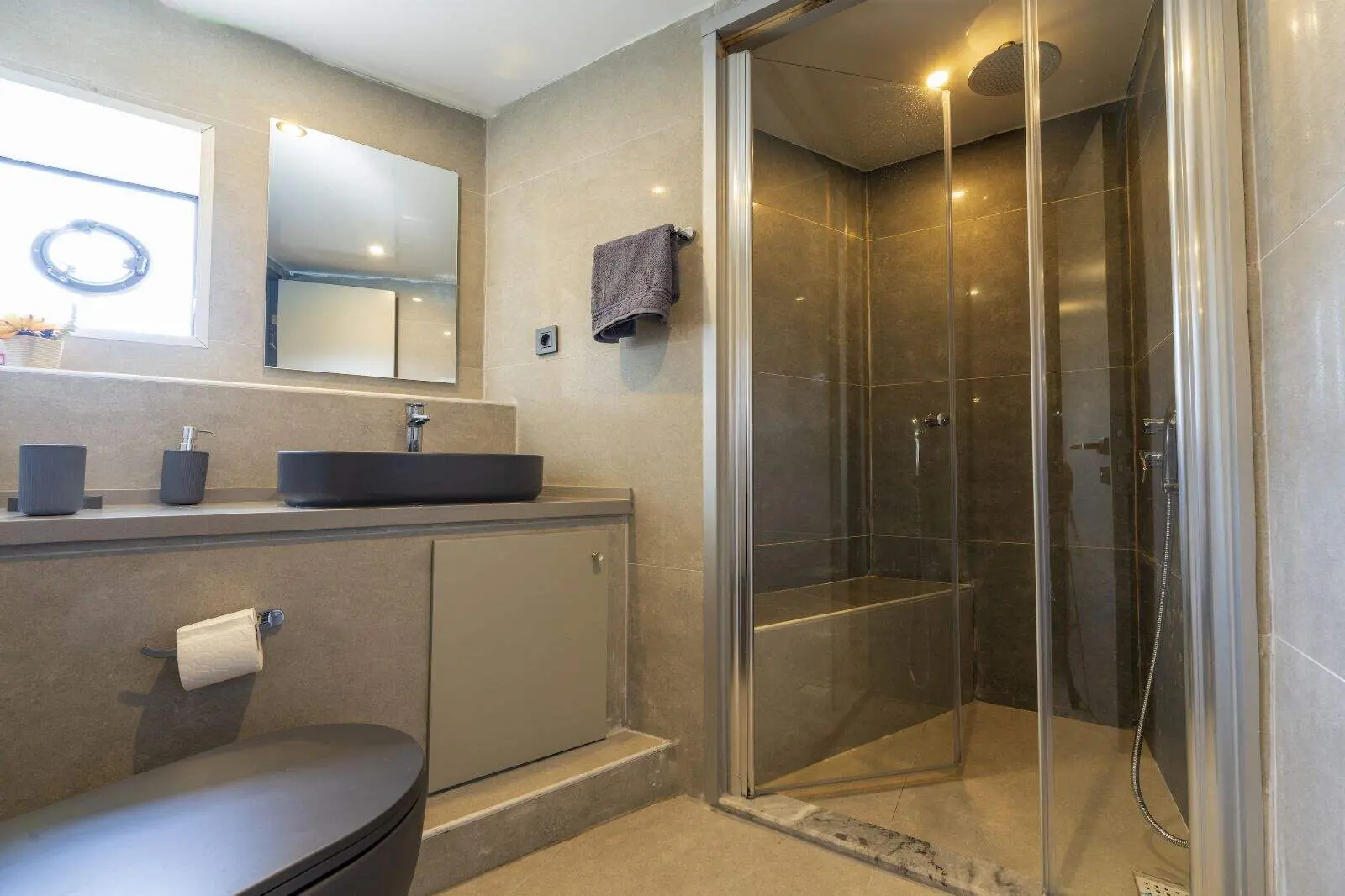 The trawler is equipped with an array of water sports equipment, including canoes, paddleboards, snorkeling gear, and fishing tackle, offering endless opportunities for adventure and relaxation. The deck shower provides a refreshing escape after a day in the sun, while the tender ensures easy exploration of secluded bays and coves.