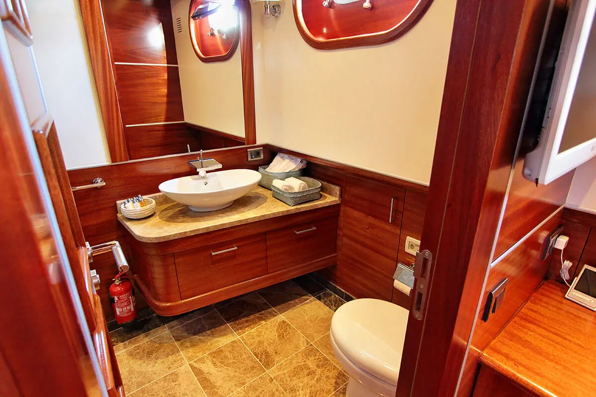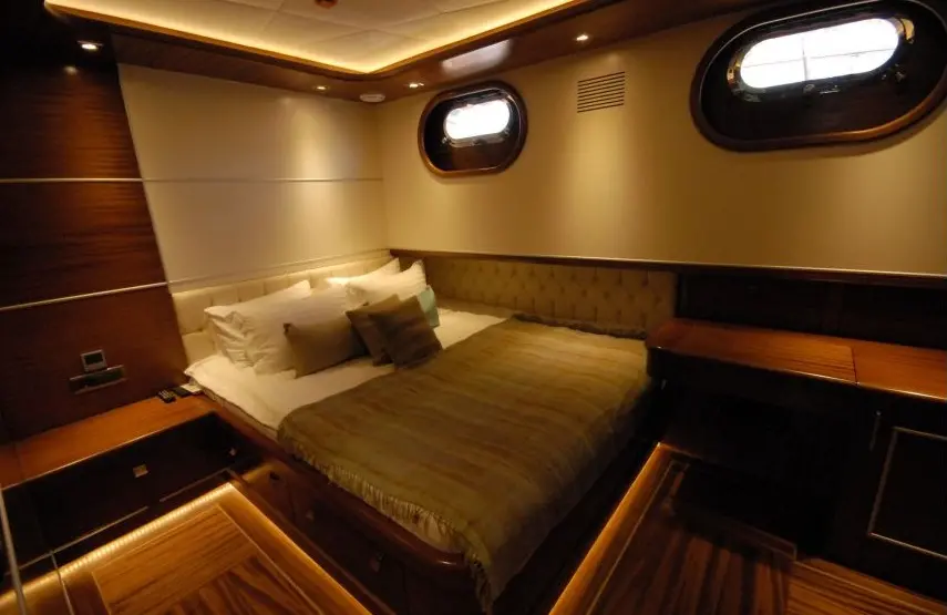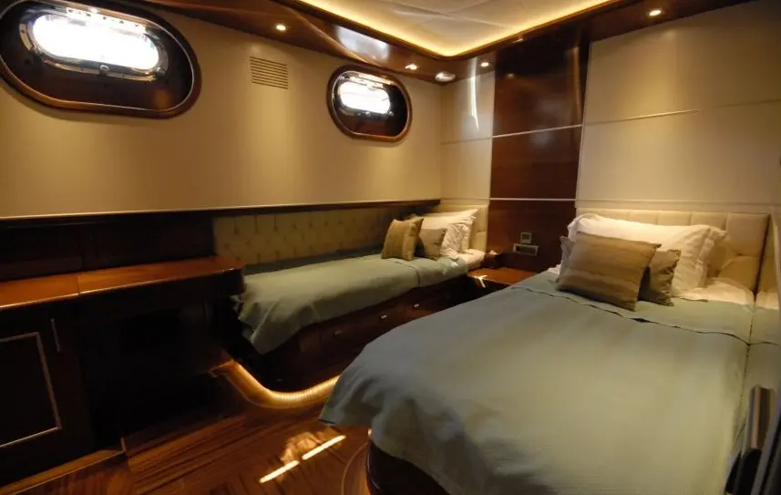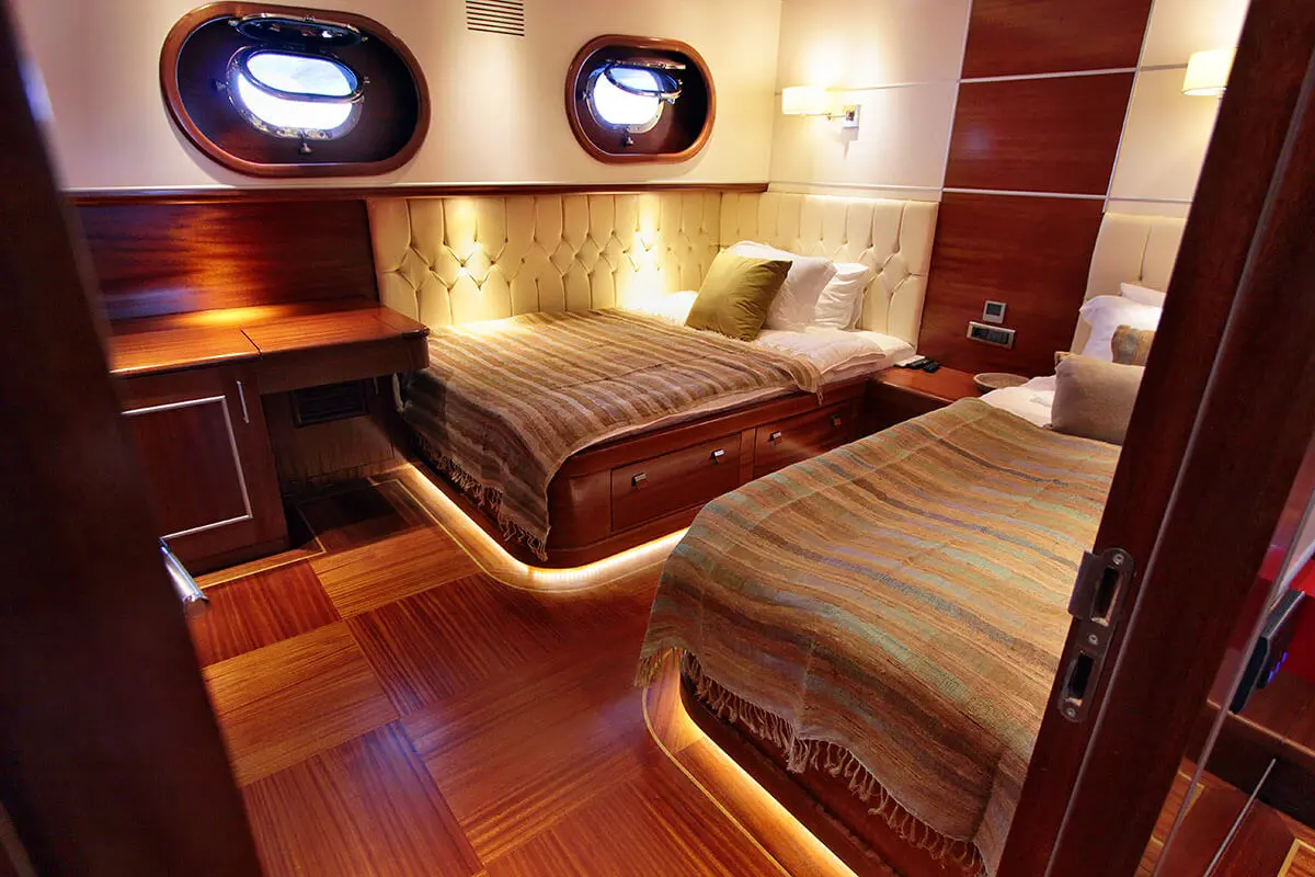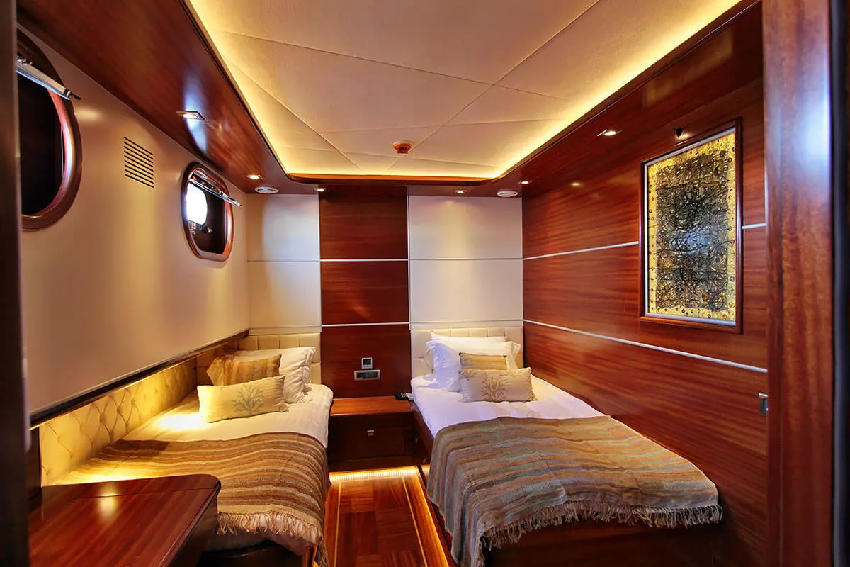 Powered by twin 600 hp Iveco engines and maintained by a dedicated crew of seven, Carpe Diem V navigates the enchanting waters of the Aegean with ease, offering a serene and swift voyage. The accommodations on Carpe Diem V are designed to offer guests a sanctuary of luxury and tranquility at sea. With 2 Master, 2 Double, and 2 Twin cabins, each equipped with air conditioning, en-suite shower boxes, and electric toilettes, guests are assured privacy and comfort throughout their voyage.