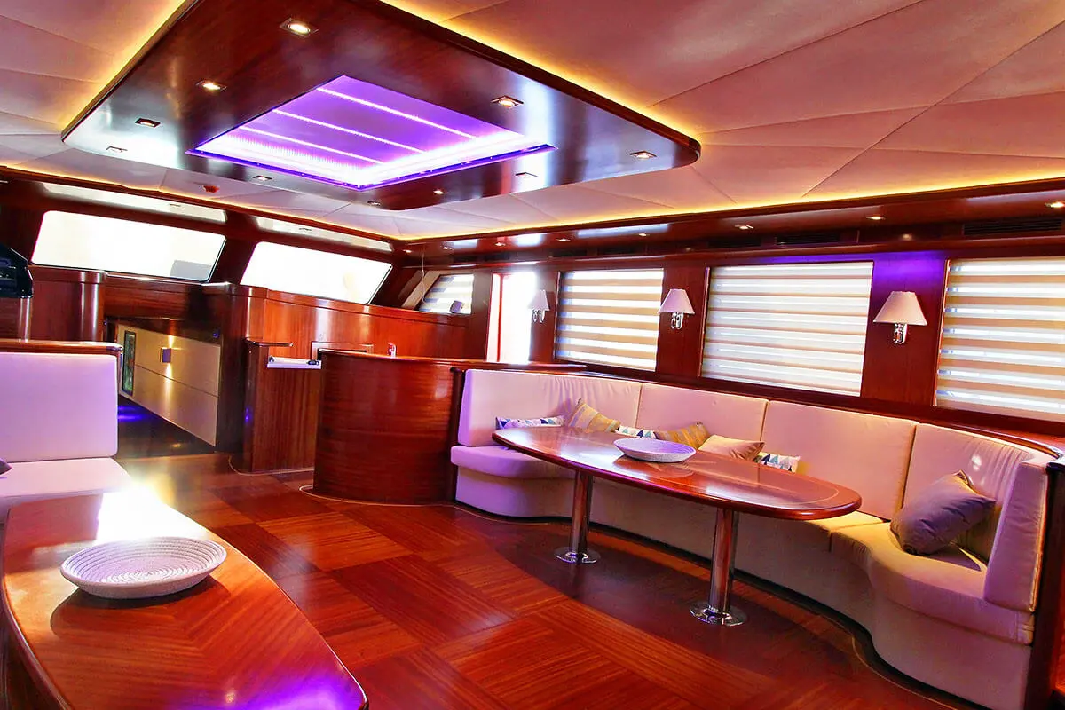 Indoor restaurant, Tv & DVD player in salon and cabins, music system, wireless, jet ski, ringo, water ski, wind surf, canoe