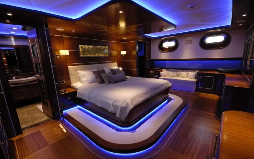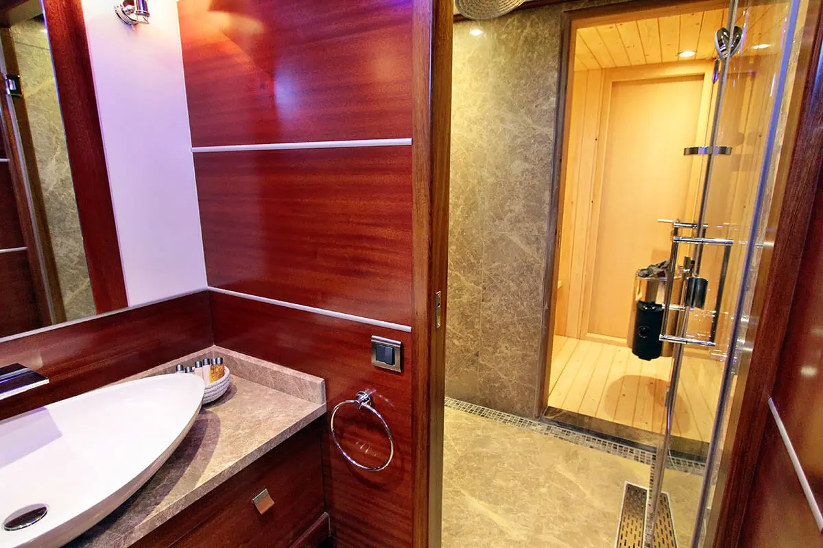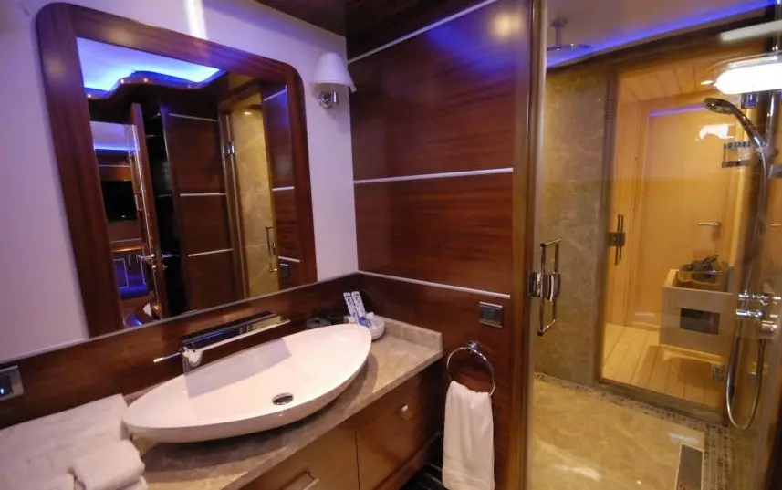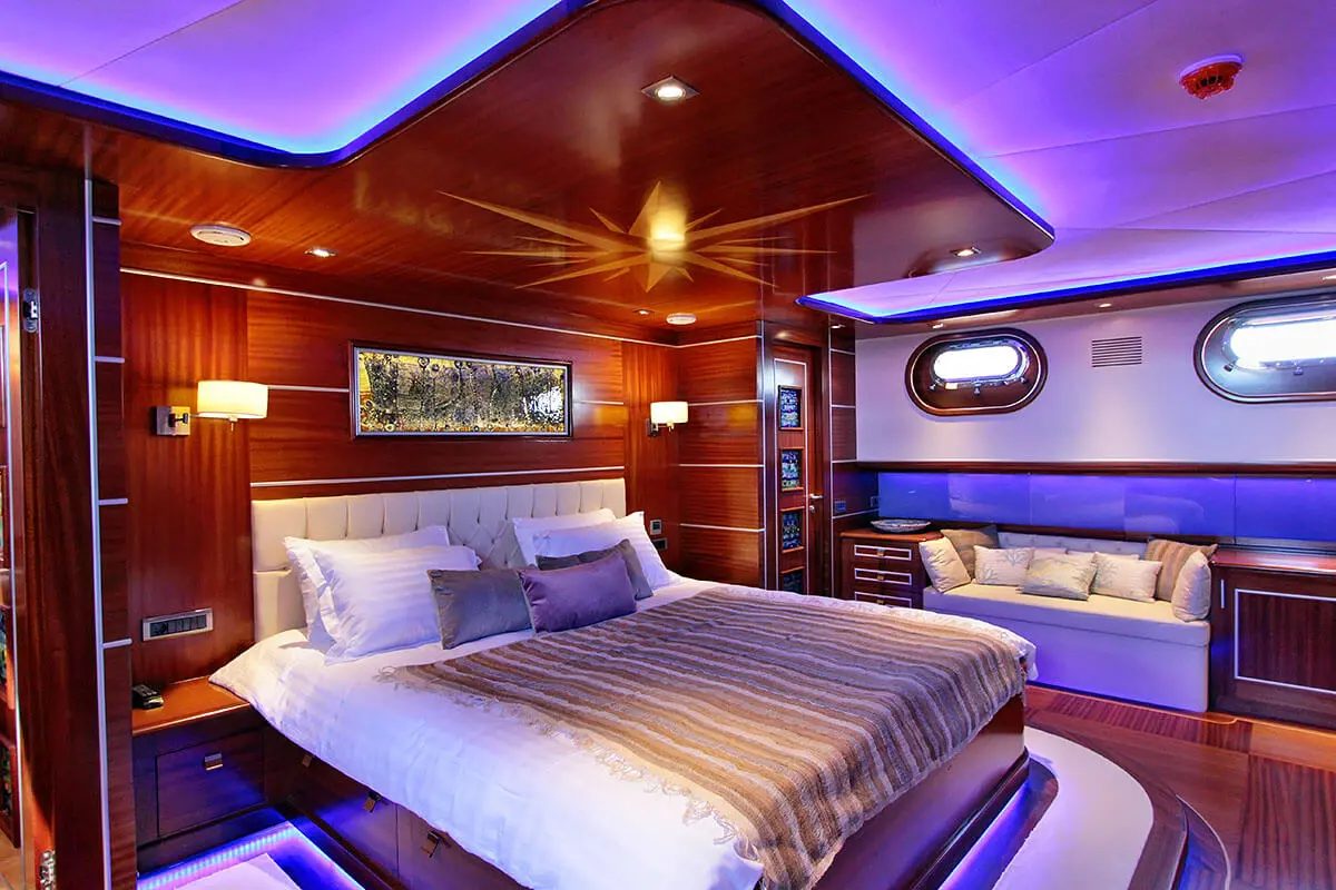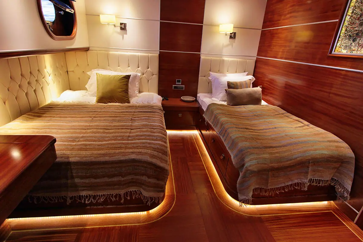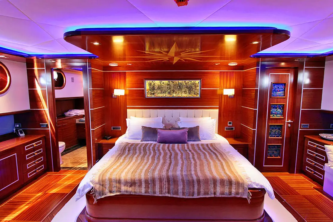 Guests can enjoy a range of watersports, explore the coast on paddle boards, or simply relax on the deck, soaking up the Mediterranean sun and sea breezes. The gulet’s indoor restaurant and salon, equipped with TV, DVD player, and music system, provide the perfect setting for evening gatherings, offering tranquil nights at sea.