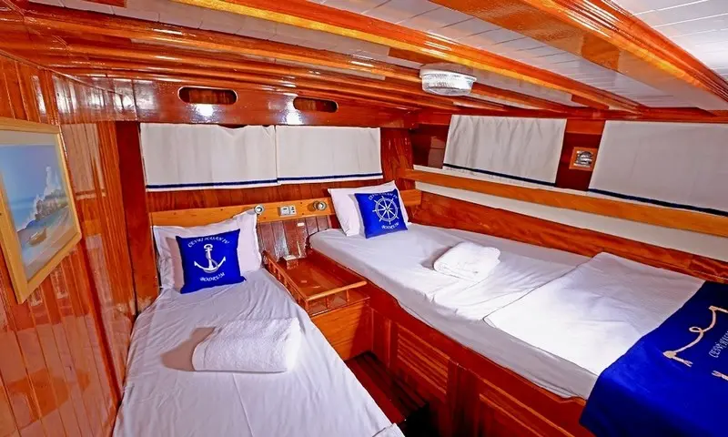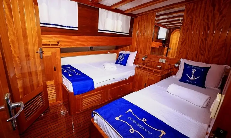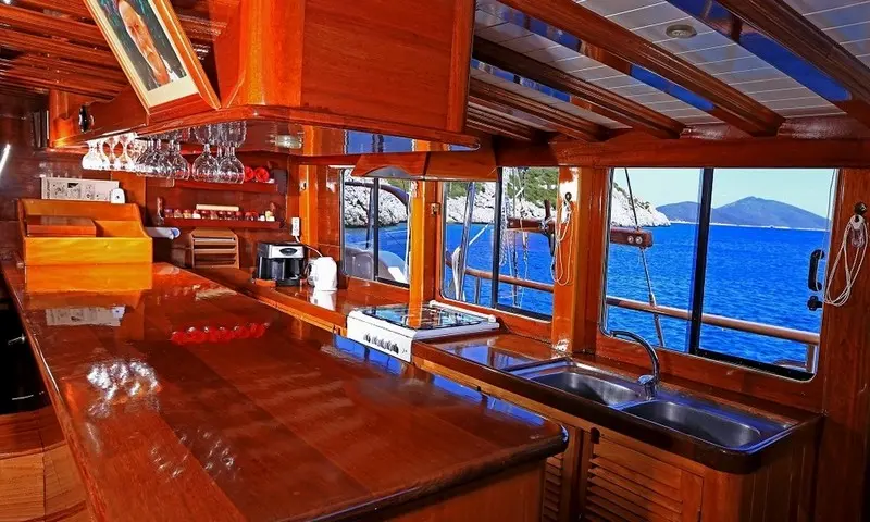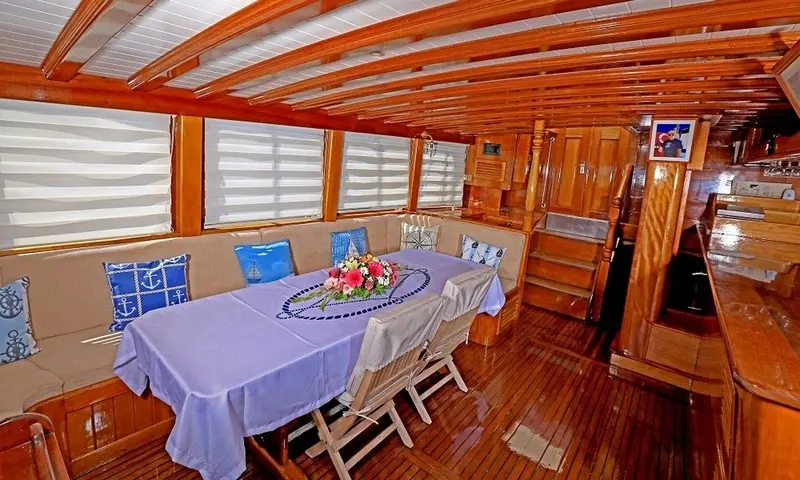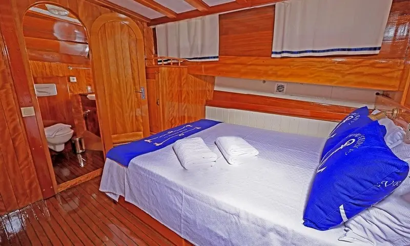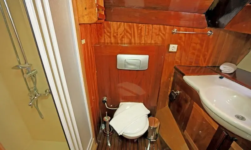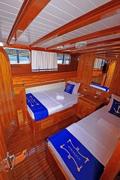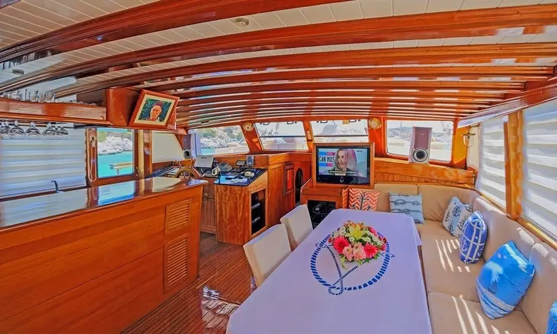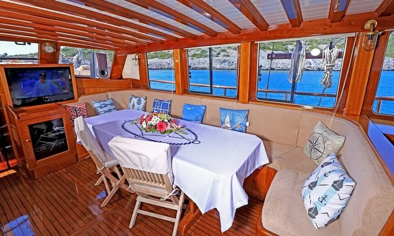Offering accommodation for 12 guests in 2 double and 4 twin cabins, each cabin is a haven of comfort. Featuring air conditioning and ensuite bathrooms, the cabins are designed for privacy and relaxation. The meticulous design of the cabins ensures that every guest experiences the utmost in luxury and privacy, making it a perfect retreat after a day of exploration or leisure. Cevri Hasan IV is equipped with a range of amenities, from the cozy indoor restaurant to the entertainment options available in the salon, ensuring that there is never a dull moment onboard.