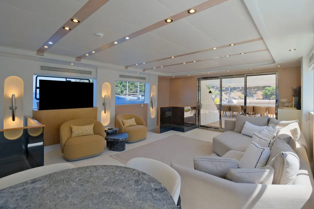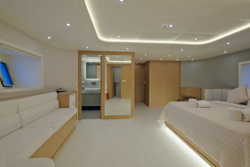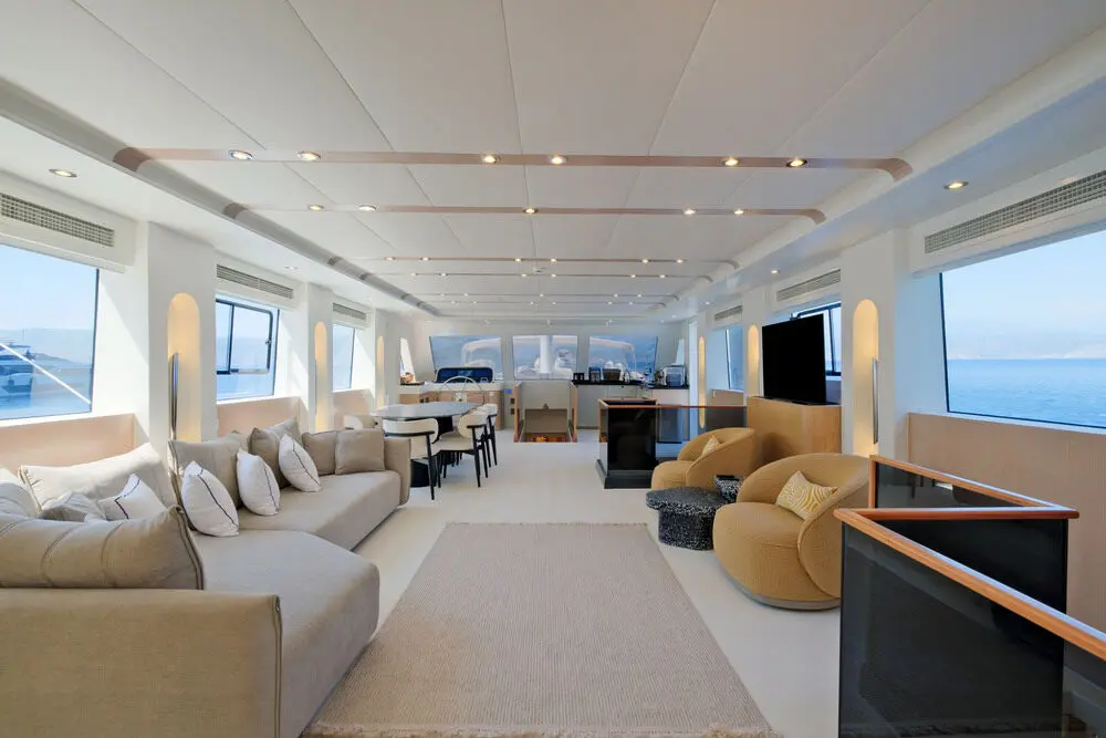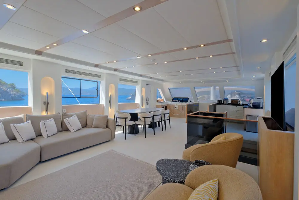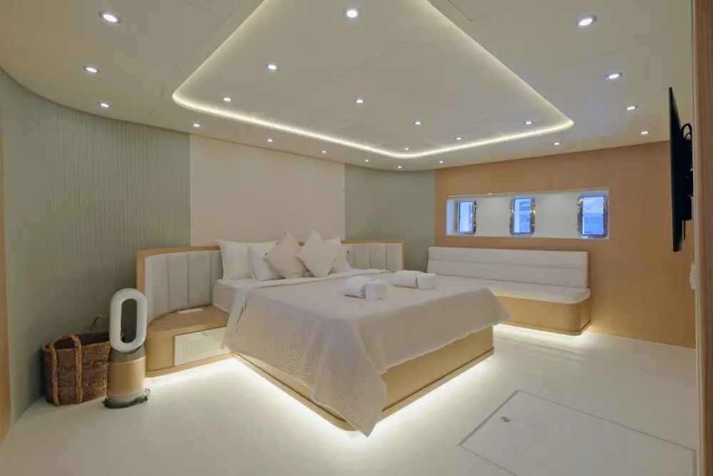 Air-conditioning, Satellite TV, Iphone dock,Unlimited Wi-fi (Cellular reception), Music system, Push flush toilets, Hair dryers, Fire extinguishers, Water -skis, Jet-ski (Optional and extra) E-Foil, Canoe, Wake Board, Paddle Board, Ringo, Snorkeling & Fishing Gear, 8 meters Chase Boat with 350hp (Optional and extra)