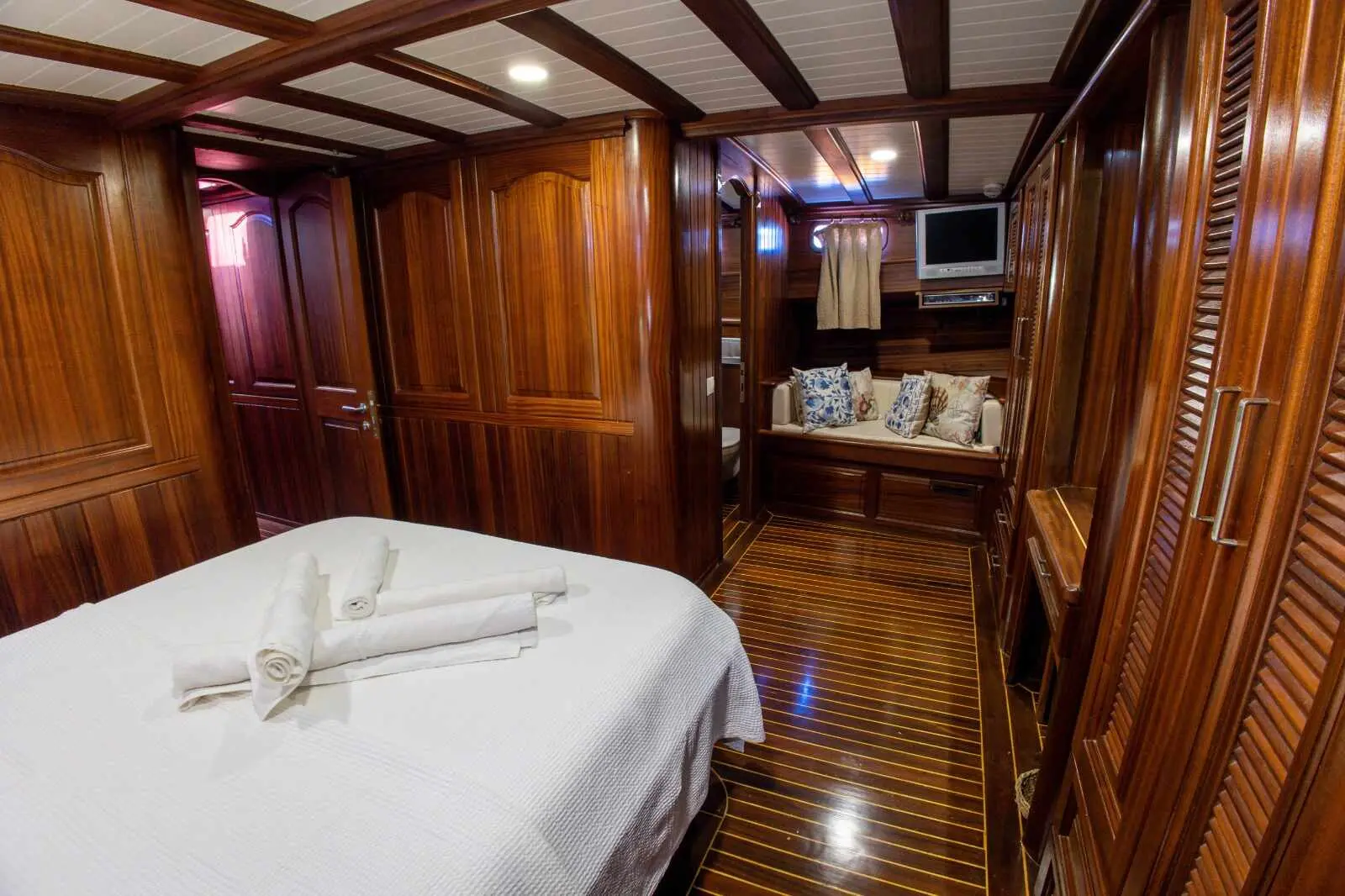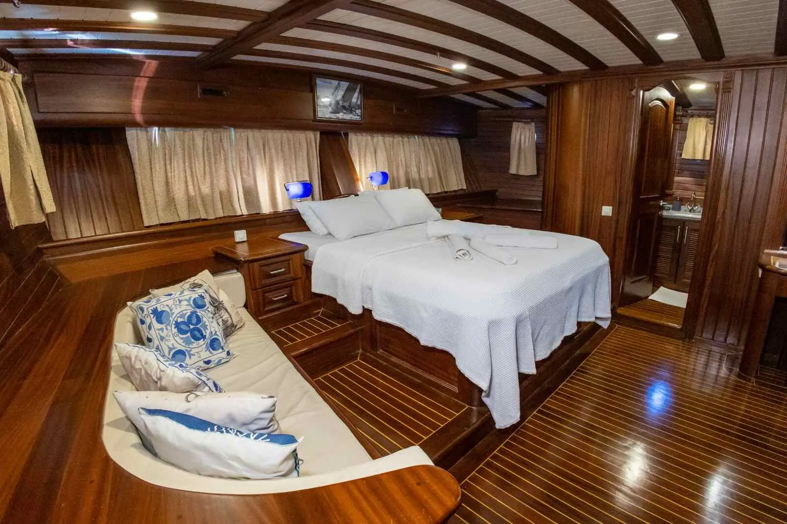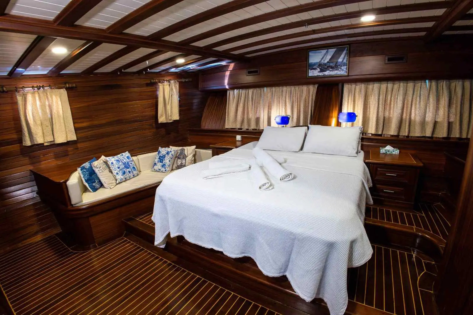 A skilled crew of five, from the captain to the chef, ensures every aspect of your journey aboard Dreamland is catered to perfection, making each moment unforgettable. With 2 Master and 4 Twin cabins, Dreamland offers a sanctuary of comfort and style, each equipped with air conditioning and private bathrooms, reflecting the gulet's commitment to your rest and relaxation.
