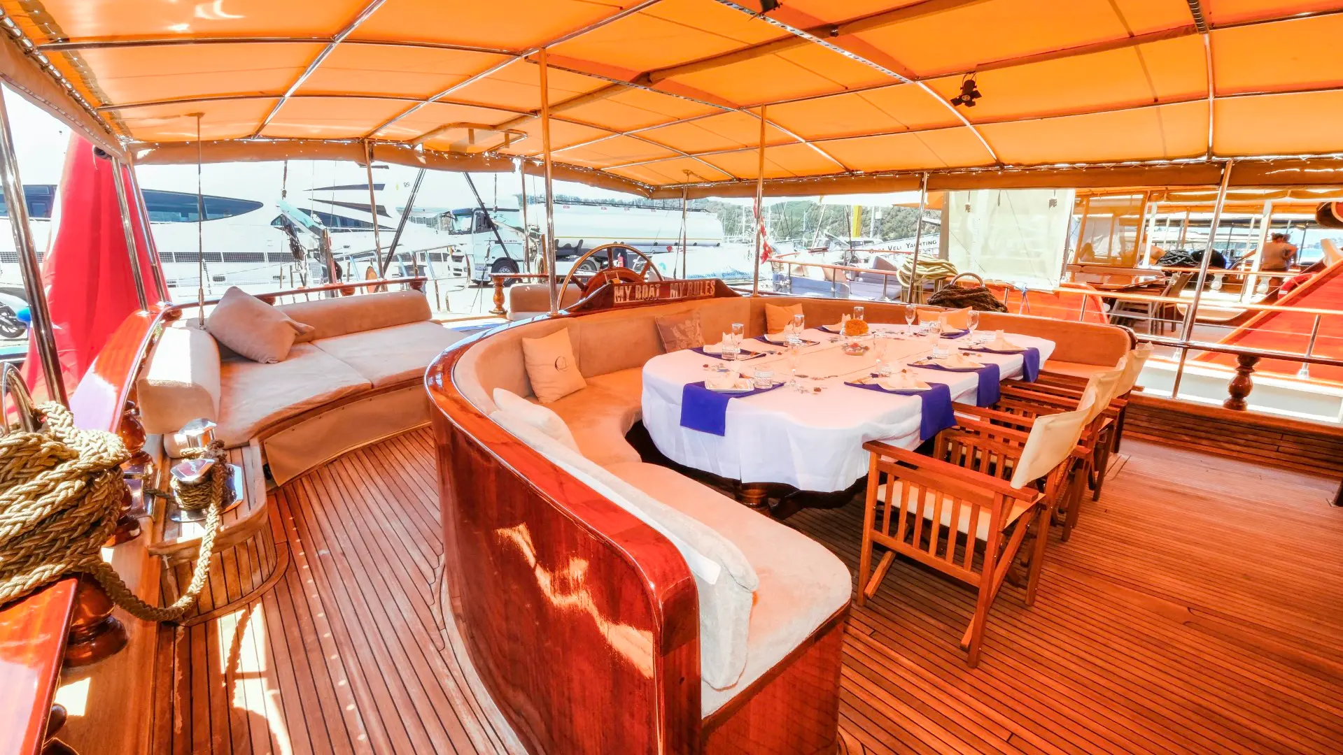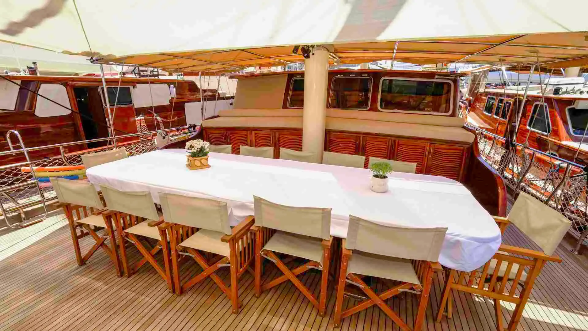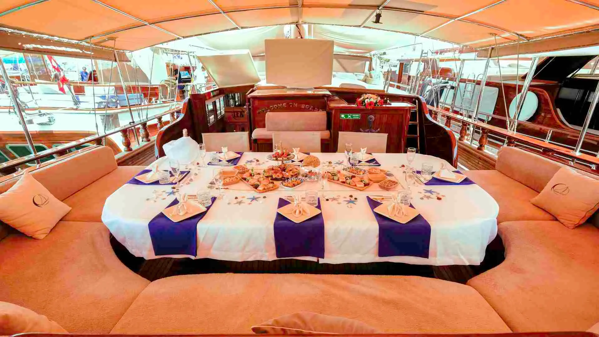 Dining on the Efe Burak is an experience in itself. Meals can be enjoyed in the elegant indoor dining area or outside on the deck, where guests can take in the breathtaking views as they dine. The atmosphere is relaxed yet sophisticated, perfect for savoring the culinary delights prepared by the onboard chef.