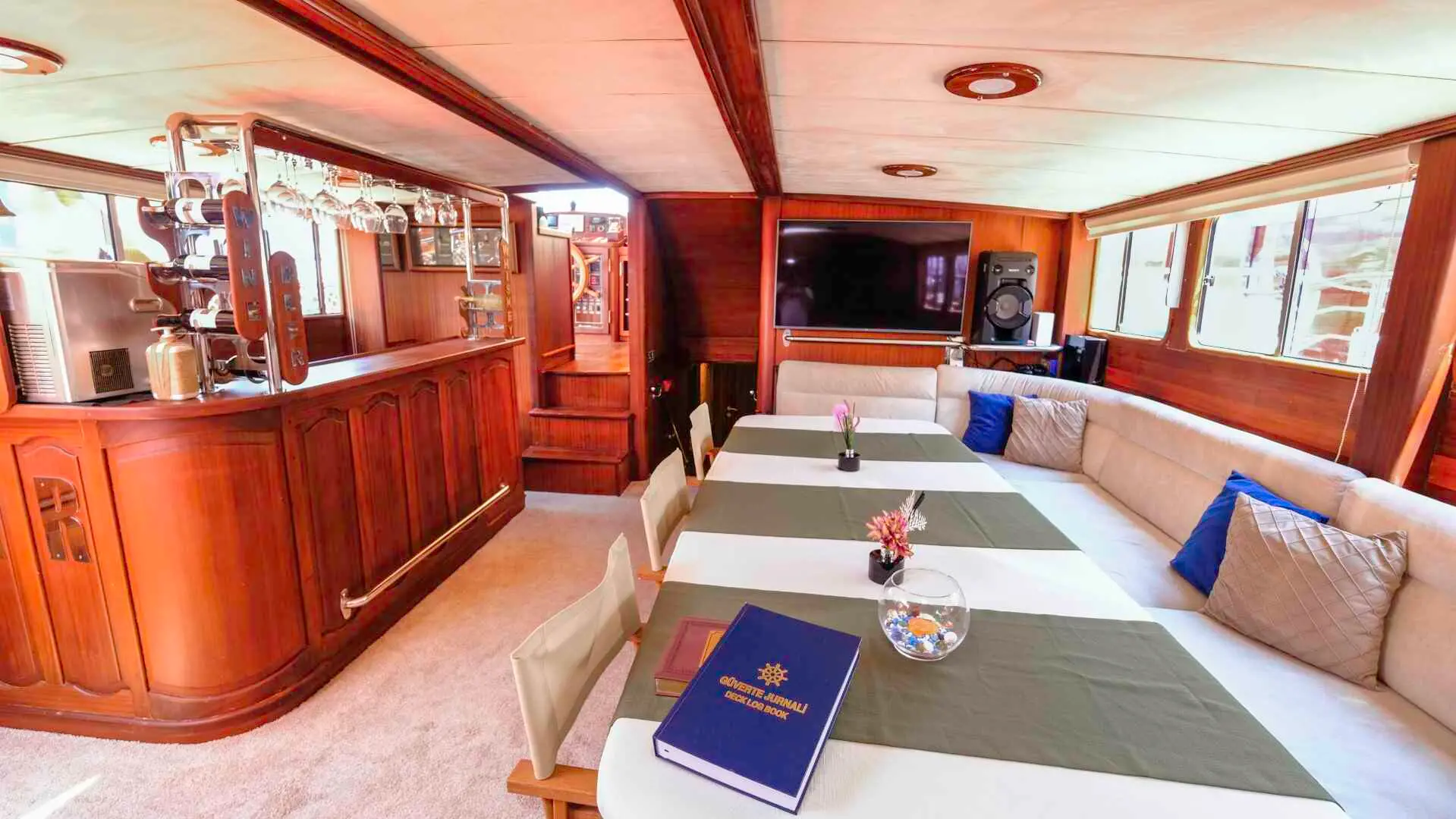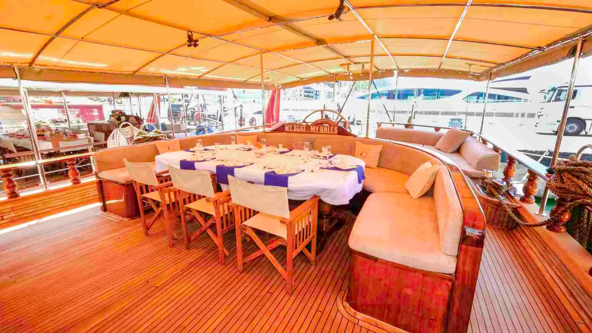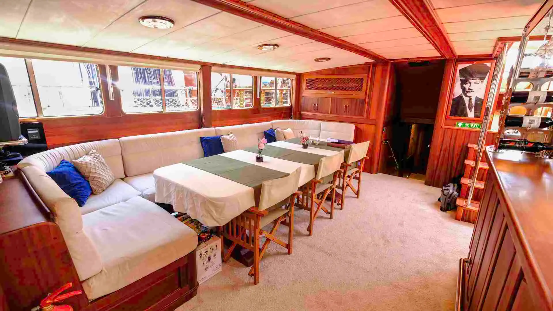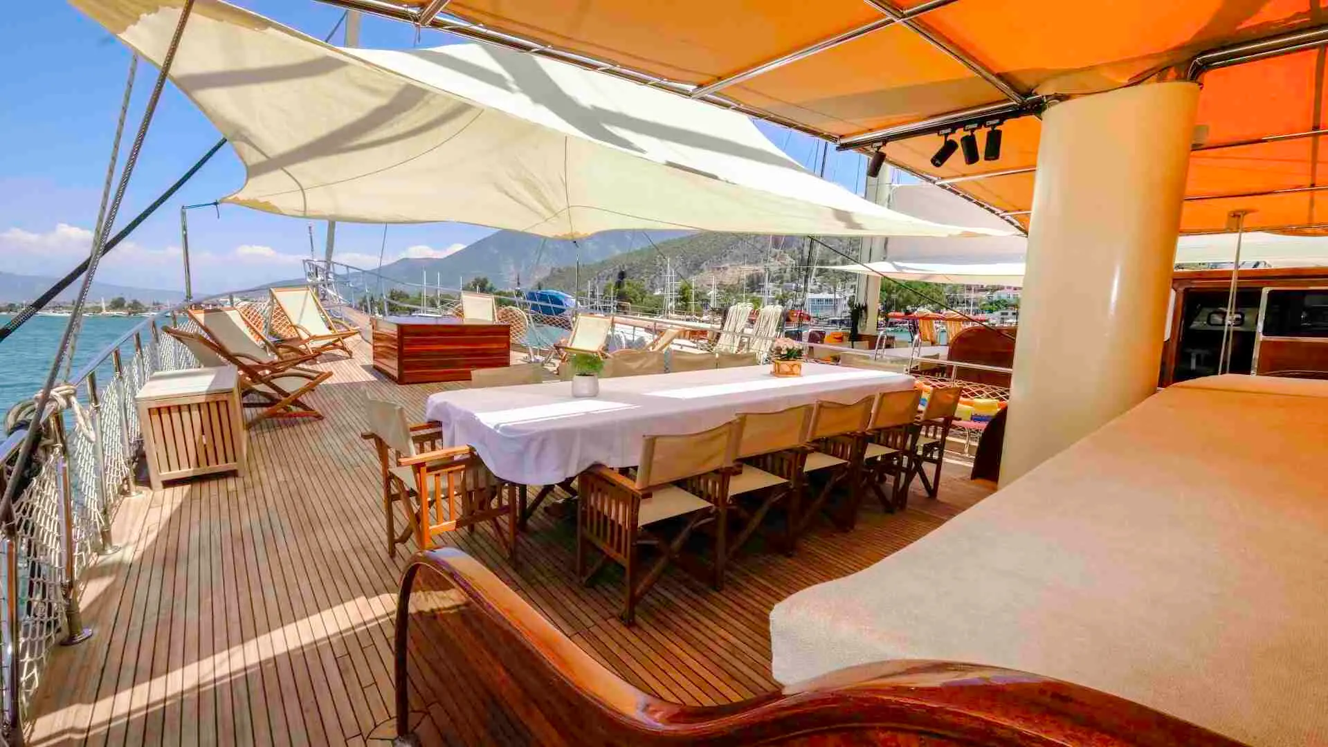 Dining on the Efe Burak is an experience in itself. Meals can be enjoyed in the elegant indoor dining area or outside on the deck, where guests can take in the breathtaking views as they dine. The atmosphere is relaxed yet sophisticated, perfect for savoring the culinary delights prepared by the onboard chef.