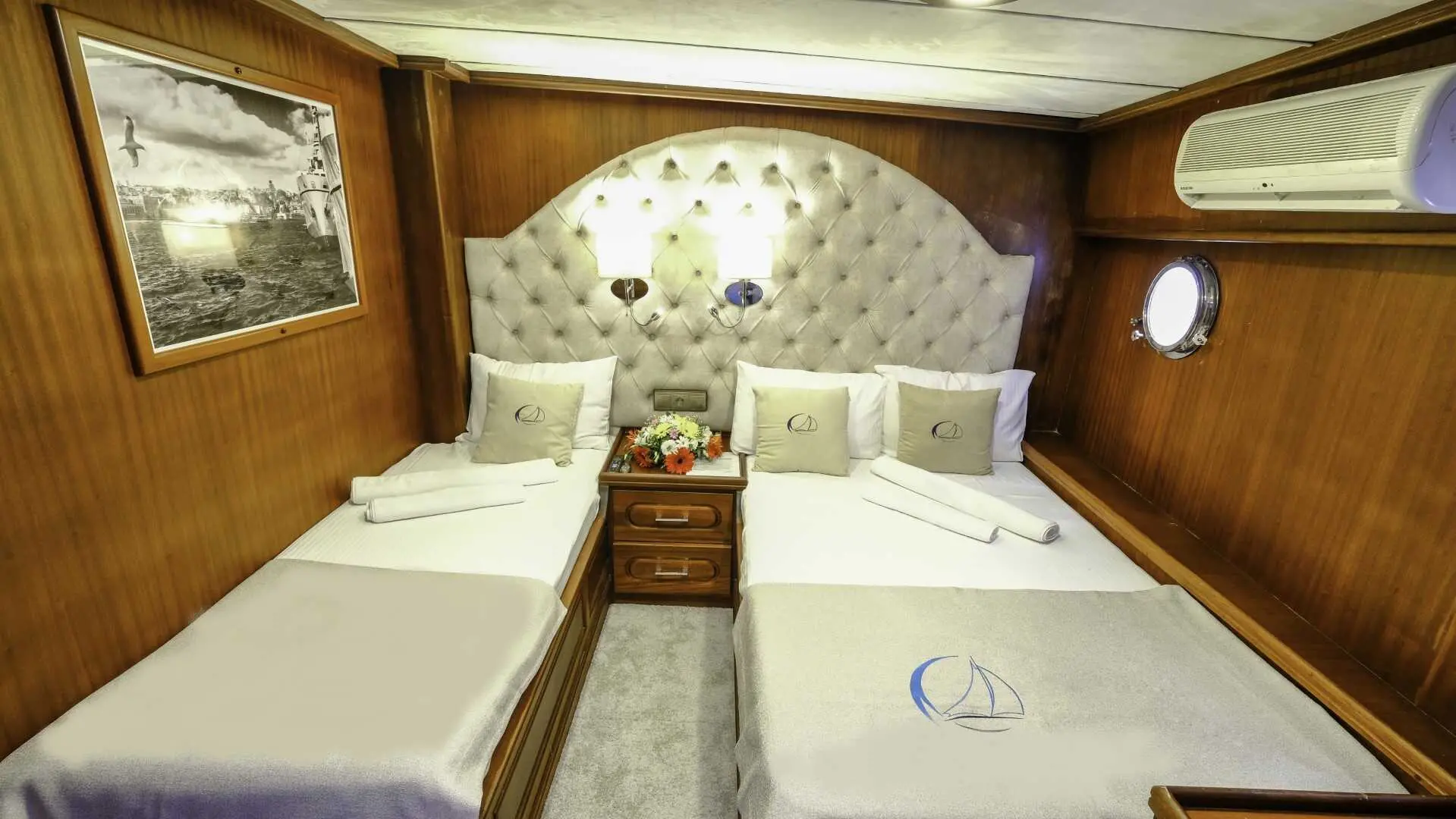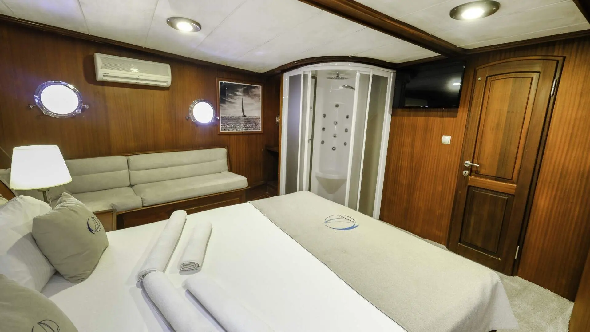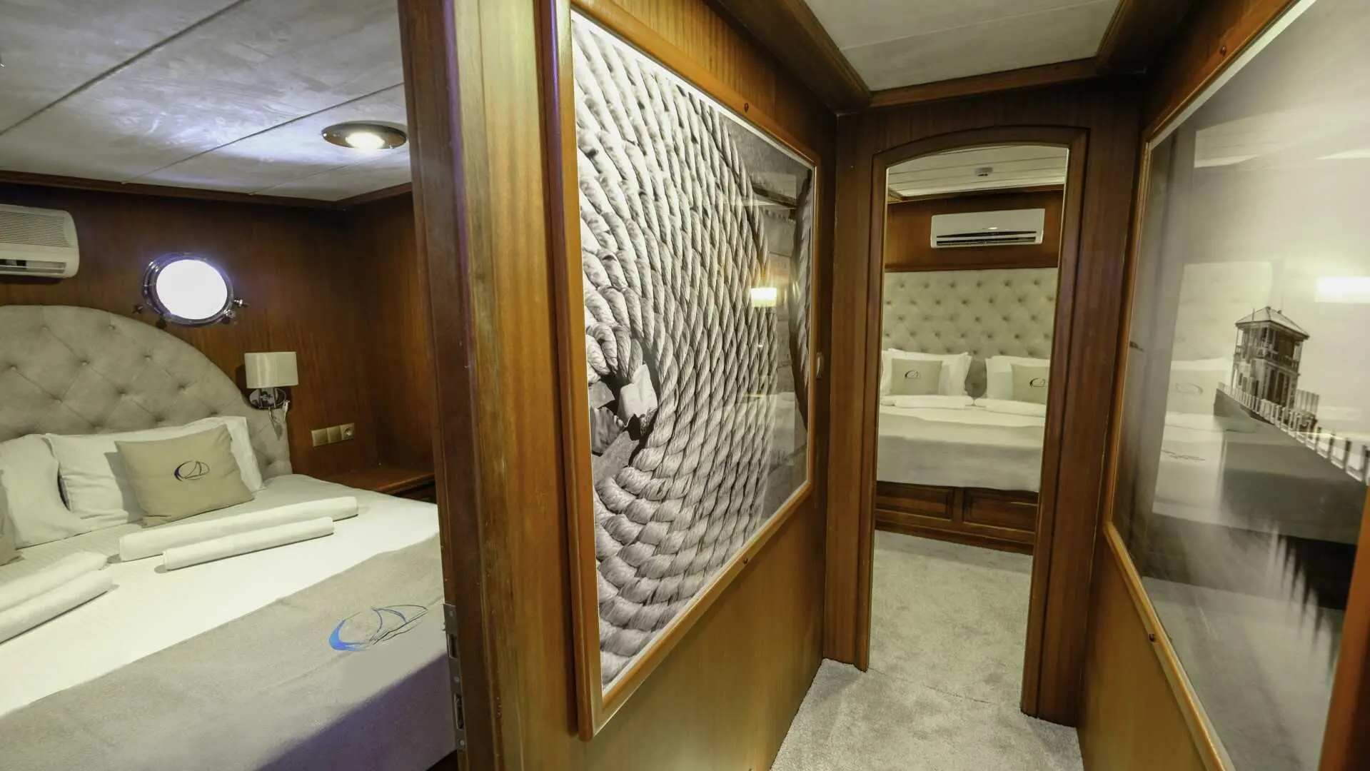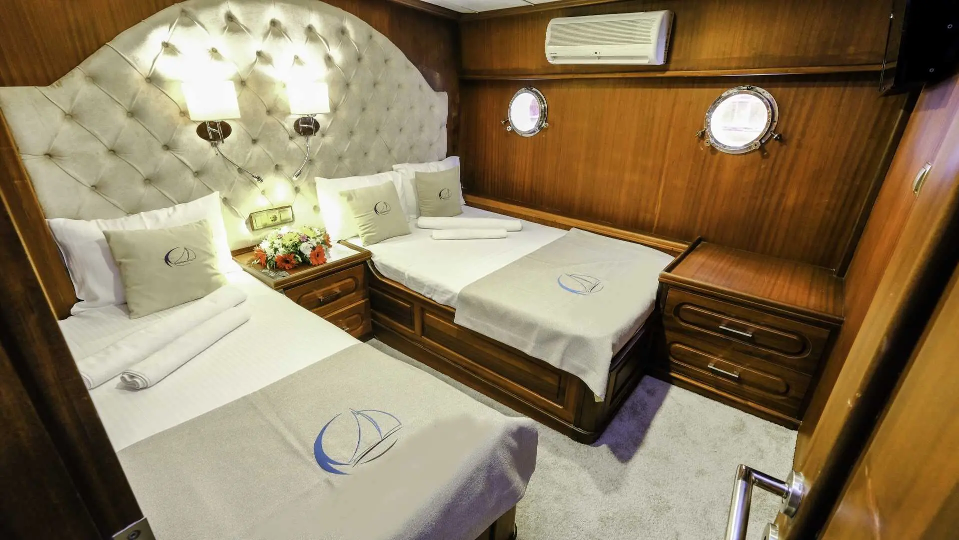 The Efe Burak offers accommodation for up to 12 guests across six beautifully appointed cabins. The cabin configuration includes two master cabins, two double cabins, and two triple cabins, providing flexible options to cater to different group sizes and compositions.