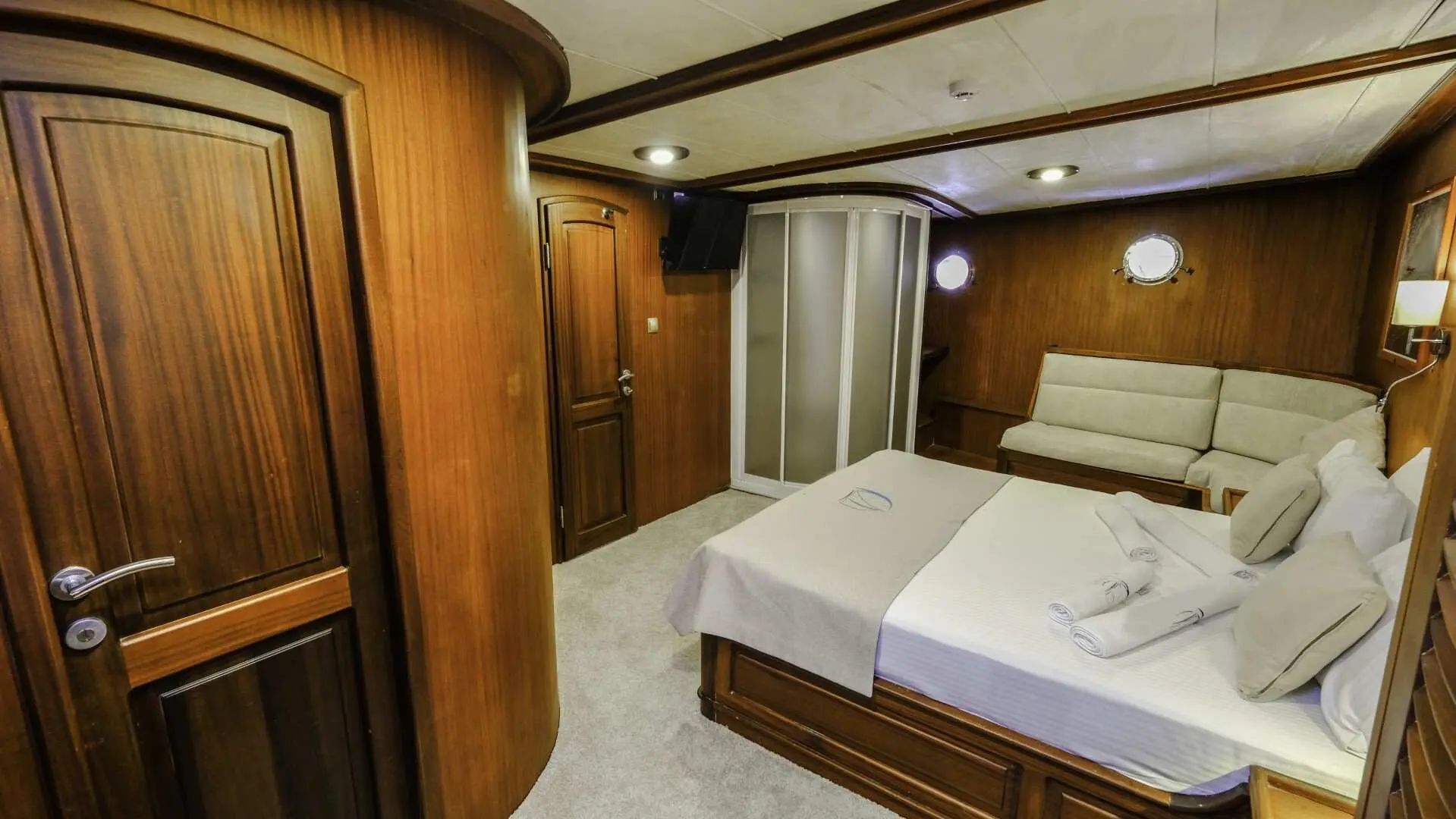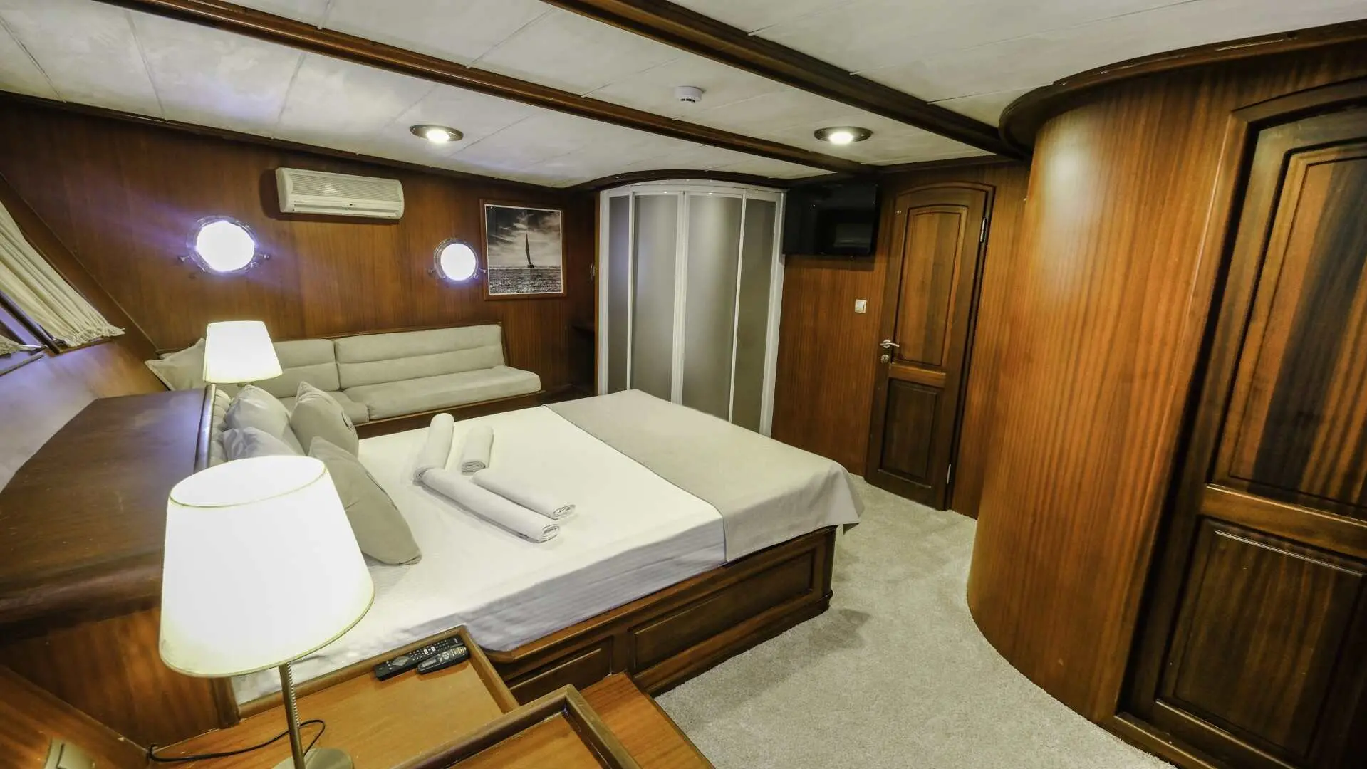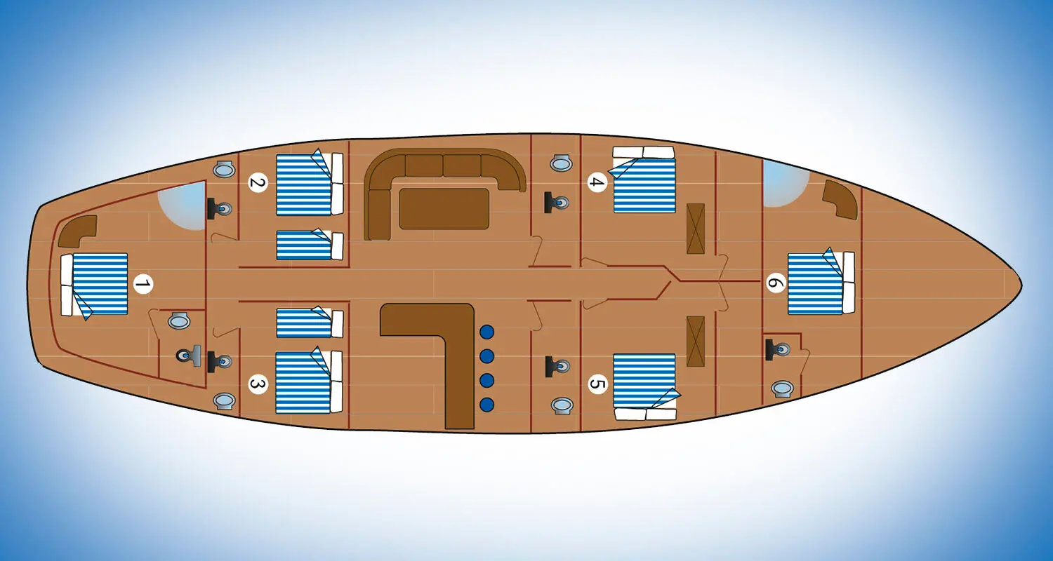 The Efe Burak offers accommodation for up to 12 guests across six beautifully appointed cabins. The cabin configuration includes two master cabins, two double cabins, and two triple cabins, providing flexible options to cater to different group sizes and compositions.
