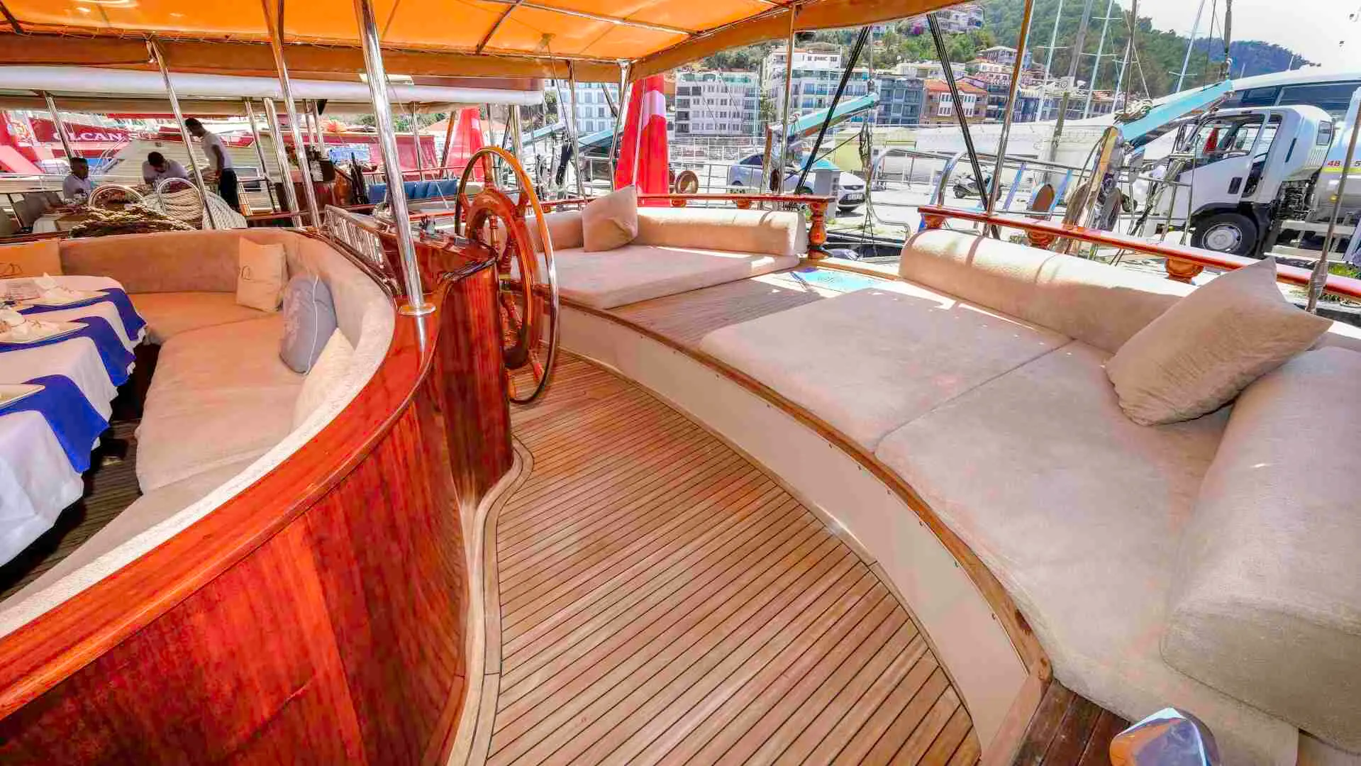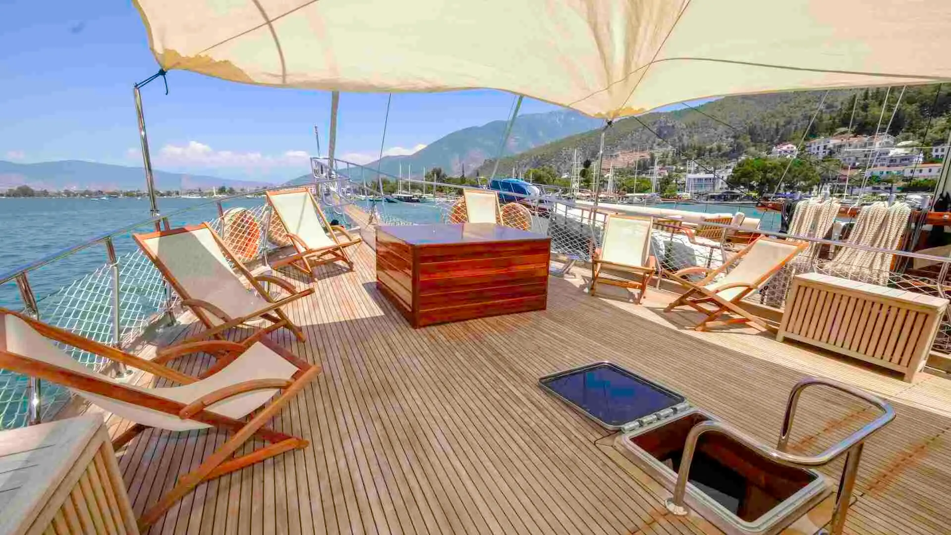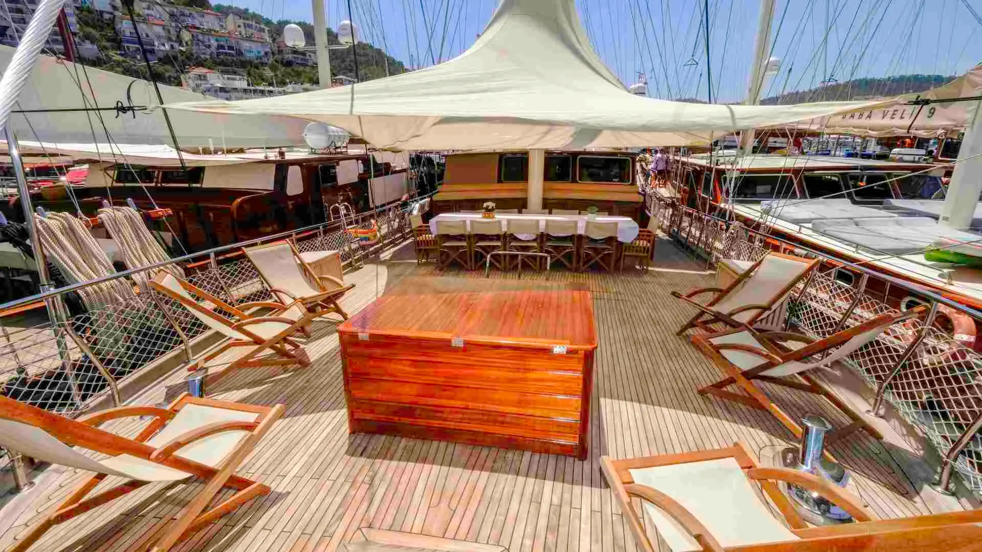 The exterior of Gulet Efe Burak features a classic design with modern touches, creating an inviting and stylish ambiance. The spacious deck is perfect for sunbathing, dining al fresco, or simply enjoying the stunning sea views. The yacht's clean lines and elegant woodwork are a testament to the quality craftsmanship that went into its construction.
