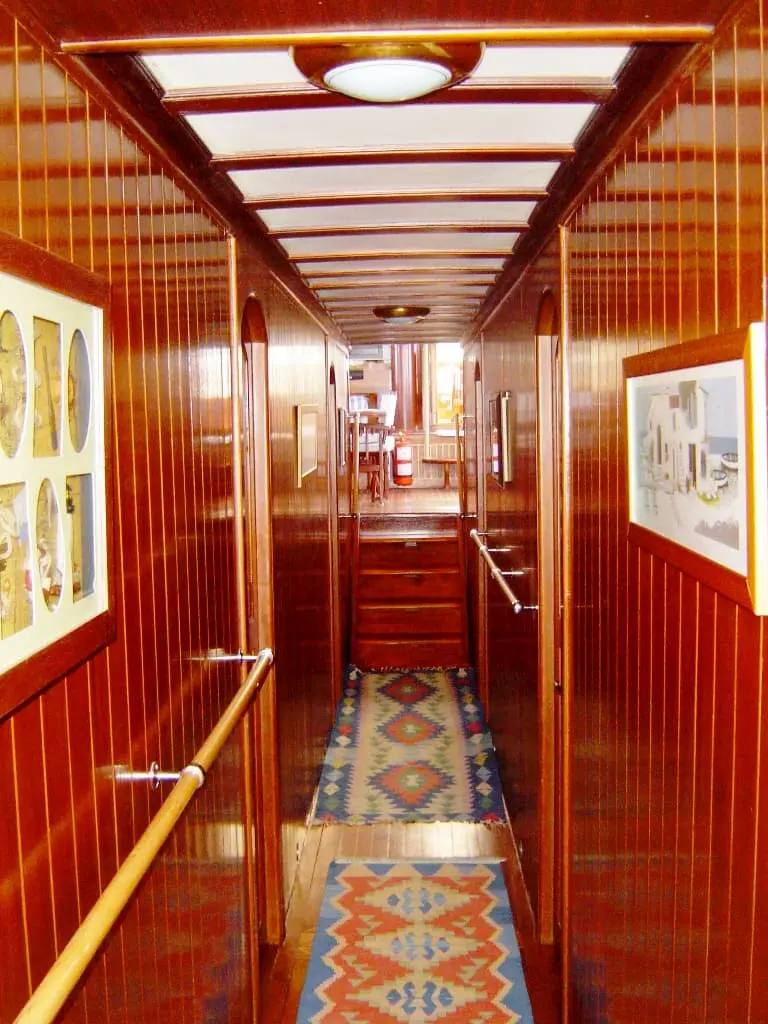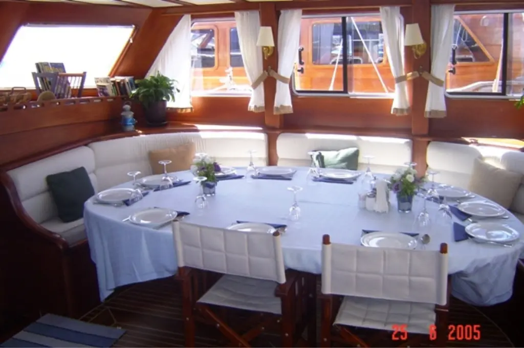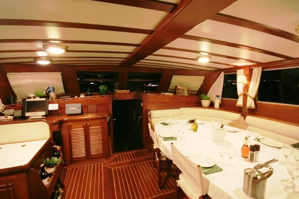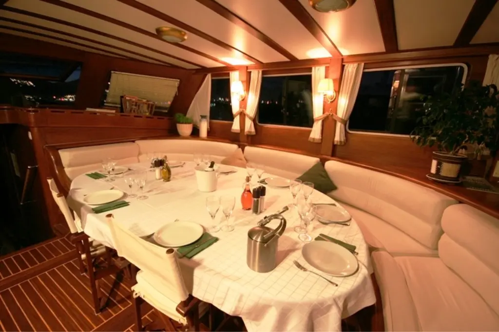 Enjoy gourmet meals prepared by the onboard chef in the elegant dining area, or relax in the cozy salon with entertainment options.
