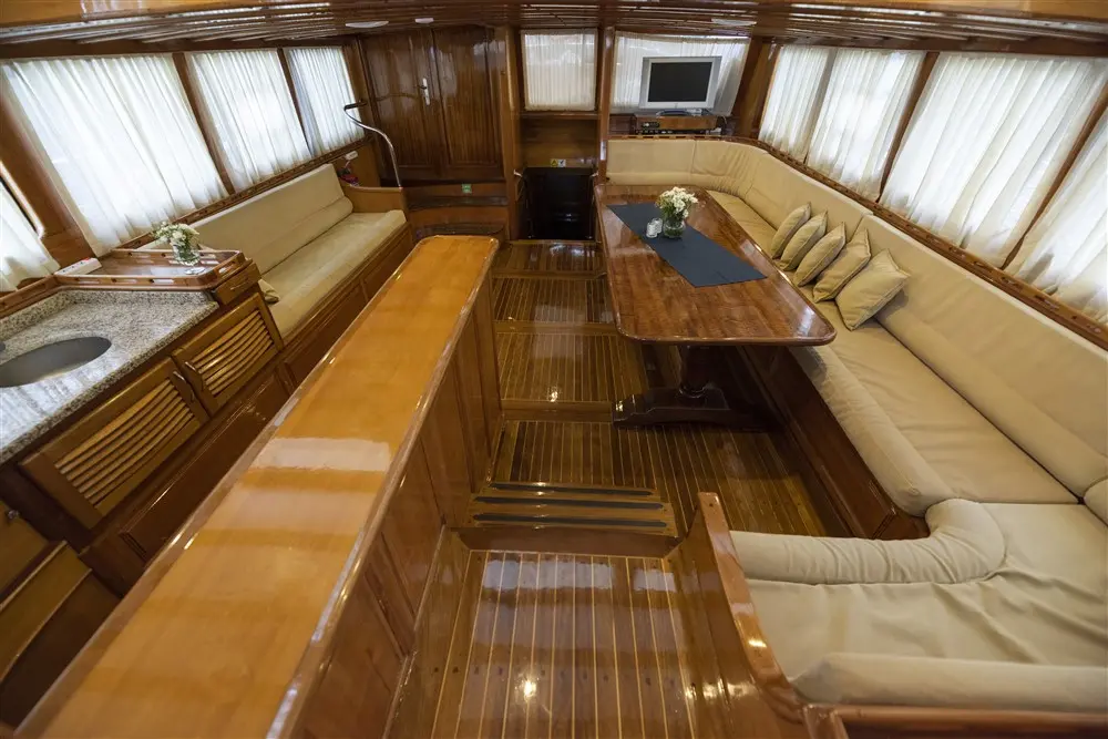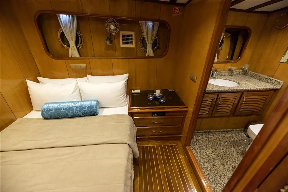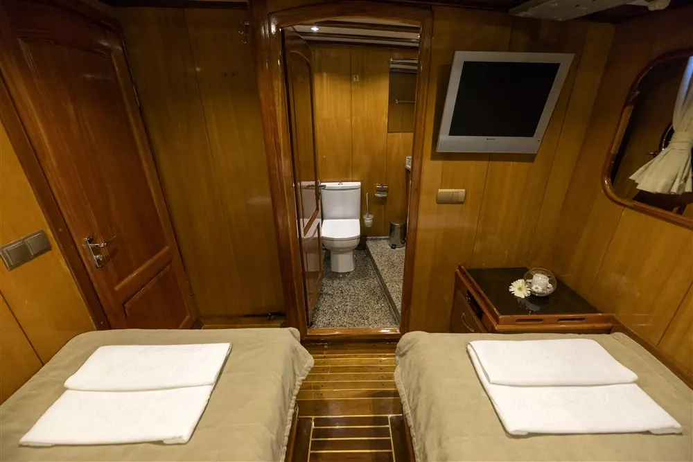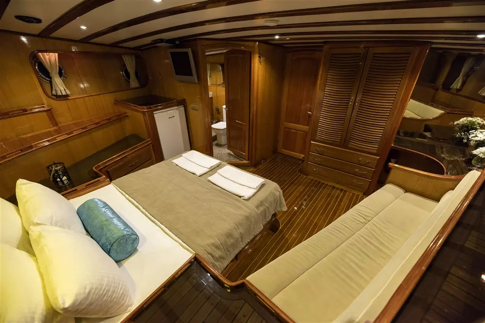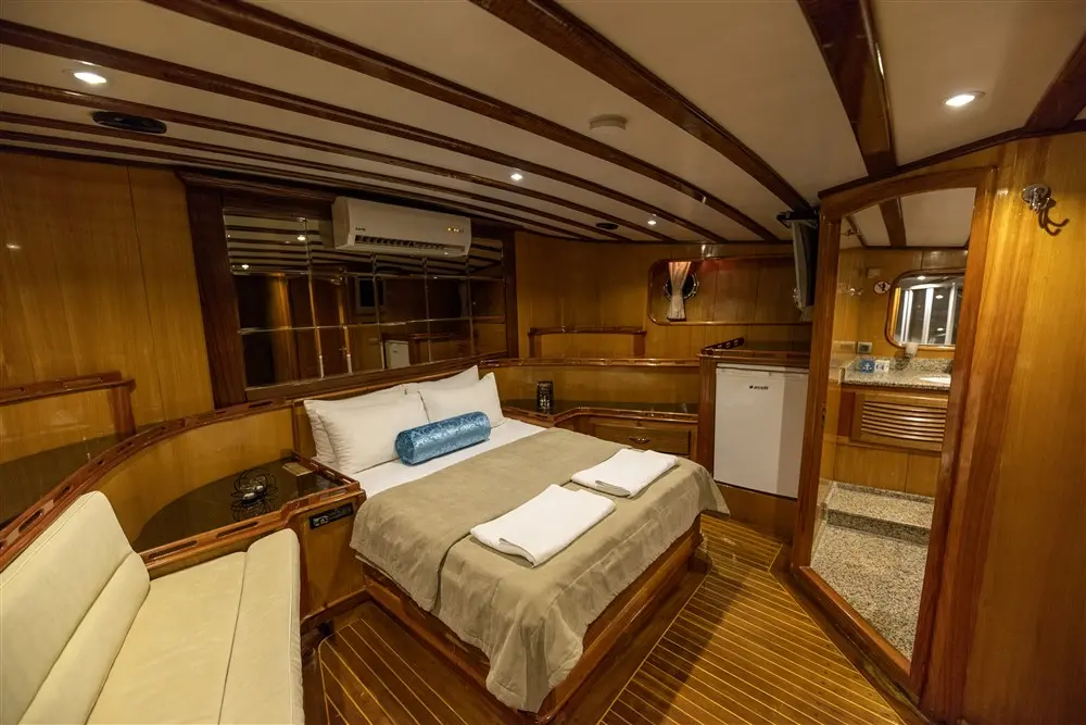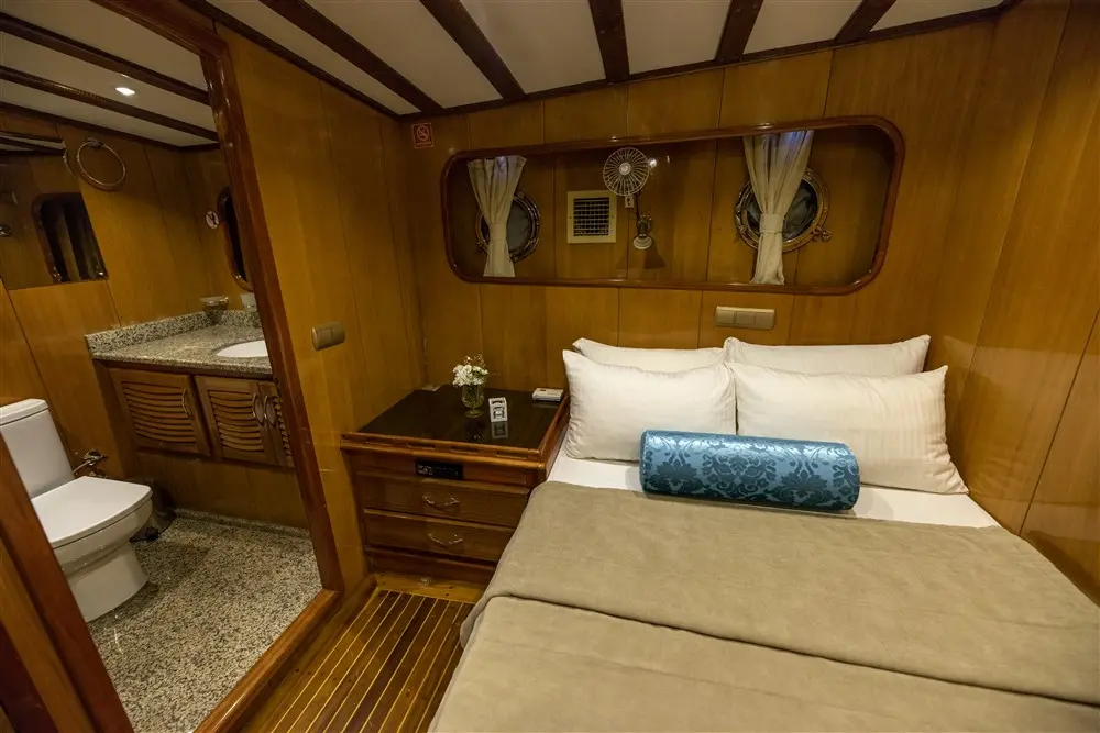 Since its launch, Kayhan V has seen several refurbishments to enhance guest comfort and modernize its facilities. The updates have respectfully preserved the gulet’s original aesthetics while introducing contemporary amenities, making every voyage both authentic and luxurious. The gulet’s interior is a perfect blend of traditional craftsmanship and modern comfort, with six well-appointed cabins—two master suites, two double, and two twin cabins—all featuring en-suite facilities and air conditioning for a restful night's sleep.