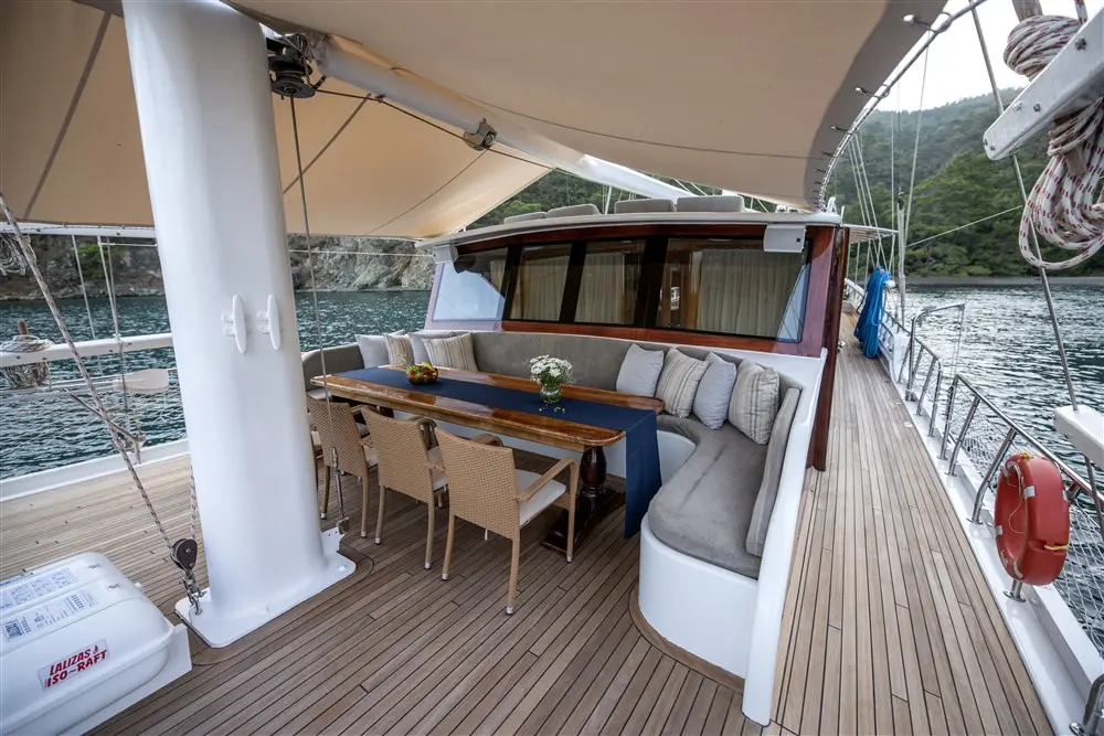 Fethiye, the gulet's base port, offers access to the stunningly beautiful Turkish Riviera. From here, you can explore ancient ruins, secluded bays, and vibrant local markets, making each sailing route a discovery on its own. Discover popular destinations like Göcek, Marmaris, and the secluded bays of the Blue Cruise route, each offering unique sights and experiences.The onboard dining experience is a highlight of any gulet voyage. Enjoy fresh, locally-sourced ingredients prepared by the onboard chef, offering a taste of authentic Turkish and Mediterranean cuisine.