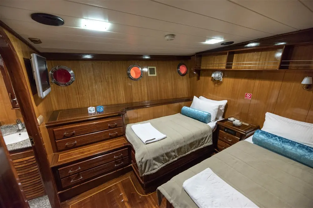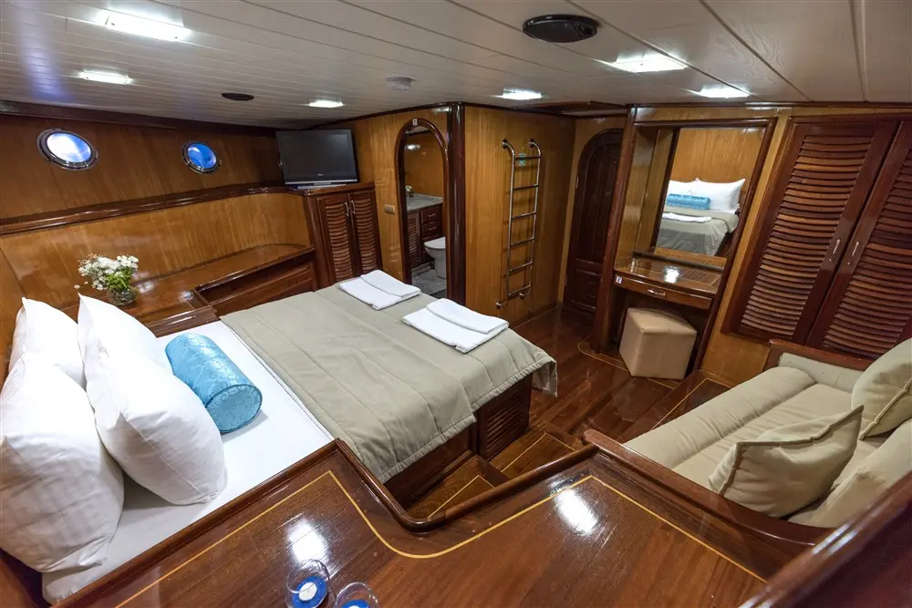 The interior of the Kayhan VIII is a testament to fine craftsmanship, featuring a mix of classic and contemporary design elements. With six elegantly appointed cabins, including two master suites, two doubles, and two twins, each space is designed to provide guests with privacy, comfort, and a touch of luxury.