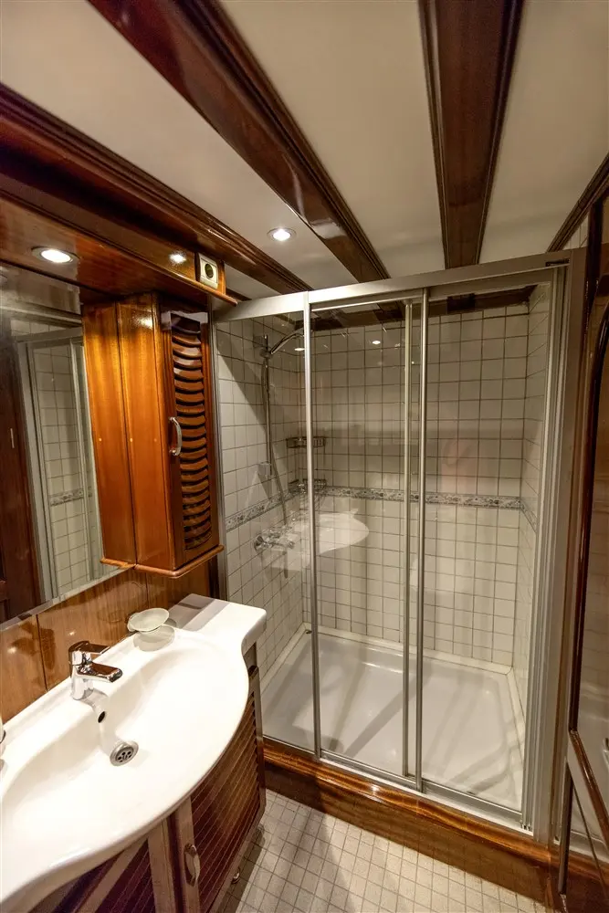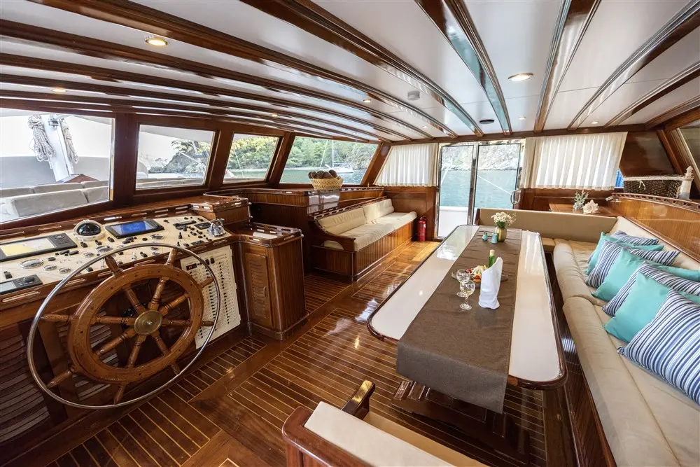 With a beam of 8.50 meters and a draft of 3.50 meters, Kayhan Kaptan offers a stable and comfortable cruise. Its design optimizes both interior and deck spaces, making it ideal for group gatherings and intimate moments alike. Powered by twin 450 hp Iveco engines and equipped with twin 27 kW Onan generators, Kayhan Kaptan cruises at a gentle speed of 11 knots. Its large fuel and fresh water tanks allow for extended voyages without frequent stops.