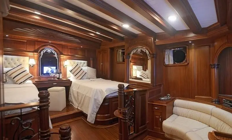 The master cabins are spacious and lavishly furnished, featuring king-sized beds, luxurious linens, and state-of-the-art entertainment systems, providing a serene and indulgent onboard experience. The twin cabin, while smaller, is equally well-appointed, making it perfect for children or singles as part of a larger group.