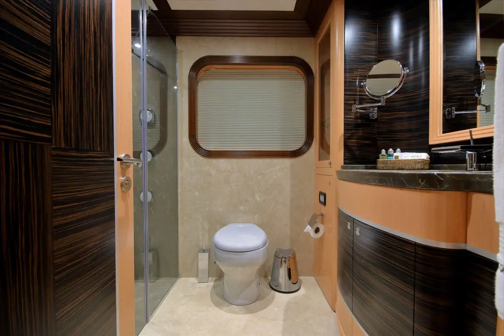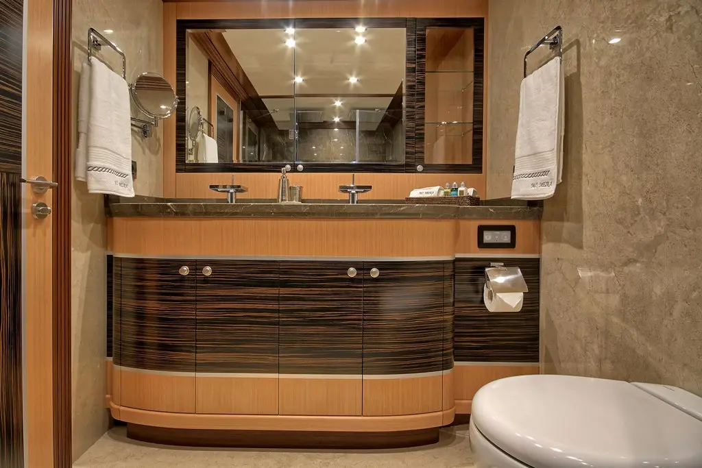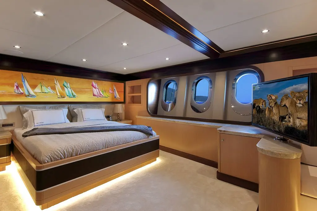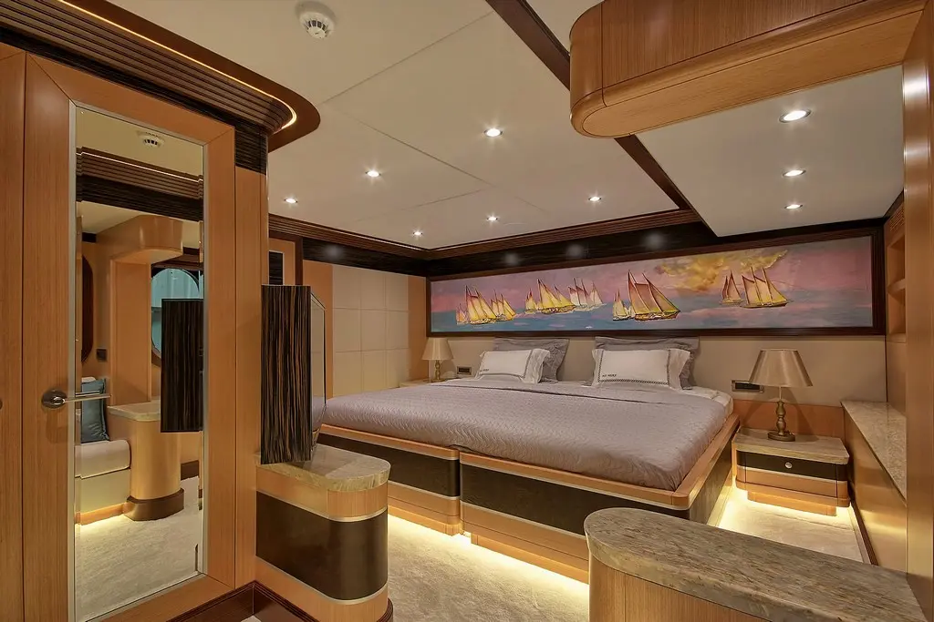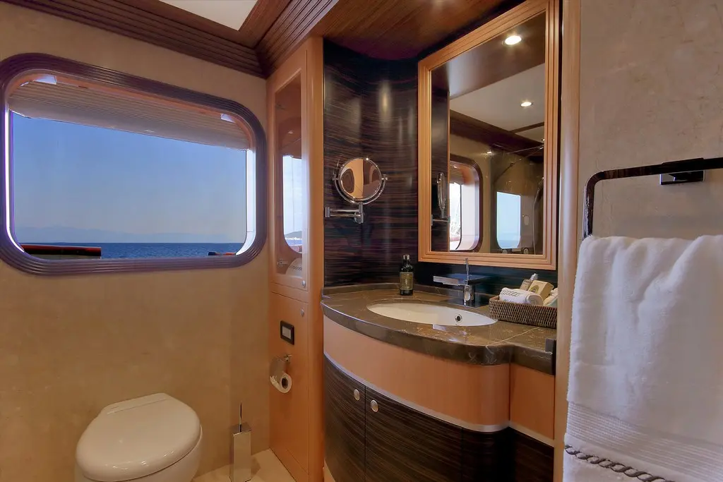 The master suite is the crown jewel of Meira’s accommodations. It features panoramic windows offering sweeping sea views, a plush king-sized bed, and elegant furnishings. The en-suite bathroom is equipped with modern amenities, perfect for unwinding after a day at sea.