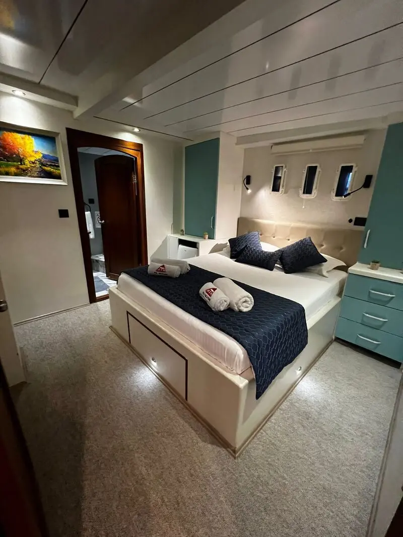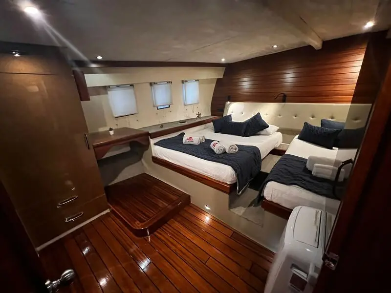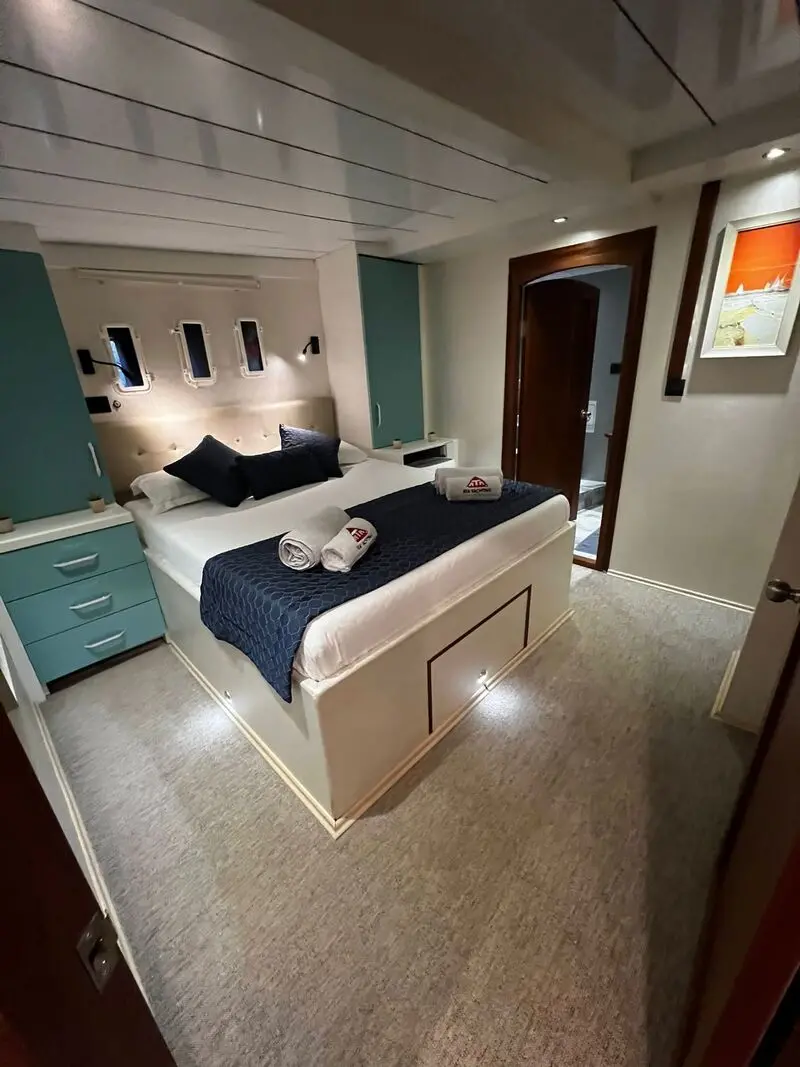 The master cabins offer spacious accommodations with queen-sized beds, luxurious linens, and ample storage, making them perfect retreats after a day of sun and sea. The twin cabins are ideal for younger guests or singles, featuring comfortable beds and all the necessary amenities for a pleasant stay.
