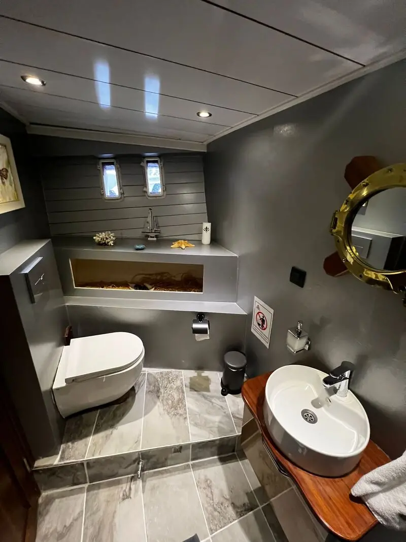 The 2019 refit brought significant enhancements to Mrs Elcih’s interior and amenities, upgrading its comfort and style to meet the highest standards of luxury gulet travel. Mrs Elcih features six beautifully designed cabins: four master suites and two twin cabins. Each cabin is equipped with air conditioning, en-suite bathrooms, and stylish furnishings, providing a private oasis for guests.