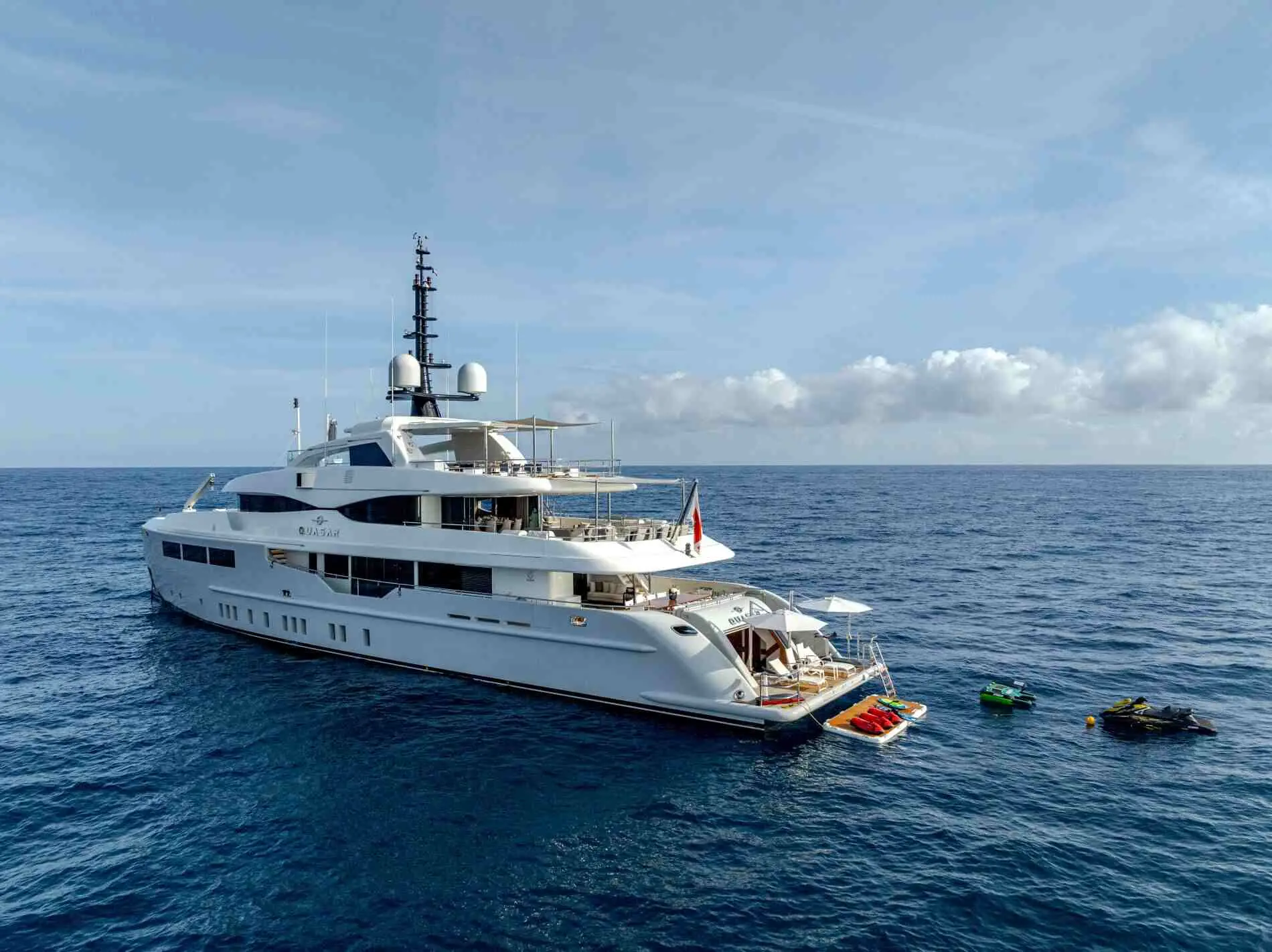 Quasar offers luxurious accommodations for up to 12 guests in six versatile cabins. Quasar is equipped with a variety of water toys and entertainment options to enhance the onboard experience. Repainted and outfitted with a new engine in 2024, ideal for shore excursions and towing water toys. Quasar is designed for both comfort and adventure, offering luxurious onboard amenities.