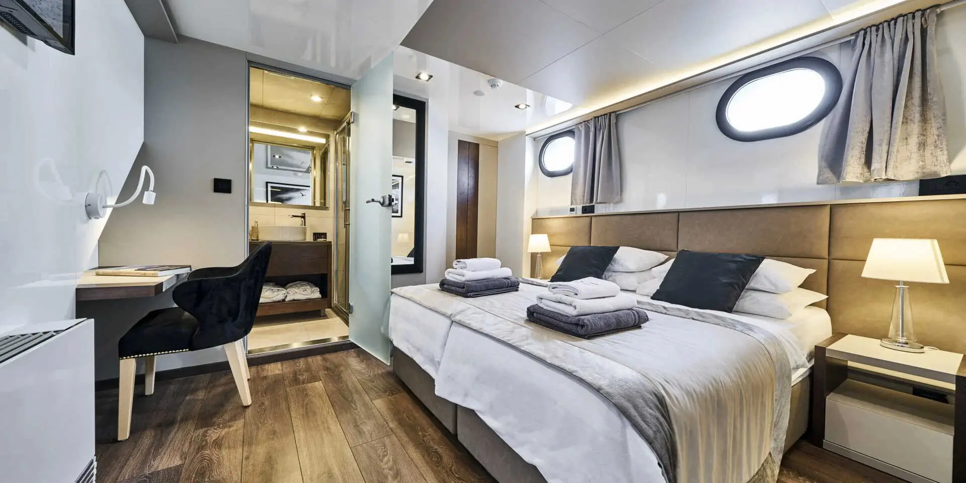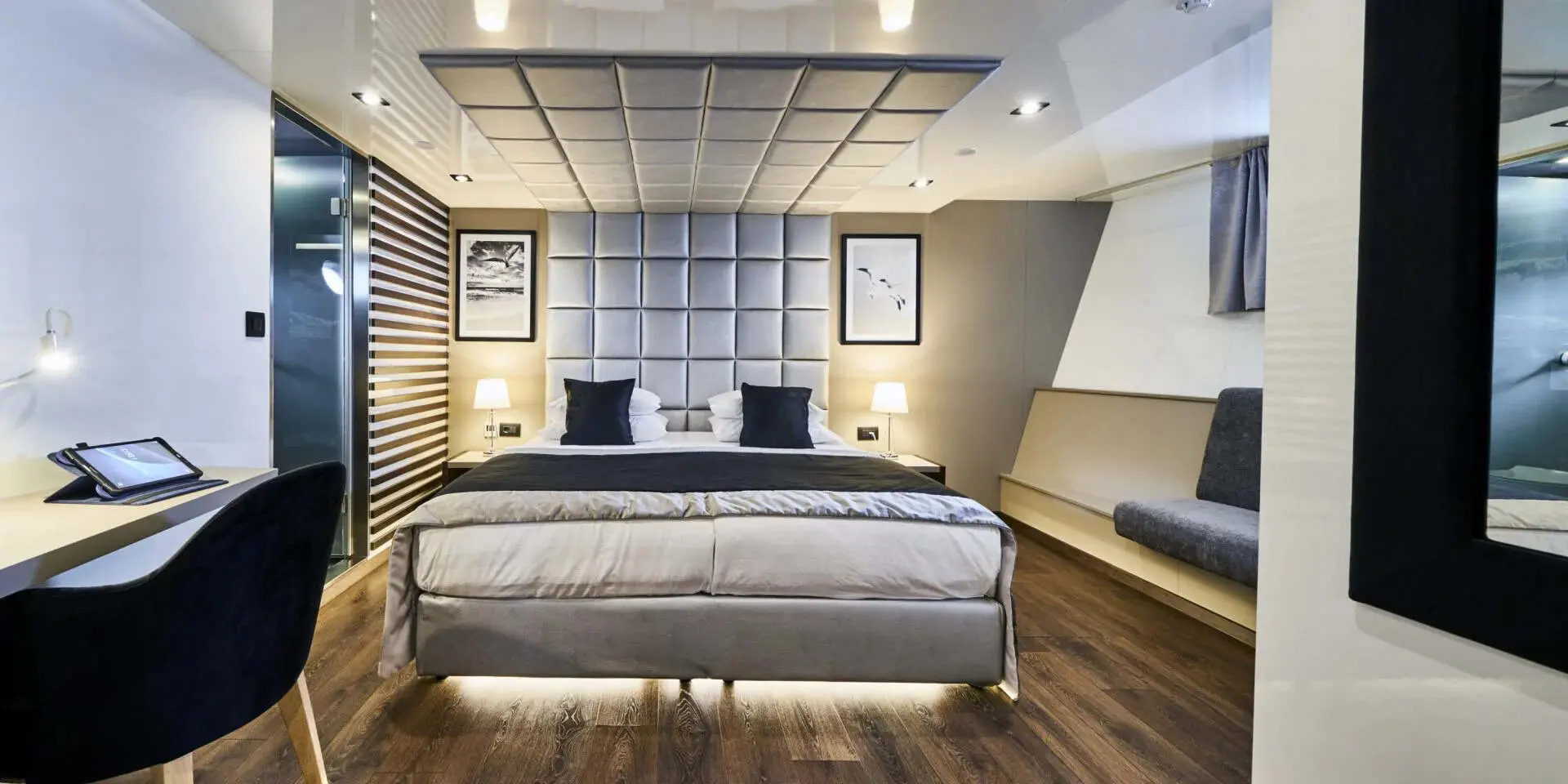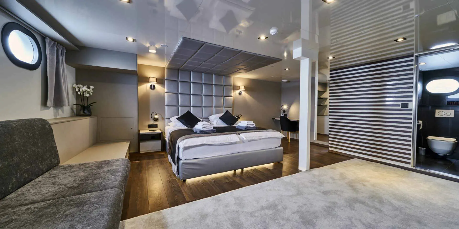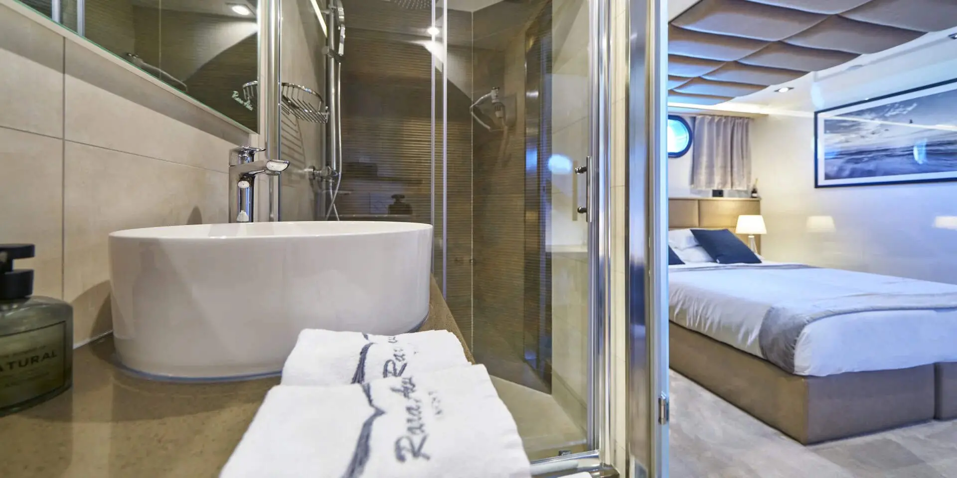 The Master Suite and VIP Cabin are generously spacious, each offering plush bedding, ample storage, and en-suite bathrooms with refined finishes. Large windows flood the rooms with natural light and offer stunning sea views. There are two double cabins and two twin cabins—perfect for couples or families. Every area of Rara Avis is thoughtfully designed to elevate your onboard experience.